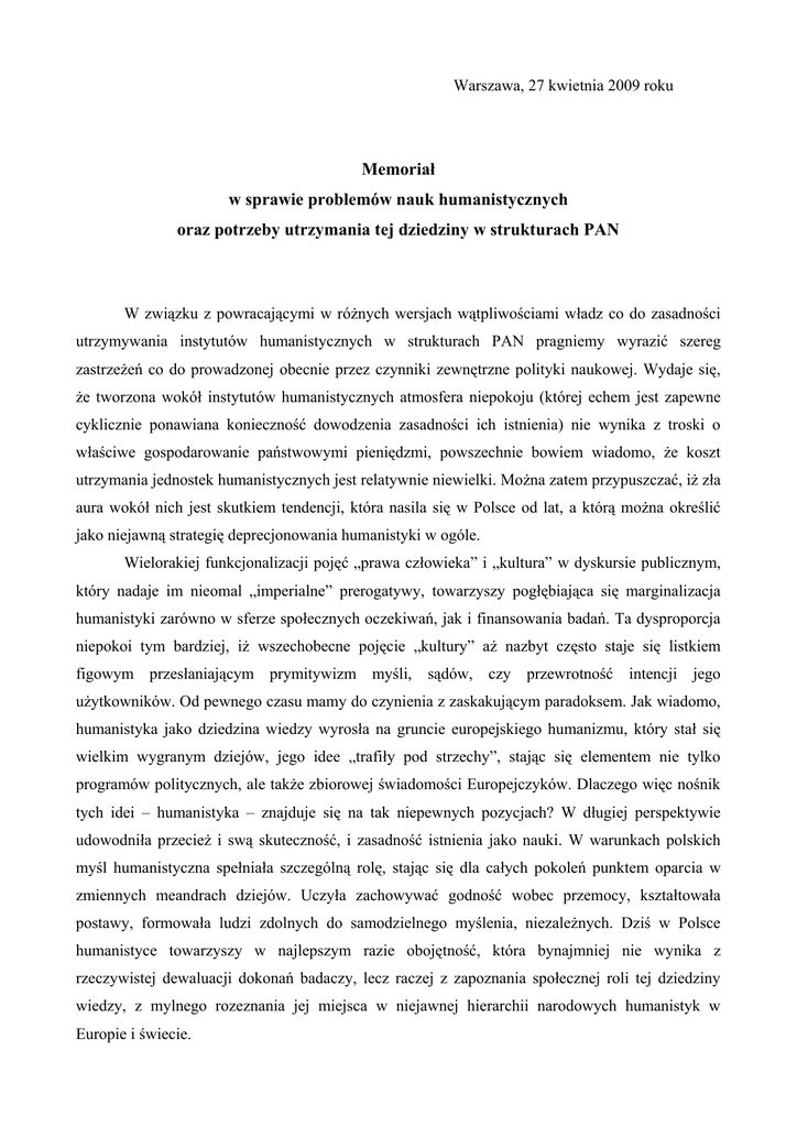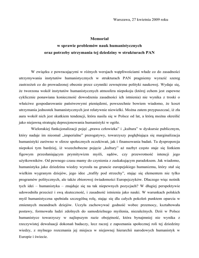 Warszawa, 27 kwietnia 2009 roku Memoriał w sprawie problemów nauk humanistycznych oraz potrzeby utrzymania tej dziedziny w strukturach PAN W związku z powracającymi w różnych wersjach wątpliwościami władz co do zasadności utrzymywania instytutów humanistycznych w strukturach PAN pragniemy wyrazić szereg zastrzeżeń co do prowadzonej obecnie przez czynniki zewnętrzne polityki naukowej. Wydaje się, że tworzona wokół instytutów humanistycznych atmosfera niepokoju (której echem jest zapewne cyklicznie ponawiana konieczność dowodzenia zasadności ich istnienia) nie wynika z troski o właściwe gospodarowanie państwowymi pieniędzmi, powszechnie bowiem wiadomo, że koszt utrzymania jednostek humanistycznych jest relatywnie niewielki. Można zatem przypuszczać, iż zła aura wokół nich jest skutkiem tendencji, która nasila się w Polsce od lat, a którą można określić jako niejawną strategię deprecjonowania humanistyki w ogóle. Wielorakiej funkcjonalizacji pojęć „prawa człowieka” i „kultura” w dyskursie publicznym, który nadaje im nieomal „imperialne” prerogatywy, towarzyszy pogłębiająca się marginalizacja humanistyki zarówno w sferze społecznych oczekiwań, jak i finansowania badań. Ta dysproporcja niepokoi tym bardziej, iż wszechobecne pojęcie „kultury” aż nazbyt często staje się listkiem figowym przesłaniającym prymitywizm myśli, sądów, czy przewrotność intencji jego użytkowników. Od pewnego czasu mamy do czynienia z zaskakującym paradoksem. Jak wiadomo, humanistyka jako dziedzina wiedzy wyrosła na gruncie europejskiego humanizmu, który stał się wielkim wygranym dziejów, jego idee „trafiły pod strzechy”, stając się elementem nie tylko programów politycznych, ale także zbiorowej świadomości Europejczyków. Dlaczego więc nośnik tych idei – humanistyka – znajduje się na tak niepewnych pozycjach? W długiej perspektywie udowodniła przecież i swą skuteczność, i zasadność istnienia jako nauki. W warunkach polskich myśl humanistyczna spełniała szczególną rolę, stając się dla całych pokoleń punktem oparcia w zmiennych meandrach dziejów. Uczyła zachowywać godność wobec przemocy, kształtowała postawy, formowała ludzi zdolnych do samodzielnego myślenia, niezależnych. Dziś w Polsce humanistyce towarzyszy w najlepszym razie obojętność, która bynajmniej nie wynika z rzeczywistej dewaluacji dokonań badaczy, lecz raczej z zapoznania społecznej roli tej dziedziny wiedzy, z mylnego rozeznania jej miejsca w niejawnej hierarchii narodowych humanistyk w Europie i świecie. O tym, że humanistyka może rozwijać się w każdych warunkach, w naszej części Europy wiemy bardzo dobrze. Jednak, aby jej głos był słyszalny, konieczna jest ofiarność albo ze strony misjonarzy-ascetów albo wsparcie hojnych mecenasów. Żyjemy dziś, na szczęście, w czasach postheroicznych, musimy więc liczyć na tych ostatnich. Tymczasem trudno powstrzymać się od refleksji, iż w kontekście licznych grzechów zaniechania ze strony dotychczasowego mecenasa polskiej humanistyki, jego karcący głos brzmi lekceważąco. Być może nastała więc pora, by humaniści przestali przybierać postawę defensywną, udowadniając raz po raz pożytki płynące z ich badań, lecz by dobitnie wyartykułowali, iż wyraźnie widzą skierowane przeciwko ich dziedzinie systemowe działania. Wypada zatem stwierdzić, że: – Zła atmosfera wokół instytutów humanistycznych szkodzi nauce polskiej, destabilizuje pracę, która od dawna przebiega w trudnych warunkach, przy niskich płacach i nie byłaby możliwa bez ofiarności wiernych etosowi inteligenckiemu uczonych należących do różnych pokoleń. – Zła atmosfera wokół osób zatrudnionych na dwóch etatach niczemu nie służy; tajemnicą poliszynela jest, iż zatrudnienie na dwóch etatach najczęściej jest ze względów ekonomicznych życiową koniecznością i niejednokrotnie okazuje się jedyną szansą na pozostanie w zawodzie. Nikt nie ma prawa żądać od uczonych, by żyli w biedzie. Oskarżenia pracowników zatrudnionych na więcej niż jednym etacie o brak etyki zawodowej jest słuszne w przypadku osób obsadzających niezliczone (i z konieczności fikcyjne) miejsca pracy. Takie wypadki należą już jednak do przeszłości. Obecnie uczeni zatrudniani na dwóch etatach najczęściej należą do grupy o najwyższych kwalifikacjach i należycie wywiązują się ze swoich zobowiązań w obu miejscach pracy. W efekcie nauka polska nie tylko, że na tym nie cierpi, lecz zyskuje: uczelnie mają dodatkowe, doskonale wykwalifikowane kadry, a do instytutów PAN-owskich napływają młodzi adepci nauki. Przeciążeni są natomiast sami pracownicy i niezmiennie deklarują gotowość zrezygnowania z dodatkowego etatu w chwili podniesienia uposażeń w PAN, o co bezskutecznie zabiegamy od wielu lat. – Zła atmosfera wokół instytutów nabiera szczególnej wymowy w odniesieniu do niskiej skuteczności w zdobywaniu grantów europejskich. Tymczasem nie zostały stworzone sprawne struktury, które pomagałyby uczonym w zdobywaniu tychże grantów. Dotychczas działające struktury mają charakter wyłącznie formalny. – Kwestia niewystarczającej obecności polskiej humanistyki poza granicami kraju to nie wina uczonych i ich „prowincjonalizmu”, lecz braku państwowego programu promocji polskiej humanistyki. Dorobek polskiej humanistyki należy wykorzystywać zarówno w obrębie UE, gdzie powinien być doceniony i przydatny, jak również poza obszarem UE. Ale do tego są potrzebne subwencje na przekłady, które pozwolą zaistnieć humanistyce polskiej na forum międzynarodowym (np. można sfinansować przekład na język rosyjski poważnych prac historycznych na temat Katynia). Do zadań krajowych decydentów powinna należeć odpowiednia promocja, prowadzona w ramach np. programów translatorycznych, jak ten, który swego czasu realizowała Fundacj