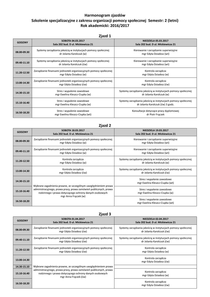 Harmonogram zjazdów Szkolenie specjalizacyjne z zakresu organizacji pomocy społecznej Semestr: 2 (letni) Rok akademicki: 2016/2017 Zjazd 1 GODZINY SOBOTA 04.03.2017 Sala 202 bud. D ul. Mickiewicza 21 NIEDZIELA 05.03.2017 Sala 202 bud. D ul. Mickiewicza 21 08.00-09.30 Systemy zarządzania jakością w instytucjach pomocy społecznej dr Jolanta Karolczuk (w) Kierowanie i zarządzanie superwizyjne mgr Edyta Dziadosz (wt) 09.40-11.10 Systemy zarządzania jakością w instytucjach pomocy społecznej dr Jolanta Karolczuk (ćw) Kierowanie i zarządzanie superwizyjne mgr Edyta Dziadosz (wt) 11.20-12.50 Zarządzanie finansami jednostek organizacyjnych pomocy społecznej mgr Edyta Dziadosz (w) Kontrola zarządcza mgr Edyta Dziadosz (w) 13.00-14.30 Zarządzanie finansami jednostek organizacyjnych pomocy społecznej mgr Edyta Dziadosz (ćw) Kontrola zarządcza mgr Edyta Dziadosz (ćw) 14.30-15.10 Stres i wypalenie zawodowe mgr Ewelina Kleszcz-Ciupka (w) Systemy zarządzania jakością w instytucjach pomocy społecznej dr Jolanta Karolczuk (w) 15.10-16.40 Stres i wypalenie zawodowe mgr Ewelina Kleszcz-Ciupka (w) Systemy zarządzania jakością w instytucjach pomocy społecznej dr Jolanta Karolczuk (ćw) 3 godz. 16.50-18.20 Stres i wypalenie zawodowe mgr Ewelina Kleszcz-Ciupka (wt) Konsultacje dotyczące pracy dyplomowej dr Piotr Frączek Zjazd 2 GODZINY SOBOTA 18.03.2017 Sala 202 bud. D ul. Mickiewicza 21 NIEDZIELA 19.03.2017 Sala 202 bud. D ul. Mickiewicza 21 08.00-09.30 Zarządzanie finansami jednostek organizacyjnych pomocy społecznej mgr Edyta Dziadosz (w) Kierowanie i zarządzanie superwizyjne mgr Edyta Dziadosz (wt) 09.40-11.10 Zarządzanie finansami jednostek organizacyjnych pomocy społecznej mgr Edyta Dziadosz (w) Kierowanie i zarządzanie superwizyjne mgr Edyta Dziadosz (wt) 11.20-12.50 Kontrola zarządcza mgr Edyta Dziadosz (w) Systemy zarządzania jakością w instytucjach pomocy społecznej dr Jolanta Karolczuk (w) 13.00-14.30 Kontrola zarządcza mgr Edyta Dziadosz (ćw) Systemy zarządzania jakością w instytucjach pomocy społecznej dr Jolanta Karolczuk (ćw) Stres i wypalenie zawodowe mgr Ewelina Kleszcz-Ciupka (wt) 14.30-15.10 15.10-16.40 Wybrane zagadnienia prawne, ze szczególnym uwzględnieniem prawa administracyjnego, prawa pracy, prawa zamówień publicznych, prawa rodzinnego i prawa dotyczącego ochrony danych osobowych mgr Anna Frączek (w) Stres i wypalenie zawodowe mgr Ewelina Kleszcz-Ciupka (w) Stres i wypalenie zawodowe mgr Ewelina Kleszcz-Ciupka (wt) 16.50-18.20 Zjazd 3 GODZINY SOBOTA 01.04.2017 Sala 202 bud. D ul. Mickiewicza 21 NIEDZIELA 02.04.2017 Sala 202 bud. D ul. Mickiewicza 21 08.00-09.30 Zarządzanie finansami jednostek organizacyjnych pomocy społecznej mgr Edyta Dziadosz (ćw) Systemy zarządzania jakością w instytucjach pomocy społecznej dr Jolanta Karolczuk (ćw) 09.40-11.10 Zarządzanie finansami jednostek organizacyjnych pomocy społecznej mgr Edyta Dziadosz (ćw) Systemy zarządzania jakością w instytucjach pomocy społecznej dr Jolanta Karolczuk (ćw) 11.20-12.50 Zarządzanie finansami jednostek organizacyjnych pomocy społecznej mgr Edyta Dziadosz (ćw) Kontrola zarządcza mgr Edyta Dziadosz (w) Kontrola zarządcza mgr Edyta Dziadosz (ćw) 13.00-14.30 14.30-15.10 15.10-16.40 16.50-18.20 Wybrane zagadnienia prawne, ze szczególnym uwzględnieniem prawa administracyjnego, prawa pracy, prawa zamówień publicznych, prawa rodzinnego i prawa dotyczącego ochrony danych osobowych mgr Anna Frączek (ćw) Kontrola zarządcza mgr Edyta Dziadosz (w) Kontrola zarządcza mgr Edyta Dziadosz (ćw) Zjazd 4 GODZINY SOBOTA 13.05.2017 Sala 202 bud. D ul. Mickiewicza 21 08.00-09.30 Zarządzanie finansami jednostek organizacyjnych pomocy społecznej mgr Edyta Dziadosz (ćw) 09.40-11.10 Kontrola zarządcza mgr Edyta Dziadosz (ćw) 11.20-12.50 Wybrane zagadnienia prawne, ze szczególnym uwzględnieniem prawa administracyjnego, prawa pracy, prawa zamówień publicznych, prawa rodzinnego i prawa dotyczącego ochrony danych osobowych mgr Anna Frączek (ćw) 13.00-14.30 14.30-15.10 15.10-16.40 16.50-18.20 NIEDZIELA 14.05.2017 Sala 202 bud. D ul. Mickiewicza 21 Wybrane zagadnienia prawne, ze szczególnym uwzględnieniem prawa administracyjnego, prawa pracy, prawa zamówień publicznych, prawa rodzinnego i prawa dotyczącego ochrony danych osobowych mgr Anna Frączek (w) Wybrane zagadnienia prawne, ze szczególnym uwzględnieniem prawa administracyjnego, prawa pracy, prawa zamówień publicznych, prawa rodzinnego i prawa dotyczącego ochrony danych osobowych mgr Anna Frączek (ćw) Wybrane zagadnienia prawne, ze szczególnym uwzględnieniem prawa administracyjnego, prawa pracy, prawa zamówień publicznych, prawa rodzinnego i prawa dotyczącego ochrony danych osobowych mgr Anna Frączek (w) Konsultacje dotyczące pracy dyplomowej dr Piotr Frączek Zjazd 5 GODZINY 08.00-09.30 09.40-11.10 11.20-12.50 13.00-14.30 SOBOTA 27.05.2017 Sala 202 bud. D ul. Mickiewicza 21 Od 8,50 Wybrane zagadnienia z zakresu przepisów dotyczących pomocy społecznej i zabezpieczenia społecznego mgr Anna Frączek (w) Wybrane zagadnienia z zakresu przepisów dotyczących pomocy społecznej i zabezpieczenia społecznego mgr Anna Frączek (ćw) Wybrane zagadnienia z zakresu przepisów dotyczących pomocy społecznej i zabezpieczenia społecznego mgr Anna Frączek (ćw) NIEDZIELA 28.05.2017 Sala 202 bud. D ul. Mickiewicza 21 Wybrane zagadnienia z zakresu przepisów dotyczących pomocy społecznej i zabezpieczenia społecznego mgr Anna Frączek (w) Wybrane zagadnienia z zakresu przepisów dotyczących pomocy społecznej i zabezpieczenia społecznego mgr Anna Frączek (ćw) Wybrane zagadnienia z zakresu przepisów dotyczących pomocy społecznej i zabezpieczenia społecznego mgr Anna Frączek (ćw) Konsultacje dotyczące pracy dyplomowej dr Piotr Frączek 14.30-15.10 15.10-16.40 Konsultacje dotyczące pracy dyplomowej dr Piotr Frączek Zjazd 6 GODZINY SOBOTA 10.06.2017 Sala 202 bud. D ul. Mickiewicza 21