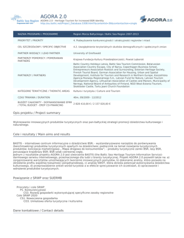 AGORA 2.0 AGORA 2.0 - Heritage Tourism for increased BSR Identity http://eu.baltic.net/Project_Database.5308.html?&contentid=36&contentaction=single NAZWA PROGRAMU / PROGRAMME Region Morza Bałtyckiego / Baltic Sea Region 2007-2013 PRIORYTET / PRIORITY 4. Podwyższenie konkurencyjności i atrakcyjności regionów i miast CEL SZCZEGÓŁOWY / SPECIFIC OBJECTIVE 4.2. Uwzględnienie terytorialnych skutków demograficznych i społecznych zmian PARTNER WIODĄCY / LEAD PARTNER University of Greifswald PARTNERZY POMORSCY / POMERANIAN PARTNERS Krajowa Fundacja Kultury Przedsiębiorczości, Powiat Lęborski PARTNERZY / PARTNERS Baltic Country Holidays Latvia, Baltic Sea Tourism Commission, Belarussian Association Country Escape, City of Narva, Copenhagen Business School, Entrepreneurs Association Rostock and Surrounding, Estonian Heritage Society, Finnish Tourist Board, German Association for Housing, Urban and Spatial Development, Institute for Tourism and Research in Northern Europe, Koszalińska Agencja Rozwoju Regionalnego S.A., Latvian Fund for Nature, Latvian Tourism Development Agency, Lithuanian Association of Castles and Manors, Municipality of Neringa, National Board of Antiquities of Finland, NGO West-Estonia Tourism, Skokloster Castle, Tartu Jaani Church Foundation KATEGORIE TEMATYCZNE / THEMATIC AREAS Kultura i turystyka / Culture and Tourism CZAS TRWANIA / DURATION 40m, 09/2009 - 12/2012 BUDŻET CAŁKOWITY - DOFINANSOWANIE EFRR 2 828 410,00 € / 2 157 020,00 € / TOTAL BUDGET - ERDF CO-FINANCING Opis projektu / Project summary Wykreowanie innowacyjnych produktów turystycznych oraz pan-bałtyckiej strategii promocji dziedzictwa kulturowego i naturalnego. Cele i rezultaty / Main aims and results BASTIS – internetowe centrum informacyjne o dziedzictwie BSR; - wystandaryzowane narzędzie do porównywania (benchmaeking) produktów turystycznych opartych na dziedzictwie; podręcznik na temat rozwijania turystycznych produktów; koncepcja marketingowa „ Mapa drogowa do konsumentów”; - produkty turystyczne zamki BSR, lasy BSR, poruszające krajobrazy BSR; BSR szlak czerwonej cegły. Jednym z rezultatów projektu AGORA 2.0 jest stworzenie BASTIS (the Baltic Sea Heritage Tourism Information Service)darmowego serwisu internetowego, przeznaczonego dla ludzi z branży turystycznej. Projekt AGORA 2.0 pozwolił także na: a) zorganizowanie warsztatów umożliwiających tworzenie innowacyjnych pomysłów, b) dokonanie analizy, która pozwala na określenie profilu wspólnej tożsamości ponadnarodowej, c) analizę SWOT, która określa potencjał wykorzystania dziedzictwa kulturowego, d) przeprowadzenie ankiet wśród turystów a w efekcie sprecyzowanie ich oczekiwań, e) opracowanie i wdrożenie produktów turystycznych. Powiązanie z SRWP oraz SUERMB Priorytety i cele SRWP P1. Konkurencyjność CS3. Rozwój gospodarki wykorzystującej specyficzne zasoby regionalne Cele SRWP 2020 CS1. Nowoczesna gospodarka CO3. Unikatowa oferta turystyczna i kulturalna Dane kontaktowe / Contact details University of Greifswald (partner wiodący / Lead Partner) Wilhelm Steingrube Makarenkostrasse 22, 17487 Greifswald tel.: +49 383 486 454 0 e-mail: [email protected] http://www.wisogeo.eu/ Krajowa Fundacja Kultury Przedsiębiorczości (partner pomorski / Pomeranian partner) Przemyslaw Kulawczuk Okrężna 11a, 81-601 Gdynia tel.: +48 586 214 645 e-mail: [email protected] Powiat Lęborski (partner pomorski / Pomeranian partner) Teresa Ossowska-Szara Czołgistów 5, 84-300 Lębork tel.: +48 598 632 825 e-mail: [email protected] http://www.powiat-lebork.com/