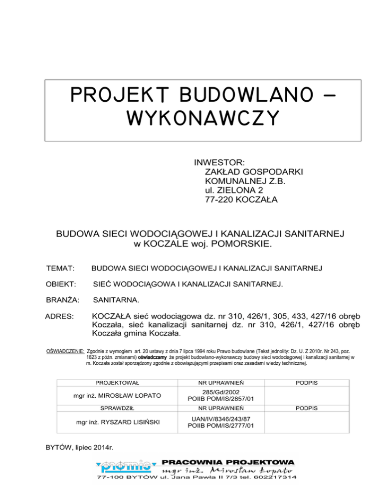 PROJEKT BUDOWLANO ˘ WYKONAWCZY INWESTOR: ZAKŁAD GOSPODARKI KOMUNALNEJ Z.B. ul. ZIELONA 2 77-220 KOCZAŁA BUDOWA SIECI WODOCIĄGOWEJ I KANALIZACJI SANITARNEJ w KOCZALE woj. POMORSKIE. TEMAT: BUDOWA SIECI WODOCIĄGOWEJ I KANALIZACJI SANITARNEJ OBIEKT: SIEĆ WODOCIĄGOWA I KANALIZACJI SANITARNEJ. BRANŻA: SANITARNA. ADRES: KOCZAŁA sieć wodociągowa dz. nr 310, 426/1, 305, 433, 427/16 obręb Koczała, sieć kanalizacji sanitarnej dz. nr 310, 426/1, 427/16 obręb Koczała gmina Koczała. OŚWIADCZENIE: Zgodnie z wymogiem art. 20 ustawy z dnia 7 lipca 1994 roku Prawo budowlane (Tekst jednolity: Dz. U. Z 2010r. Nr 243, poz. 1623 z późn. zmianami) oświadczamy że projekt budowlano-wykonawczy budowy sieci wodociągowej i kanalizacji sanitarnej w m. Koczała został sporządzony zgodnie z obowiązującymi przepisami oraz zasadami wiedzy technicznej. PROJEKTOWAŁ NR UPRAWNIEŃ mgr inż. MIROSŁAW ŁOPATO 285/Gd/2002 POIIB POM/IS/2857/01 SPRAWDZIŁ NR UPRAWNIEŃ mgr inż. RYSZARD LISIŃSKI UAN/IV/8346/243/87 POIIB POM/IS/2777/01 BYTÓW, lipiec 2014r. PODPIS PODPIS SPIS TREŚCI I. OPIS DO PROJEKTU ZAGOSPODAROWANIA TERENU. 1.0. Podstawa opracowania. 2.0. Cel i zakres opracowania. 3.0. Istniejący stan zagospodarowania terenu. 4.0. Projektowane zagospodarowanie terenu. 5.0. Zakres i zasięg oddziaływania inwestycji. 6.0. Ochrona konserwatorska zabytków. 7.0. Charakterystyka uzbrojenia w odniesieniu do obowiązujących przepisów dot. ochrony środowiska i warunków MPZP. 8.0. Dane dotyczące wpływu eksploatacji górniczej na działkę lub teren. 9.0. Informacja o zagrożeniu dla środowiska oraz higieny i zdrowia użytkowników. 10.0. Inne dane dotyczące obiektu. II. OPIS TECHNICZNY DO PROJEKTU BUDOWLANO - WYKONAWCZEGO BUDOWY SIECI WODOCIĄGOWEJ I KANALIZACJI SANITARNEJ. 1.0. Zakres rzeczowy inwestycji. 2.0. Wodociąg rozdzielczy. 3.0. Kanalizacja sanitarna. 4.0. Skrzyżowania projektowanych sieci z istn. Uzbrojeniem. 5.0. Roboty ziemne i montażowe. 6.0. Oddziaływanie obiektu na środowisko. 7.0. Opinia geotechniczna – geotechniczne warunki posadowienia obiektu budowlanego. 8.0. Uwagi dla wykonawcy. 9.0. Uwagi dla inwestora. 10.0. Informacja do Planu Bezpieczeństwa i Ochrony Zdrowia. III. ZAŁĄCZNIKI. 1. 2. 3. 4. 5. 6. Wypis i wyrys MPZP. Warunki techniczne Zakładu Gospodarki Komunalnej w Koczale Opinia ZUD w Człuchowie. Decyzja Gminy Koczała nr GPiB.6853.8.2014.EK z dnia 22.07.2014r. Decyzja Zarządu Powiatu Człuchowskiego nr IN.7130.2.27.2014 z dnia 09.07.2014 kopie uprawnień projektanta i sprawdzającego. IV. INFORMACJA BIOZ. V. CZĘŚĆ RYSUNKOWA. Rys. 1, 2 Rys. 3, 4, 5 Rys. 6, 7, 8, 9 Rys. 10 - Projekt zagospodarowania terenu w skali 1 :500 - Profile podłużne wodociągu skala 1:100/500 - Profile podłużne kanalizacji sanitarnej skala 1:100/500 - Rysunek roboczy bloku oporowego. Budowa sieci wodociągowej i kanalizacji sanitarnej w Koczale Bytów lipiec.2014r. I. OPIS DO PROJEKTU ZAGOSPODAROWANIA TERENU. 1.0. Podstawa opracowania: 1.1. Zlecenie Inwestora. 1.2. Mapa zasadnicza sytuacyjno-wysokościowa terenu w skali 1:500. 1.3. Ustalenia Miejscowego Planu Zagospodarowania Przestrzennego miejscowości Koczała zgodnie z Uchwałą Rady Gminy Koczała nr XLV/274/2006 z dnia 10.08.2006r. /Dz. Urz. Województwa Pomorskiego nr 103 poz. 1652 z dn. 31.05.2007r./ 1.4. Uzgodnienia branżowe i ZUD. 1.5. Decyzja Zarządu Powiatu Człuchowskiego nr IN.7130.2.27.2014 z dnia 09.07.2014r. 1.6. Decyzja Gminy Koczała nr GPiB.6853.8.2014.EK z dnia 22.07.2014r. 1.7. Warunki techniczne Zakład Gospodarki Komunalnej w Koczale. 1.8. Obowiązujące przepisy i normy tematycznie zawiązane. 2.0. Cel i zakres opracowania. Celem projektu jest przedstawienie rozwiązania technicznego budowy sieci wodociągowej i kanalizacji sanitarnej na terenie osiedla mieszkalnego obejmującego zespół działek nr 310, 426/1, 305, 433, 427/16 w obrębie geodezyjnym Koczała w gminie Koczała. Zakres opracowania obejmuje określenie tras, średnic i zagłębienia projektowanej budowy sieci wodociągowej i kanalizacji sanitarnej w pasie drogi gminnej (dz. nr 310), oraz podłączenia do istniejącego układu sieci wodociągowej i kanalizacji sanitarnej. 3.0. Istniejący stan zagospodarowania terenu. Istniejący stan zagospodarowania terenu przedstawiony został na mapie do celów projektowych opracowanej w skali 1:500. W obszarze opracowania występuje następujące uzbrojenie podziemne: • sieć kablowa i napowietrzna energetyczna niskiego napięcia, • istniejąca sieć wodociągowa, • istniejąca sieć kanalizacji sanitarnej, • sieć telekomunikacyjna, Istniejąca droga występująca w zakresie projektowanej budowy sieci wodociągowej i kanalizacji sanitarnej jest o nawierzchni gruntowej z wyjątkiem przejścia pod drogą powiatową (dz. nr 305) o nawierzchni asfaltowej. W obszarze opracowania trasy projektowanej budowy sieci wodociągowej i kanalizacji sanitarnej nie wyklucza się istnienia niezinwentaryzowanego uzbrojenia podziemnego. Istniejące ukształtowanie terenu umożliwia grawitacyjne skanalizowanie obszaru zespołu działek osiedla mieszkalnego w Koczale. Rzędne ukształtowania terenu w obszarze opracowania zawierają się pomiędzy 172,30-152,06 m n.p.m. Teren objęty opracowaniem zajmuje obszar zabudowy mieszkalnej jednorodzinnej zlokalizowanej w rejonie osiedla obejmujący zespół działek 127, 427 oraz 426 w Koczale. Budowa sieci wodociągowej i kanalizacji sanitarnej w Koczale Bytów lipiec.2014r. 4.0. Projektowane zagospodarowanie terenu. W obszarze opracowania istniejąca sieć wodociągowa i kanalizacja sanitarna zlokalizowana jest w drodze oznaczonej numerem działki 310 będącej własnością Gminy Koczała oraz istn. wodociąg PCV d=110mm w działce prywatnej nr 433. obręb Koczała. W związku z tym, dla umożliwienia zaopatrzenia mieszkańców w wodę oraz odprowadzenia ścieków bytowych, zaprojektowano sieć wodociągową i kanalizacji sanitarnej wraz z przyłączami w oparciu o is