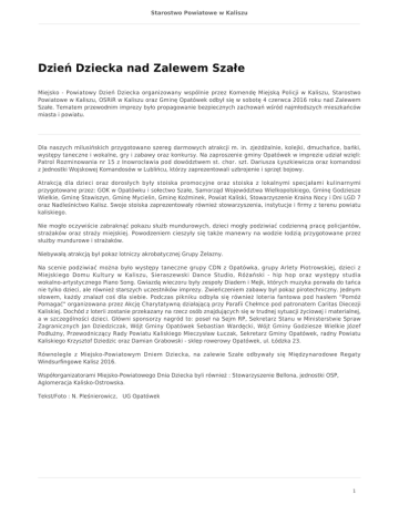 Starostwo Powiatowe w Kaliszu Dzień Dziecka nad Zalewem Szałe Miejsko - Powiatowy Dzień Dziecka organizowany wspólnie przez Komendę Miejską Policji w Kaliszu, Starostwo Powiatowe w Kaliszu, OSRiR w Kaliszu oraz Gminę Opatówek odbył się w sobotę 4 czerwca 2016 roku nad Zalewem Szałe. Tematem przewodnim imprezy było propagowanie bezpiecznych zachowań wśród najmłodszych mieszkańców miasta i powiatu. Dla naszych milusińskich przygotowano szereg darmowych atrakcji m. in. zjeżdżalnie, kolejki, dmuchańce, bańki, występy taneczne i wokalne, gry i zabawy oraz konkursy. Na zaproszenie gminy Opatówek w imprezie udział wzięli: Patrol Rozminowania nr 15 z Inowrocławia pod dowództwem st. chor. szt. Dariusza Łyszkiewicza oraz komandosi z Jednostki Wojskowej Komandosów w Lublińcu, którzy zaprezentowali uzbrojenie i sprzęt bojowy. Atrakcją dla dzieci oraz dorosłych były stoiska promocyjne oraz stoiska z lokalnymi specjałami kulinarnymi przygotowane przez: GOK w Opatówku i sołectwo Szałe, Samorząd Województwa Wielkopolskiego, Gminę Godziesze Wielkie, Gminę Stawiszyn, Gminę Mycielin, Gminę Koźminek, Powiat Kaliski, Stowarzyszenie Kraina Nocy i Dni LGD 7 oraz Nadleśnictwo Kalisz. Swoje stoiska zaprezentowały również stowarzyszenia, instytucje i firmy z terenu powiatu kaliskiego. Nie mogło oczywiście zabraknąć pokazu służb mundurowych, dzieci mogły podziwiać codzienną pracę policjantów, strażaków oraz straży miejskiej. Powodzeniem cieszyły się także manewry na wodzie łodzią przygotowane przez służby mundurowe i strażaków. Niebywałą atrakcją był pokaz lotniczy akrobatycznej Grupy Żelazny. Na scenie podziwiać można było występy taneczne grupy CDN z Opatówka, grupy Arlety Piotrowskiej, dzieci z Miejskiego Domu Kultury w Kaliszu, Sieraszewski Dance Studio, Różański - hip hop oraz występy studia wokalno-artystycznego Piano Song. Gwiazdą wieczoru były zespoły Diadem i Mejk, których muzyka porwała do tańca nie tylko dzieci, ale również starszych uczestników imprezy. Zwieńczeniem zabawy był pokaz pirotechniczny. Jednym słowem, każdy znalazł coś dla siebie. Podczas pikniku odbyła się również loteria fantowa pod hasłem "Pomóż Pomagać" organizowana przez Akcję Charytatywną działającą przy Parafii Chełmce pod patronatem Caritas Diecezji Kaliskiej. Dochód z loterii zostanie przekazany na rzecz osób znajdujących się w trudnej sytuacji życiowej i materialnej, a w szczególności dzieci. Główni sponsorzy nagród to: poseł na Sejm RP, Sekretarz Stanu w Ministerstwie Spraw Zagranicznych Jan Dziedziczak, Wójt Gminy Opatówek Sebastian Wardęcki, Wójt Gminy Godziesze Wielkie Józef Podłużny, Przewodniczący Rady Powiatu Kaliskiego Mieczysław Łuczak, Sekretarz Gminy Opatówek, radny Powiatu Kaliskiego Krzysztof Dziedzic oraz Damian Grabowski - sklep rowerowy Opatówek, ul. Łódzka 23. Równolegle z Miejsko-Powiatowym Dniem Dziecka, na zalewie Szałe odbywały się Międzynarodowe Regaty Windsurfingowe Kalisz 2016. Współorganizatorami Miejsko-Powiatowego Dnia Dziecka byli również : Stowarzyszenie Bellona, jednostki OSP, Aglomeracja Kalisko-Ostrowska. Tekst/Foto : N. Pleśnierowicz, UG Opatówek 1