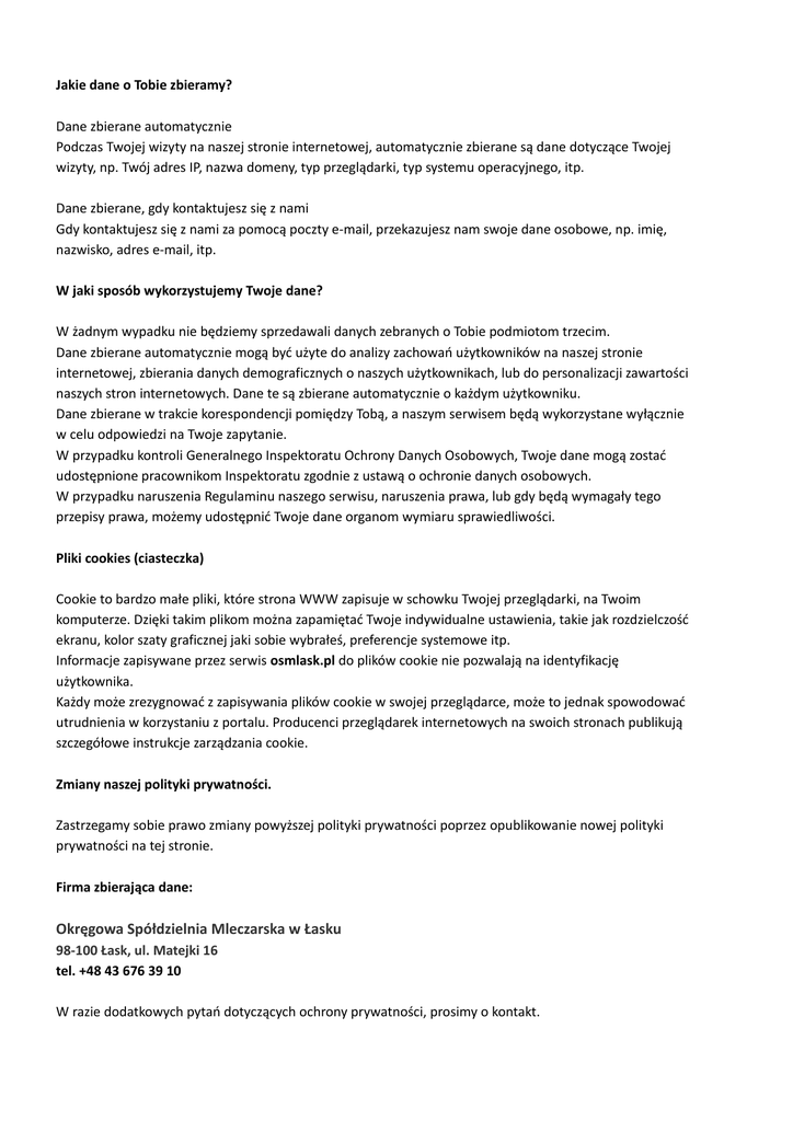 Jakie dane o Tobie zbieramy? Dane zbierane automatycznie Podczas Twojej wizyty na naszej stronie internetowej, automatycznie zbierane są dane dotyczące Twojej wizyty, np. Twój adres IP, nazwa domeny, typ przeglądarki, typ systemu operacyjnego, itp. Dane zbierane, gdy kontaktujesz się z nami Gdy kontaktujesz się z nami za pomocą poczty e-mail, przekazujesz nam swoje dane osobowe, np. imię, nazwisko, adres e-mail, itp. W jaki sposób wykorzystujemy Twoje dane? W żadnym wypadku nie będziemy sprzedawali danych zebranych o Tobie podmiotom trzecim. Dane zbierane automatycznie mogą być użyte do analizy zachowań użytkowników na naszej stronie internetowej, zbierania danych demograficznych o naszych użytkownikach, lub do personalizacji zawartości naszych stron internetowych. Dane te są zbierane automatycznie o każdym użytkowniku. Dane zbierane w trakcie korespondencji pomiędzy Tobą, a naszym serwisem będą wykorzystane wyłącznie w celu odpowiedzi na Twoje zapytanie. W przypadku kontroli Generalnego Inspektoratu Ochrony Danych Osobowych, Twoje dane mogą zostać udostępnione pracownikom Inspektoratu zgodnie z ustawą o ochronie danych osobowych. W przypadku naruszenia Regulaminu naszego serwisu, naruszenia prawa, lub gdy będą wymagały tego przepisy prawa, możemy udostępnić Twoje dane organom wymiaru sprawiedliwości. Pliki cookies (ciasteczka) Cookie to bardzo małe pliki, które strona WWW zapisuje w schowku Twojej przeglądarki, na Twoim komputerze. Dzięki takim plikom można zapamiętać Twoje indywidualne ustawienia, takie jak rozdzielczość ekranu, kolor szaty graficznej jaki sobie wybrałeś, preferencje systemowe itp. Informacje zapisywane przez serwis osmlask.pl do plików cookie nie pozwalają na identyfikację użytkownika. Każdy może zrezygnować z zapisywania plików cookie w swojej przeglądarce, może to jednak spowodować utrudnienia w korzystaniu z portalu. Producenci przeglądarek internetowych na swoich stronach publikują szczegółowe instrukcje zarządzania cookie. Zmiany naszej polityki prywatności. Zastrzegamy sobie prawo zmiany powyższej polityki prywatności poprzez opublikowanie nowej polityki prywatności na tej stronie. Firma zbierająca dane: Okręgowa Spółdzielnia Mleczarska w Łasku 98-100 Łask, ul. Matejki 16 tel. +48 43 676 39 10 W razie dodatkowych pytań dotyczących ochrony prywatności, prosimy o kontakt.