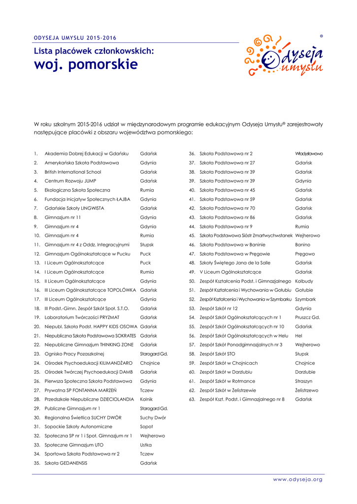 ODYSEJA UMYSŁU 2015-2016 Lista placówek członkowskich: woj. pomorskie W roku szkolnym 2015-2016 udział w międzynarodowym programie edukacyjnym Odyseja Umysłu® zarejestrowały następujące placówki z obszaru województwa pomorskiego: 1. Akademia Dobrej Edukacji w Gdańsku Gdańsk 36. Szkoła Podstawowa nr 2 Władysławowo 2. Amerykańska Szkoła Podstawowa Gdynia 37. Szkoła Podstawowa nr 27 Gdańsk 3. British International School Gdańsk 38. Szkoła Podstawowa nr 39 Gdańsk 4. Centrum Rozwoju JUMP Gdańsk 39. Szkoła Podstawowa nr 39 Gdynia 5. Ekologiczna Szkoła Społeczna Rumia 40. Szkoła Podstawowa nr 45 Gdańsk 6. Fundacja Inicjatyw Społecznych ŁAJBA Gdynia 41. Szkoła Podstawowa nr 59 Gdańsk 7. Gdańskie Szkoły LINGWISTA Gdańsk 42. Szkoła Podstawowa nr 70 Gdańsk 8. Gimnazjum nr 11 Gdynia 43. Szkoła Podstawowa nr 86 Gdańsk 9. Gimnazjum nr 4 Gdynia 44. Szkoła Podstawowa nr 9 Rumia 10. Gimnazjum nr 4 Rumia 45. Szkoła Podstawowa Sióstr Zmartwychwstanek Wejherowo 11. Gimnazjum nr 4 z Oddz. Integracyjnymi Słupsk 46. Szkoła Podstawowa w Baninie Banino 12. Gimnazjum Ogólnokształcące w Pucku Puck 47. Szkoła Podstawowa w Pręgowie Pręgowo 13. I Liceum Ogólnokształcące Puck 48. Szkoły Świętego Jana de la Salle Gdańsk 14. I Liceum Ogólnokształcące Rumia 49. V Liceum Ogólnokształcące Gdańsk 15. II Liceum Ogólnokształcące Gdynia 50. Zespół Kształcenia Podst. i Gimnazjalnego Kolbudy 16. III Liceum Ogólnokształcące TOPOLÓWKA Gdańsk 51. Zespół Kształcenia i Wychowania w Gołubiu Gołubie 17. III Liceum Ogólnokształcące Gdynia 52. Zespół Kształcenia i Wychowania w Szymbarku Szymbark 18. III Podst.-Gimn. Zespół Szkół Społ. S.T.O. Gdańsk 53. Zespół Szkół nr 12 Gdynia 19. Laboratorium Twórczości PRYZMAT Gdańsk 54. Zespół Szkół Ogólnokształcących nr 1 Pruszcz Gd. 20. Niepubl. Szkoła Podst. HAPPY KIDS OSOWA Gdańsk 55. Zespół Szkół Ogólnokształcących nr 10 Gdańsk 21. Niepubliczna Szkoła Podstawowa SOKRATES Gdańsk 56. Zespół Szkół Ogólnokształcących w Helu Hel 22. Niepubliczne Gimnazjum THINKING ZONE Gdańsk 57. Zespół Szkół Ponadgimnazjalnych nr 3 Wejherowo 23. Ognisko Pracy Pozaszkolnej Starogard Gd. 58. Zespół Szkół STO Słupsk 24. Ośrodek Psychoedukacji KILIMANDŻARO Chojnice 59. Zespół Szkół w Chojnicach Chojnice 25. Ośrodek Twórczej Psychoedukacji DAMB Gdańsk 60. Zespół Szkół w Darzlubiu Darzlubie 26. Pierwsza Społeczna Szkoła Podstawowa Gdynia 61. Zespół Szkół w Rotmance Straszyn 27. Prywatna SP FONTANNA MARZEŃ Tczew 62. Zespół Szkół w Żelistrzewie Żelistrzewo 28. Przedszkole Niepubliczne DZIECIOLANDIA Kolnik 63. Zespół Kszt. Podst. i Gimnazjalnego nr 8 Gdańsk 29. Publiczne Gimnazjum nr 1 Starogard Gd. 30. Regionalna Świetlica SUCHY DWÓR Suchy Dwór 31. Sopockie Szkoły Autonomiczne Sopot 32. Społeczna SP nr 1 i Społ. Gimnazjum nr 1 Wejherowo 33. Społeczne Gimnazjum UTO Ustka 34. Sportowa Szkoła Podstawowa nr 2 Tczew 35. Szkoła GEDANENSIS Gdańsk www.odyseja.org