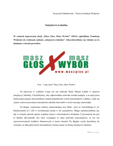 Krzysztof Jakubowski – Prezes Fundacji Wolności Inicjatywa Lokalna W ramach tegorocznej akcji „Masz Głos, Masz Wybór” (2013), zgłosiliśmy Fundację Wolności do realizacji zadania „inicjatywa lokalna”. Zdecydowaliśmy się właśnie na to działanie z dwóch powodów. Foto. - Logo akcji "Masz Głos, Masz Wybór" Po pierwsze w Lublinie wciąż nie ma uchwały Rady Miasta Lublin w sprawie inicjatywy lokalnej. Chcielibyśmy, aby odpowiednia uchwała została podjęta, a ta najwyższa forma partycypacji obywatelskiej zyskała popularność wśród mieszkańców Lublina i stała się często wykorzystywanym narzędziem udziału obywateli w życiu naszego samorządu. Po drugie, wspieramy rodziny zamieszkujące trzy bloki - przy ul. Sowińskiego 4, Al. Racławickich 22 i 22b w rewitalizacji terenu w ich sąsiedztwie. Długo zastanawialiśmy się, jak w zwięzły sposób opisać wspólne (nasze i mieszkańców) działania. Z pewnością nie jest to budżet obywatelski (bo choć występuje tu silna potrzeba mieszkańców, to nie ma zarezerwowanych środków finansowych w kasie miasta). Po długim czasie doszliśmy do wniosku, że taką aktywność mieszkańców można uznać za formę inicjatywy lokalnej. 1|Strona Mieszkańcy zwierają szyki Na początku tego roku zadzwoniła do mnie Pani Wanda. Zwróciła się z problemem, z którym ona i jej sąsiedzi borykają się od kilku lat, nadal bezskutecznie. Mianowicie chodzi o to, że droga prowadząca między wspomnianymi wcześniej blokami jest wąska, a ograniczona ilość miejsc parkingowych sprawia, że samochody zastawiają każdy wolny skrawek terenu (blokując przejazd oraz niszcząc zieleń). Znacznie utrudnia to dojazd mieszkańcom oraz przede wszystkim śmieciarce, która co piątek musi się przeciskać wzdłuż zatłoczonej, wąskiej dróżki. Nie mniej istotnym problemem dla mieszkańców, jest niemodernizowany od lat pięćdziesiątych plac zabaw, znajdujący się pośrodku tego terenu. Mieszkańcy zwrócili się do urzędu pierwszy raz w tej sprawie kilka lat temu. Od tego czasu powstało całkiem sporo korespondencji, niestety bez żadnych efektów. Rozpowszechniająca się w całym kraju „moda” na partycypację (np. budżety obywatelskie) trafiła wreszcie również do grupy sąsiadów z tego osiedla, leżącego w centrum Lublina. Poprosili o wsparcie naszą fundację. Poza nami, pomagają im także studenci z Wydziału Budownictwa i Architektury Politechniki Lubelskiej, którzy dokonują inwentaryzacji zieleni i opracowują graficznie koncepcję zagospodarowania przestrzeni. Foto. - Mieszkańcy bloków przy ul. Sowińskiego i Al. Racławickich rozmawiają nt. rewitalizacji swojego podwórka 2|Strona Wspólnie zabraliśmy się do pracy, aby ten stan rzeczy zmienić. Najpierw powstał plan działań. Zdecydowaliśmy, że opracujemy ankietę, w której mieszkańcy trzech bloków wypowiedzą się nt. zagospodarowania wspólnej przestrzeni. W ten sposób zebraliśmy opinie prawie 80% osób, zamieszkujących okolicę. Pomysły, które pojawiły się w ankiecie zostały dookreślone na otwartym spotkaniu dla mieszkańców. Następnie zorganizowaliśmy kolejne spotkanie mieszkańców, na które zaprosiliśmy również lokalne media lubelskie oraz radnych Rady Miasta. Przyszło prawie 80 osób, w tym dwóch radnych. Wysoka frekwencja udowodniła radnym, że problem drogi, miejsc parkingowych i placu zabaw jest dla mieszkańców niezwykle istotny. Na początku przedstawiliśmy zebranym cel naszych działań a Pani Wanda zaprezentowała zdjęcia, które doskonale zobrazowały problem. Sukcesem tego spotkania była obietnica wsparcia dla planu rewitalizacji, którą złożył radny Marcin Nowak. Pozyskaliśmy sojusznika w naszej sprawie. Inicjatywa lokalna – jako najwyższa formą partycypacji Mechanizm inicjatywy lokalnej został ujęty w ustawie z dnia 24 kwietnia 2003 r. o działalności pożytku publicznego i o wolontariacie (Dz. U. 2003 nr 96 poz. 873 z późn. zm.). Art. 19b. ust. 1 precyzuje, że w ramach inicjatywy lokalnej mieszkańcy jednostki samorządu terytorialnego bezpośrednio, bądź za pośrednictwem organizacji pozarządowych, lub podmiotów wymienionych w art. 3 ust. 3 mogą złożyć wniosek o realizację zadania publicznego do jednostki samorządu terytorialnego, na terenie której mają miejsce zamieszkania lub siedzibę. Nie istnieje ściśle określony formularz wniosku, a pismo składa się w trybie Kodeksu Postępowania Administracyjnego. Rada Gminy powinna ustalić tryb i kryteria oceny wniosków, z uwzględnieniem przede wszystkim wkładu pracy społecznej (art. 19c). Po zatwierdzeniu wniosku, organ wykonawczy jednostki samorządu terytorialnego zawiera z wnioskodawcą umowę na czas określony o wykonanie inicjatywy lokalnej. Tyle w ustawie. Istotą inicjatywy lokalnej jest pełna kooperacja samorządu lokalnego – władz i mieszkańców. Łączą oni swoje siły, celem zaspokojenia potrzeb mieszkańców. Mówi się, że inicjatywa lokalna jest najwyższą formą partycypacji, bo mieszkańcy mogą nie tylko wskazać, co powinno zostać zrealizowane, ale również czynnie uczestniczyć w działaniach, 3|Strona np. budując wymarzony plac zabaw z materiałów otrzymanych od władz gminy. Wkładem mieszkańców w inicjatywie lokalnej najczęściej jest ich praca społeczna lub materiały, rzadziej pieniądze. Władze dzięki temu oszczędzają na kosztach inwestycji, zaś wspólna realizacja zadania integruje lokalną społeczność. Niektórzy społecznicy uważają ponadto, że osobisty udział w przedsięwzięciu wpływa na większą troskę mieszkańców o zrealizowany projekt. W przypadku grupy sąsiedzkiej z ul. Sowińskiego 4 i Al. Racławickich 22 i 22b, wkładem mieszkańców jest zorganizowanie konsultacji w sprawie zagospodarowania terenu oraz przygotowanie projektu przestrzennego (we współpracy ze studentami Politechniki Lubelskiej). Nie bez znaczenia jest duże zainteresowanie i za