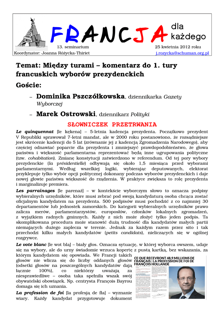 FRANCJA dla każdego 13. seminarium 25 kwietnia 2012 roku Koordynator: Joanna RóżyckaThiriet [email protected] Temat: Między turami – komentarz do 1. tury francuskich wyborów prezydenckich Goście: – Dominika Pszczółkowska, dziennikarka Gazety Wyborczej – Marek Ostrowski, dziennikarz Polityki SŁOWNICZEK PRZETRWANIA Le quinquennat [le kękena] – 5letnia kadencja prezydenta. Początkowo prezydent V Republiki sprawował 7letni mandat, ale w 2000 roku postanowiono, że rozsądniejsze jest skrócenie kadencji do 5 lat (zrównanie jej z kadencją Zgromadzenia Narodowego), aby częściej odnawiać poparcie dla prezydenta i zmniejszyć prawdopodobieństwo, że głowa państwa i większość parlamentarna reprezentować będą inne ugrupowania polityczne (tzw. cohabitation). Zmianę konstytucji zatwierdzono w referendum. Od tej pory wybory prezydenckie (la présidentielle) odbywają się około 1,5 miesiąca przed wyborami parlamentarnymi. Według wszelkiej logiki, wybierając deputowanych, elektorat przyklepuje tylko wybór opcji politycznej dokonany podczas wyborów prezydenckich i daje nowej głowie państwa większość do rządzenia. W praktyce zwiększa to rolę prezydenta i marginalizuje premiera. Les parrainages [le parenaż] – w kontekście wyborczym słowo to oznacza podpisy wybieralnych urzędników, które musi zebrać pod swoją kandydaturą osoba chcąca zostać oficjalnym kandydatem na prezydenta. 500 podpisów musi pochodzić z co najmniej 30 departamentów lub jednostek zamorskich. Do kategorii wybieralnych urzędników prawo zalicza merów, parlamentarzystów, europosłów, członków lokalnych zgromadzeń, z wyjątkiem radnych gminnych. Każdy z nich może złożyć tylko jeden podpis. Ta skomplikowana procedura może stanowić dużą trudność dla kandydatów małych partii niemających dużego zaplecza w terenie. Jednak za każdym razem przez sito i tak przechodzi kilku małych kandydatów (petits candidats), nieliczących się w ogólnej rozgrywce. Le vote blanc [le wot blą] – biały głos. Oznacza sytuację, w której wyborca owszem, udaje się na wybory, ale do urny świadomie wrzuca kopertę z pustą kartką, bez wskazania, za którym kandydatem się opowiada. We Francji takich głosów nie wlicza się do liczby oddanych głosów (odsetki głosów na poszczególnych kandydatów dają łącznie 100%), co niektórzy uważają za niesprawiedliwe – osoba taka spełniła wszak swój obywatelski obowiązek. Np. centrysta François Bayrou domaga się ich uznania. La profession de foi [la profesją de fła] – wyznanie wiary. Każdy kandydat przygotowuje dokument formatu A3, w którym prezentuje najważniejsze elementy swojego programy. Pakiet ulotek wszystkich kandydatów jest rozsyłany o wszystkich wyborców razem z kartami do głosowania. DOBRZE POWIEDZIANE – FRAZA DNIA J'ai donné rendezvous à la France qu'on entend jamais (…) Je veux parler à la majorité silencieuse (Wyznaczyłem spotkanie Francji, której nigdy nie słyszymy (…) Chcę mówić do milczącej większości) fragment przemówienia Nicolasa Sarkozy'ego na Placu Concorde w Paryżu 15 kwietnia 2012 roku, podczas ostatniego meetingu przed 1. turą wyborów. Ponownie jak w 2007 roku Sarkozy zwraca się w tej kampanii do zwykłych, pracujących ludzi. Na wiecu zaapelował do tysięcy zebranych, aby zadali kłam sondażom, które wskazują na jego przegraną. I w 1. turze ta milcząca większość przemówiła mimo zapowiadanej 30% absencji do urn poszło prawie 80% zapisanych na listach wyborczych. Ale Nicolas Sarkozy i tak przegrał z François Hollande'm (27,18% do 28,63%). PORTRETY MNIEJ ZNANYCH MĘŻCZYZN I KOBIET Po ostatnich sondażach przed 1. turą, które dawały mu od 13 do 15% (a wcześniej nawet 3. miejsce po Hollande i Sarkozy'm) JeanLuc Mélenchon może się czuć rozczarowany. Kandydat Frontu Lewicy (konglomeratu partii lewicowych) zdobył 11,7%. Tuż po zamknięciu urn 22 kwietnia zaapelował o głosowanie przeciwko Sarkozy'emu. Mélenchon urodził się w 1951 roku w Tangerze, w Maroku. W młodości był komunistą (trockistą), ale w 1977 został członkiem Partii Socjalistycznej, był zwolennikiem Mitterranda. Kilka lat później zakłada w PS własny nurt polityczny, a w 1997 roku startuje w wyborach na szefa partii przeciwko Holllande'owi. W 2000 roku zostaje ministrem w rządzie Lionela Jospin oddelegowanym ds. nauczania zawodowego. Prowadzi kampanię przeciwko traktatowi konstytucyjnemu (który poległ we francuskim referendum w 2005 roku). W 2008 roku opuszcza PS i tworzy swoją partię, Partię Lewicy. Jego niektóre postulaty w tegorocznej kampanii: VI Republika (nowa konstytucja), eutanazja, zwiększenie pensji minimalnej do 1700 euro, zakaz pracy w niedzielę, emerytura w wieku 60 lat, rezygnacja z energii opartej na węglu i referendum w sprawie energii atomowej, wyjście z NATO. JAK TO SIĘ JE, CZYLI O FRANCUSKICH ZWYCZAJACH Le 1er mai – 1 maja jest we Francji także dniem wolnym, w którym obchodzi się Święto Pracy. Tradycyjnie tego dnia manifestują francuskie związki zawodowe. Najsłynniejsza jest manifestacja w Paryżu. Zupełnie inne zgromadzenie organizuje w Paryżu Front Narodowy, który obchodzi 1 maja jako święto Joanny d'Arc. W tym roku osobną manifestację zorganizuje też kandydat Sarkozy, która ma być marszem ludzi prawdziwej pracy. Organizatorem seminarium jest Polska Fundacja im. Roberta Schumana oraz Fundacja Centrum im. prof. Bronisława Geremka Partnerem seminariów jest Fundacja Roberta Schumana w Paryżu Działania Polskiej Fundacji im. Roberta Schumana są współfinansowane przez Unię Europejską, ze środków programu Europa dla Obywateli