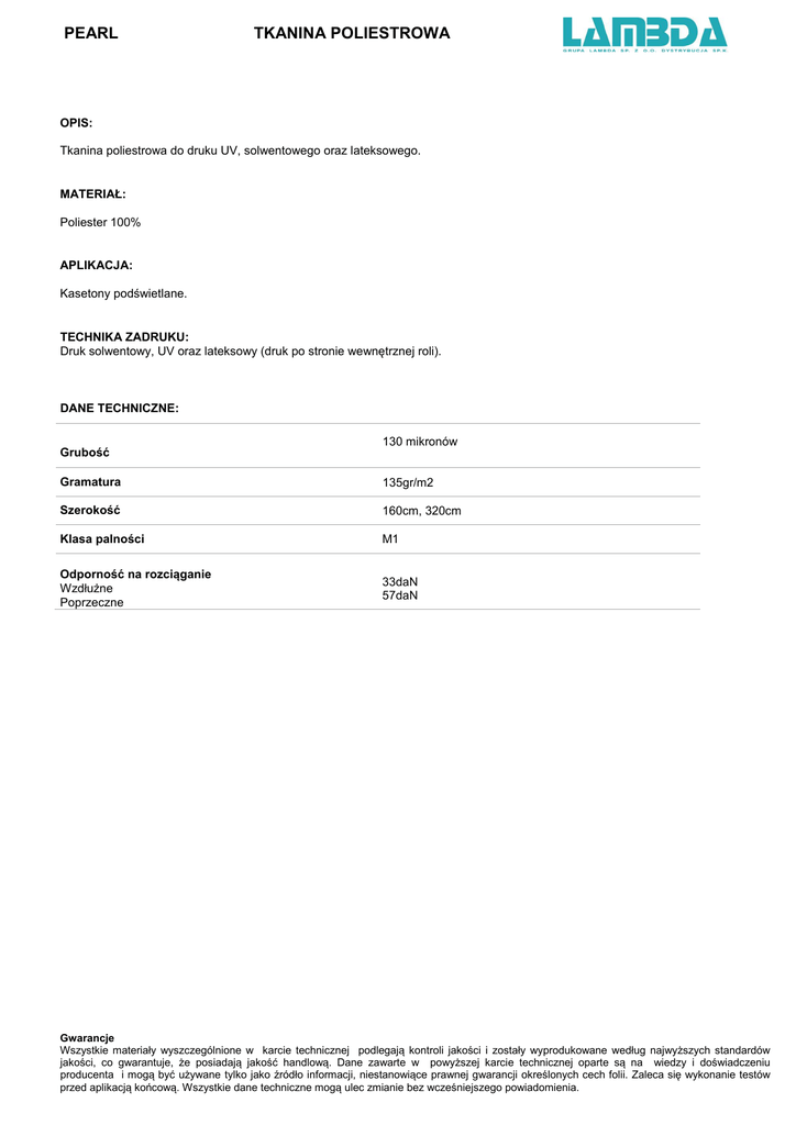 PEARL TKANINA POLIESTROWA OPIS: Tkanina poliestrowa do druku UV, solwentowego oraz lateksowego. MATERIAŁ: Poliester 100% APLIKACJA: Kasetony podświetlane. TECHNIKA ZADRUKU: Druk solwentowy, UV oraz lateksowy (druk po stronie wewnętrznej roli). DANE TECHNICZNE: Grubość 130 mikronów Gramatura 135gr/m2 Szerokość 160cm, 320cm Klasa palności M1 Odporność na rozciąganie Wzdłużne Poprzeczne 33daN 57daN Gwarancje Wszystkie materiały wyszczególnione w karcie technicznej podlegają kontroli jakości i zostały wyprodukowane według najwyższych standardów jakości, co gwarantuje, że posiadają jakość handlową. Dane zawarte w powyższej karcie technicznej oparte są na wiedzy i doświadczeniu producenta i mogą być używane tylko jako źródło informacji, niestanowiące prawnej gwarancji określonych cech folii. Zaleca się wykonanie testów przed aplikacją końcową. Wszystkie dane techniczne mogą ulec zmianie bez wcześniejszego powiadomienia.