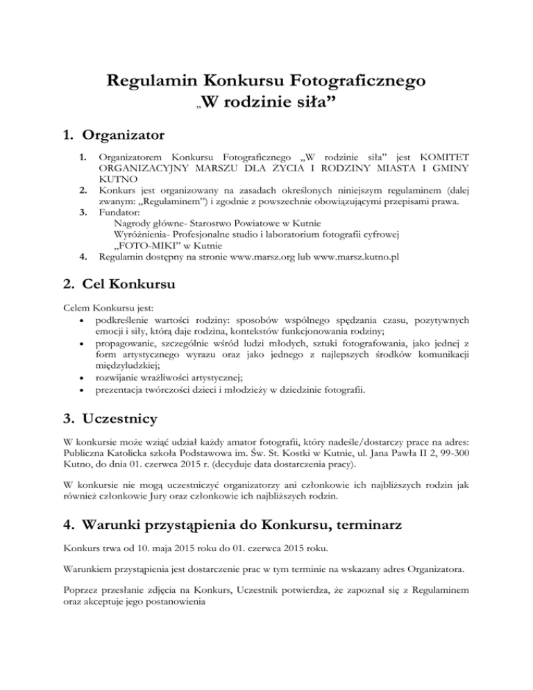 Regulamin Konkursu Fotograficznego „W rodzinie siła” 1. Organizator 1. 2. 3. 4. Organizatorem Konkursu Fotograficznego „W rodzinie siła” jest KOMITET ORGANIZACYJNY MARSZU DLA ŻYCIA I RODZINY MIASTA I GMINY KUTNO Konkurs jest organizowany na zasadach określonych niniejszym regulaminem (dalej zwanym: „Regulaminem”) i zgodnie z powszechnie obowiązującymi przepisami prawa. Fundator: Nagrody główne- Starostwo Powiatowe w Kutnie Wyróżnienia- Profesjonalne studio i laboratorium fotografii cyfrowej „FOTO-MIKI” w Kutnie Regulamin dostępny na stronie www.marsz.org lub www.marsz.kutno.pl 2. Cel Konkursu Celem Konkursu jest: podkreślenie wartości rodziny: sposobów wspólnego spędzania czasu, pozytywnych emocji i siły, którą daje rodzina, kontekstów funkcjonowania rodziny; propagowanie, szczególnie wśród ludzi młodych, sztuki fotografowania, jako jednej z form artystycznego wyrazu oraz jako jednego z najlepszych środków komunikacji międzyludzkiej; rozwijanie wrażliwości artystycznej; prezentacja twórczości dzieci i młodzieży w dziedzinie fotografii. 3. Uczestnicy W konkursie może wziąć udział każdy amator fotografii, który nadeśle/dostarczy prace na adres: Publiczna Katolicka szkoła Podstawowa im. Św. St. Kostki w Kutnie, ul. Jana Pawła II 2, 99-300 Kutno, do dnia 01. czerwca 2015 r. (decyduje data dostarczenia pracy). W konkursie nie mogą uczestniczyć organizatorzy ani członkowie ich najbliższych rodzin jak również członkowie Jury oraz członkowie ich najbliższych rodzin. 4. Warunki przystąpienia do Konkursu, terminarz Konkurs trwa od 10. maja 2015 roku do 01. czerwca 2015 roku. Warunkiem przystąpienia jest dostarczenie prac w tym terminie na wskazany adres Organizatora. Poprzez przesłanie zdjęcia na Konkurs, Uczestnik potwierdza, że zapoznał się z Regulaminem oraz akceptuje jego postanowienia 5. Wymagania dotyczące prac konkursowych 1. Przedmiotem konkursu są prace fotograficzne wykonane samodzielnie, będące oryginałami, których tematyka wiąże się z podanym tytułem. 2. Technika wykonania fotografii jest dowolna. 3. Format wywołanej fotografii nie może być mniejszy niż 20x30 cm. 4. Jeden Uczestnik może nadesłać jedno zdjęcie. W przypadku nadesłania większej liczby zdjęć przez jednego Uczestnika, Organizator zastrzega sobie prawo do wyboru jednego ze zdjęć metodą losową, bez uwzględnienia w Konkursie pozostałych prac tego Uczestnika. 5. Nadesłane prace należy opisać drukowanymi literami (tytuł pracy, imię i nazwisko autora). Do każdej pracy należy dołączyć wydrukowany i wypełniony formularz konkursowy lub dane zbieżne z jego zawartością. 6. Przesłane prace nie będą zwracane. 7. Udział w konkursie jest bezpłatny. 8. O ile na fotografiach konkursowych znajduje się wizerunek człowieka, uczestnik, przesyłając fotografię, zapewnia, że osoba, której wizerunek znajduje się na fotografii, wyraziła zgodę na nieodpłatną publikację tego wizerunku. 6. Finał i rozstrzygnięcie Konkursu 1. 2. 3. 4. Rozstrzygnięcie Konkursu nastąpi dnia 07. czerwca 2015 roku na Stadionie Miejskim MOSIR po Marszu dla Życia i Rodziny, podczas Pikniku Rodzinnego około godz. 14.50. Oceny nadesłanych prac dokona i decyzję podejmie powołane jury składające się z osób profesjonalnie zajmujących się fotografią. Werdykt jury jest ostateczny. Organizator zastrzega sobie prawo do wykorzystania nagrodzonych zdjęć w kampaniach reklamowych i/lub materiałach reklamowych Organizatora bez obowiązku wynagrodzenia dla autora zdjęć, jednakże Organizator nie ma obowiązku wykorzystania zdjęć. 7. Nagrody Organizator przyzna atrakcyjne nagrody za 1., 2. i 3. miejsce, odpowiednio: za 1. miejsce: aparat fotograficzny; za 2. Miejsce: tablet; za 3. Miejsce: mp3 player oraz wyróżnienia. 8. Postanowienia dodatkowe 1. Organizator nie zwraca Uczestnikom żadnych kosztów związanych z ich uczestnictwem w Konkursie. 2. Odpowiedzialność za naruszenie praw osób trzecich do zdjęcia nadesłanego na Konkurs w całości obciąża Uczestnika Konkursu. 3. Organizator Konkursu zastrzega sobie prawo do wykorzystania nadesłanych zdjęć (także tych nienagrodzonych) w publikacjach i/lub działaniach promocyjnych Organizatora. 4. Uczestnikowi Konkursu nie należy się żadne wynagrodzenie z tytułu wykorzystania jego zdjęć przez Organizatora, na co każdy Uczestnik wyraża zgodę, zgłaszając się do Konkursu. 5. Nadesłane prace przechodzą na własność Organizatora. 6. Uczestnik przesyłając prace na Konkurs przenosi nieodpłatnie na Organizatora bez ograniczeń czasowych i terytorialnych autorskie prawa majątkowe i zależne do swych zdjęć na wszystkich polach eksploatacji znanych polskiemu prawu w dacie wysłania zdjęć. 7. Uczestnik ma obowiązek nieodwołalnie, bezwarunkowo i na pierwsze żądanie zwolnić Organizatora w całości od wszelkiej odpowiedzialności jaka zostałaby na Organizatora nałożona, choćby nieprawomocnym wyrokiem, z tytułu naruszenia w zdjęciach i/lub w związku ze zdjęciami praw osób trzecich, w tym osobistych lub majątkowych praw autorskich. 9. Postępowanie reklamacyjne Postępowanie reklamacyjne nie dotyczy werdyktu jury, który stanowi wyraz subiektywnej oceny prac przez członków jury. Nad prawidłowością przebiegu Konkursu czuwać będzie komisja nadzorująca. 10. Postanowienia końcowe Przystąpienie do Konkursu jest dobrowolne. Uczestnik Konkursu wyraża zgodę na zbieranie i przetwarzanie jego danych osobowych przez Organizatora na potrzeby Konkursu. Uczestnicy Konkursu mają prawo do wglądu w swoje dane osobowe oraz do ich poprawiania. W sprawach nieuregulowanych niniejszym Regulaminem zastosowanie znajdują powszechne przepisy prawa, w szczególności przepisy kodeksu cywilnego oraz ustawy z dnia 4 lutego 1994 roku o prawie autorskim i prawach pokrewnych (Dz. U. Z 2000 r., Nr 80, poz. 904 z późn. zm.).