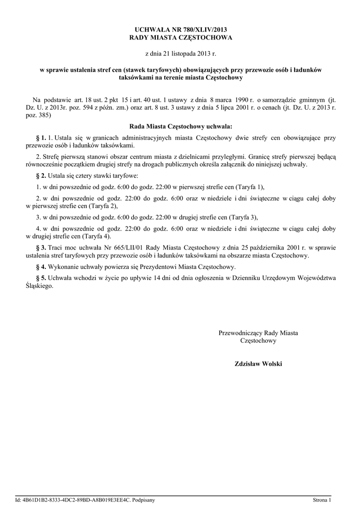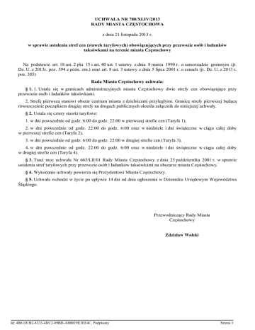 UCHWAŁA NR 780/XLIV/2013 RADY MIASTA CZĘSTOCHOWA z dnia 21 listopada 2013 r. w sprawie ustalenia stref cen (stawek taryfowych) obowiązujących przy przewozie osób i ładunków taksówkami na terenie miasta Częstochowy Na podstawie art. 18 ust. 2 pkt 15 i art. 40 ust. 1 ustawy z dnia 8 marca 1990 r. o samorządzie gminnym (jt. Dz. U. z 2013r. poz. 594 z późn. zm.) oraz art. 8 ust. 3 ustawy z dnia 5 lipca 2001 r. o cenach (jt. Dz. U. z 2013 r. poz. 385) Rada Miasta Częstochowy uchwala: § 1. 1. Ustala się w granicach administracyjnych miasta Częstochowy dwie strefy cen obowiązujące przy przewozie osób i ładunków taksówkami. 2. Strefę pierwszą stanowi obszar centrum miasta z dzielnicami przyległymi. Granicę strefy pierwszej będącą równocześnie początkiem drugiej strefy na drogach publicznych określa załącznik do niniejszej uchwały. § 2. Ustala się cztery stawki taryfowe: 1. w dni powszednie od godz. 6:00 do godz. 22:00 w pierwszej strefie cen (Taryfa 1), 2. w dni powszednie od godz. 22:00 do godz. 6:00 oraz w niedziele i dni świąteczne w ciągu całej doby w pierwszej strefie cen (Taryfa 2), 3. w dni powszednie od godz. 6:00 do godz. 22:00 w drugiej strefie cen (Taryfa 3), 4. w dni powszednie od godz. 22:00 do godz. 6:00 oraz w niedziele i dni świąteczne w ciągu całej doby w drugiej strefie cen (Taryfa 4). § 3. Traci moc uchwała Nr 665/LII/01 Rady Miasta Częstochowy z dnia 25 października 2001 r. w sprawie ustalenia stref taryfowych przy przewozie osób i ładunków taksówkami na obszarze miasta Częstochowy. § 4. Wykonanie uchwały powierza się Prezydentowi Miasta Częstochowy. § 5. Uchwała wchodzi w życie po upływie 14 dni od dnia ogłoszenia w Dzienniku Urzędowym Województwa Śląskiego. Przewodniczący Rady Miasta Częstochowy Zdzisław Wolski Id: 4B61D1B2-8333-4DC2-89BD-A8B019E3EE4C. Podpisany Strona 1 Załącznik do Uchwały Nr 780/XLIV/2013 Rady Miasta Częstochowy z dnia 21 listopada 2013 r. GRANICE OBSZARU PIERWSZEJ STREFY TARYFOWEJ OBOWIĄZUJĄCEJ PRZY PRZEWOZIE OSÓB I ŁADUNKÓW TAKSÓWKAMI Na ulicy Początek drugiej strefy taryfowej taxi 1. Aleja Wojska Polskiego (w kierunku Katowic) - od wiaduktu kolejowego linii Częstochowa Stradom - Kielce 2. ul. Bohaterów Katynia - od wiaduktu kolejowego linii Częstochowa Stradom - Kielce 3. ul. Korkowa - od wjazdu z ul. Grzybowskiej 4. ul. Wypalanki - przed wyjazdem na ul. Poselską 5. ul. Sabinowska - przed skrzyżowaniem z ul. Dźbowską i ul. Żyzną 6. ul. Skrzetuskiego - za skrzyżowaniem z ul. Polną 7. ul. Wołodyjowskiego - na wjeździe z ul. Skrzetuskiego 8. ul. Podbipięty - na wjeździe z ul. Skrzetuskiego 9. ul. Weteranów - za skrzyżowaniem z ul. Polną 10. ul. Spadochroniarzy - na wjeździe z ul. Artyleryjskiej 11. ul. Konwaliowa - na skrzyżowaniu z ul. Kawodrzańską i ul. Artyleryjską 12. ul. Kawodrzańska - na wlocie w kierunku południowym od skrzyżowania z ul. Artyleryjską i Konwaliową 13. ul. Zamiejska - na wjeździe z ul. Kawodrzańskiej 14. ul. Piastowska - od skrzyżowania z ul. Kawodrzańską 15. ul. Przestrzenna - od wjazdu z ul. Głównej 16. ul. Główna - przed ul. Szamotową 17. ul. Huculska - za skrzyżowaniem z ul. Cegielnianą i ul. Wałową Id: 4B61D1B2-8333-4DC2-89BD-A8B019E3EE4C. Podpisany Strona 2 18. ul. Lwowska - za wjazdem z ul. Bytomskiej 19. ul. Dobrzyńska - od wjazdu z ul. Wielkoborskiej 20. ul. Wielkoborska - od skrzyżowania z ul. Dobrzyńską ul. Białostocką 21. ul. Wręczycka - za skrzyżowaniem z ul. Białostocką 22. ul. Gminna - na wjeździe z ul. Radomskiej 23. ul. Ikara - na wjeździe z ul. Radomskiej 24. ul. św. Rocha - za ul. Krzemienną 25. ul. Odrodzenia - za skrzyżowaniem z ul. Ukrytą 26. ul. Zakopiańska - za ul. Ukrytą 27. ul. Bialska - za ul. Małopolską 28. ul. Kisielewskiego - na skrzyżowaniu z ul. Ludową i ul. Sejmową 29. ul. św. Brata Alberta - przed ul. Narcyzową 30. ul. Pileckiego - przy zjeździe w prawo w "Korytarz Północny" 31. ul. Gen. Tadeusza Komorowskiego "Bora" - od wjazdu z ul. Gen. Stanisława Sosabowskiego 32. Aleja Wojska Warszawy) Polskiego (w kierunku- od wiaduktu kolejowego na Aniołowie 33. ul. Morsztyna - od przejazdu kolejowego 34. ul. Rząsawska - od wjazdu z ul. Warszawskiej 35. ul. Warszawska - za wjazdem do kościoła pw. św. Jacka 36. ul. Srebrna - za ul. Ołowianą 37. ul. Mirowska - za skrzyżowaniem z ul. Srebrną i ul. Złotą 38. ul. Legionów - za skrzyżowaniem z ul. Złotą 39. Aleja Pokoju - od Szpitala Chorób Wewnętrznych „Hutniczy” Id: 4B61D1B2-8333-4DC2-89BD-A8B019E3EE4C. Podpisany Strona 3