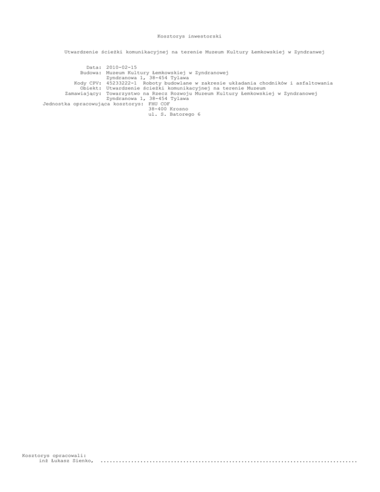 Wydruk kosztorysu - Muzeum Kultury Łemkowskiej w Zyndranowej
