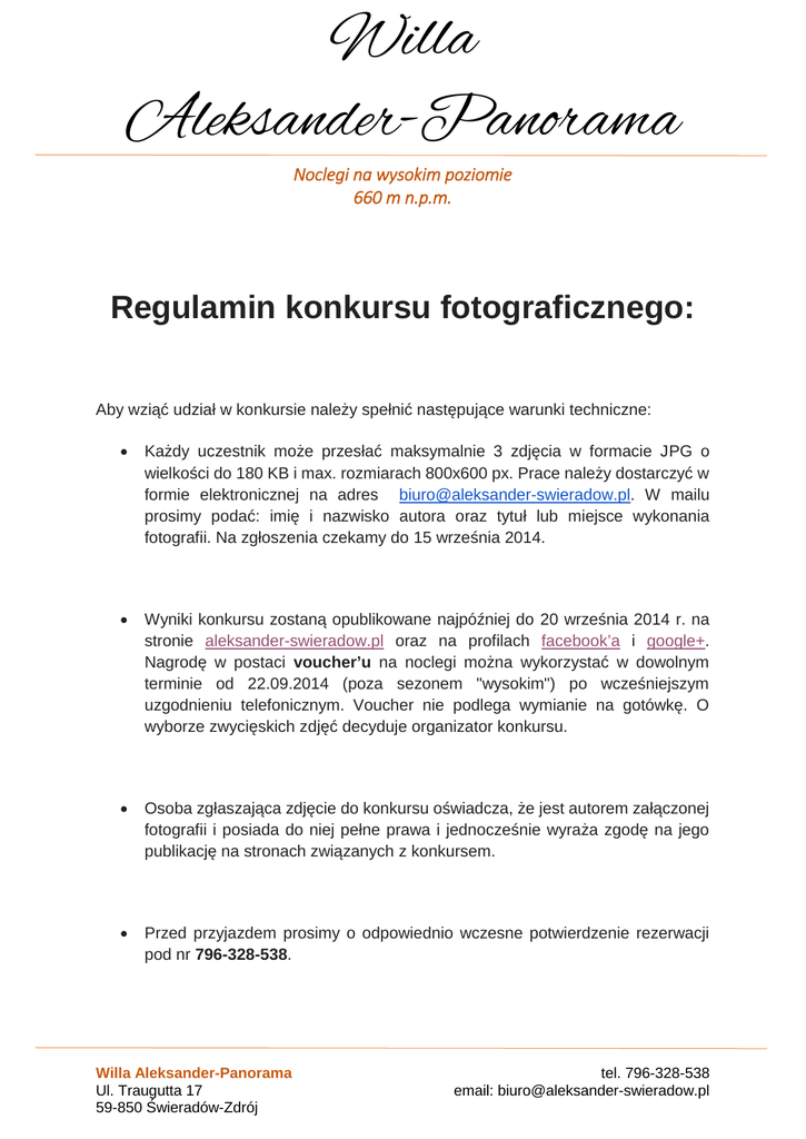 Willa Aleksander-Panorama Noclegi na wysokim poziomie 660 m n.p.m. Regulamin konkursu fotograficznego: Aby wziąć udział w konkursie należy spełnić następujące warunki techniczne: Każdy uczestnik może przesłać maksymalnie 3 zdjęcia w formacie JPG o wielkości do 180 KB i max. rozmiarach 800x600 px. Prace należy dostarczyć w formie elektronicznej na adres [email protected]. W mailu prosimy podać: imię i nazwisko autora oraz tytuł lub miejsce wykonania fotografii. Na zgłoszenia czekamy do 15 września 2014. Wyniki konkursu zostaną opublikowane najpóźniej do 20 września 2014 r. na stronie aleksander-swieradow.pl oraz na profilach facebook’a i google+. Nagrodę w postaci voucher’u na noclegi można wykorzystać w dowolnym terminie od 22.09.2014 (poza sezonem "wysokim") po wcześniejszym uzgodnieniu telefonicznym. Voucher nie podlega wymianie na gotówkę. O wyborze zwycięskich zdjęć decyduje organizator konkursu. Osoba zgłaszająca zdjęcie do konkursu oświadcza, że jest autorem załączonej fotografii i posiada do niej pełne prawa i jednocześnie wyraża zgodę na jego publikację na stronach związanych z konkursem. Przed przyjazdem prosimy o odpowiednio wczesne potwierdzenie rezerwacji pod nr 796-328-538. Willa Aleksander-Panorama Ul. Traugutta 17 59-850 Świeradów-Zdrój tel. 796-328-538 email: [email protected]