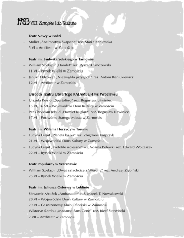 1983 VIII Zamojskie Lato Teatralne Teatr Nowy w Łodzi − Molier „Szelmostwa Skapena” reż. Maria Kaniewska 5.VI – Amfiteatr w Zamościu Teatr im. Ludwika Solskiego w Tarnowie − William Szekspir „Hamlet” reż. Ryszard Smożewski 11.VI – Rynek Wielki w Zamościu − Janusz Odrowąż „Niezwykła przygoda” reż. Antoni Baniukiewicz 12.VI – Amfiteatr w Zamościu Ośrodek Teatru Otwartego KALAMBUR we Wrocławiu − Urszula Kozioł „Spartolino” reż. Bogusław Litwiniec 15.VI, 16.VI – Wojewódzki Dom Kultury w Zamościu − Per Chrystian Jersild „Hamlet Kuglarz” reż. Bogusław Litwiniec 17.VI – Podwórko Starego Miasta w Zamościu Teatr im. Wilama Horzycy w Toruniu − Lucyna Legut „Planeta bajka” reż. Zbigniew Kasprzyk 21.VI – Wojewódzki Dom Kultury w Zamościu − Lucyna Legut „Krotofile ucieszne” wg Adama Polewki reż. Edward Wojtaszek 22.VI – Rynek Wielki w Zamościu Teatr Popularny w Warszawie − William Szekspir „Dwaj szlachcice z Werony” reż. Andrzej Ziębiński 25.VI – Rynek Wielki w Zamościu Teatr im. Juliusza Osterwy w Lublinie − Sławomir Mrożek „Ambasador” reż. Marek T. Nowakowski 28.VI – Wojewódzki Dom Kultury w Zamościu 29.VI – Garnizonowy Klub Oficerski w Zamościu − Wiktoryn Sardou „Madame Sans Gene” reż. Józef Słotwiński 2.VII – Amfiteatr w Zamościu Teatr Stu w Krakowie − Alfred Jarry „Ubu” reż. Adolf Weltschek 3.VII, 4.VII – Wojewódzki Dom Kultury w Zamościu Teatr Ochoty w Warszawie − William Szekspir „Król Lear” reż. Halina i Jan Machulscy 16.VII – Rynek Wielki w Zamościu Teatr Fraszka w Warszawie − wg Jana Chrystiana Andersena „Calineczka” reż. Henryk Pijanowski 22.VI – Wojewódzki Dom Kultury w Zamościu Siedlecki Teatr Kameralny w Siedlcach − Kornel Makuszyński „Koziołek Matołek” reż. Jan Pęczak 26.VI – Rynek Wielki w Zamościu