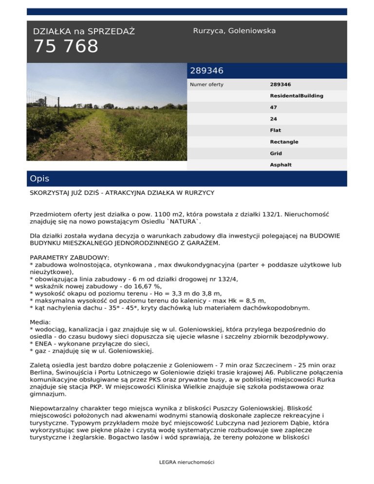 DZIAŁKA na SPRZEDAŻ Rurzyca, Goleniowska 75 768 289346 Numer oferty 289346 ResidentalBuilding 47 24 Flat Rectangle Grid Asphalt Opis SKORZYSTAJ JUŻ DZIŚ - ATRAKCYJNA DZIAŁKA W RURZYCY Przedmiotem oferty jest działka o pow. 1100 m2, która powstała z działki 132/1. Nieruchomość znajduję się na nowo powstającym Osiedlu `NATURA`. Dla działki została wydana decyzja o warunkach zabudowy dla inwestycji polegającej na BUDOWIE BUDYNKU MIESZKALNEGO JEDNORODZINNEGO Z GARAŻEM. PARAMETRY ZABUDOWY: * zabudowa wolnostojąca, otynkowana , max dwukondygnacyjna (parter + poddasze użytkowe lub nieużytkowe), * obowiązująca linia zabudowy - 6 m od działki drogowej nr 132/4, * wskaźnik nowej zabudowy - do 16,67 %, * wysokość okapu od poziomu terenu - Ho = 3,3 m do 3,8 m, * maksymalna wysokość od poziomu terenu do kalenicy - max Hk = 8,5 m, * kąt nachylenia dachu - 35* - 45*, kryty dachówką lub materiałem dachówkopodobnym. Media: * wodociąg, kanalizacja i gaz znajduje się w ul. Goleniowskiej, która przylega bezpośrednio do osiedla - do czasu budowy sieci dopuszcza się ujecie własne i szczelny zbiornik bezodpływowy. * ENEA - wykonane przyłącze do sieci, * gaz - znajduję się w ul. Goleniowskiej. Zaletą osiedla jest bardzo dobre połączenie z Goleniowem - 7 min oraz Szczecinem - 25 min oraz Berlina, Świnoujścia i Portu Lotniczego w Goleniowie dzięki trasie krajowej A6. Publiczne połączenia komunikacyjne obsługiwane są przez PKS oraz prywatne busy, a w pobliskiej miejscowości Rurka znajduje się stacja PKP. W miejscowości Kliniska Wielkie znajduje się szkoła podstawowa oraz gimnazjum. Niepowtarzalny charakter tego miejsca wynika z bliskości Puszczy Goleniowskiej. Bliskość miejscowości położonych nad akwenami wodnymi stanowią doskonałe zaplecze rekreacyjne i turystyczne. Typowym przykładem może być miejscowość Lubczyna nad Jeziorem Dąbie, która wykorzystując swe piękne plaże i czystą wodę systematycznie rozbudowuje swe zaplecze turystyczne i żeglarskie. Bogactwo lasów i wód sprawiają, że tereny położone w bliskości LEGRA nieruchomości miejscowości Rurzyca są rajem dla grzybiarzy i wędkarzy. W cenie zawarty jest podatek VAT w wysokości 23%. BEZPŁATNIE POMAGAMY W UZYSKANIU KREDYTU NA ZAKUP NIERUCHOMOŚCI. LEGRA Nieruchomości Szczecin, ul. Monte Cassino 18A lok. nr 25-24 LEGRA nieruchomości tel. 91-83-141-89 email: [email protected] LEGRA nieruchomości Powered by TCPDF (www.tcpdf.org)