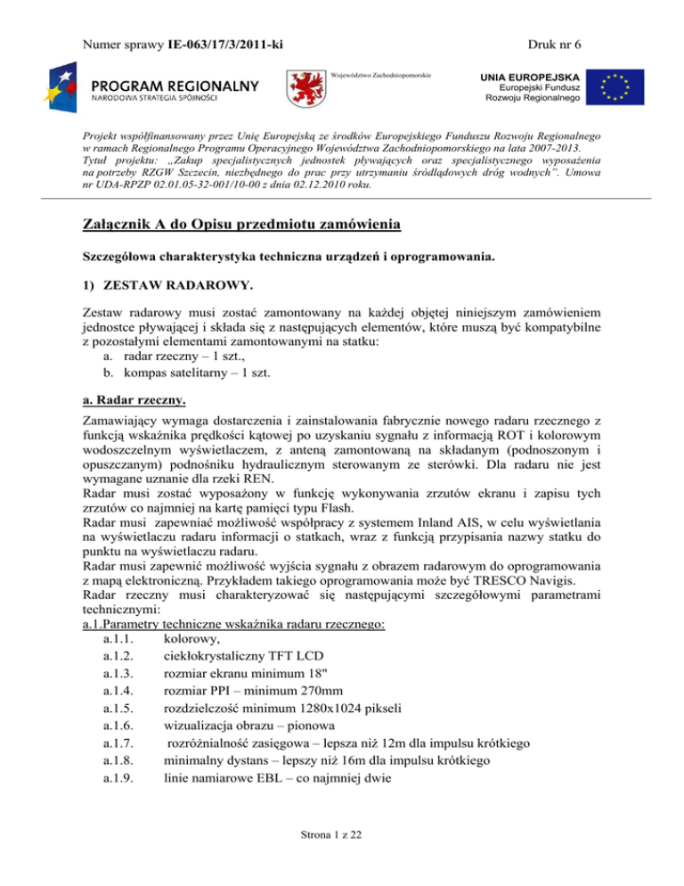 Numer sprawy IE-063/17/3/2011-ki Druk nr 6 Województwo Zachodniopomorskie UNIA EUROPEJSKA Europejski Fundusz Rozwoju Regionalnego Projekt współfinansowany przez Unię Europejską ze środków Europejskiego Funduszu Rozwoju Regionalnego w ramach Regionalnego Programu Operacyjnego Województwa Zachodniopomorskiego na lata 2007-2013. Tytuł projektu: „Zakup specjalistycznych jednostek pływających oraz specjalistycznego wyposażenia na potrzeby RZGW Szczecin, niezbędnego do prac przy utrzymaniu śródlądowych dróg wodnych”. Umowa nr UDA-RPZP 02.01.05-32-001/10-00 z dnia 02.12.2010 roku. Załącznik A do Opisu przedmiotu zamówienia Szczegółowa charakterystyka techniczna urządzeń i oprogramowania. 1) ZESTAW RADAROWY. Zestaw radarowy musi zostać zamontowany na każdej objętej niniejszym zamówieniem jednostce pływającej i składa się z następujących elementów, które muszą być kompatybilne z pozostałymi elementami zamontowanymi na statku: a. radar rzeczny – 1 szt., b. kompas satelitarny – 1 szt. a. Radar rzeczny. Zamawiający wymaga dostarczenia i zainstalowania fabrycznie nowego radaru rzecznego z funkcją wskaźnika prędkości kątowej po uzyskaniu sygnału z informacją ROT i kolorowym wodoszczelnym wyświetlaczem, z anteną zamontowaną na składanym (podnoszonym i opuszczanym) podnośniku hydraulicznym sterowanym ze sterówki. Dla radaru nie jest wymagane uznanie dla rzeki REN. Radar musi zostać wyposażony w funkcję wykonywania zrzutów ekranu i zapisu tych zrzutów co najmniej na kartę pamięci typu Flash. Radar musi zapewniać możliwość współpracy z systemem Inland AIS, w celu wyświetlania na wyświetlaczu radaru informacji o statkach, wraz z funkcją przypisania nazwy statku do punktu na wyświetlaczu radaru. Radar musi zapewnić możliwość wyjścia sygnału z obrazem radarowym do oprogramowania z mapą elektroniczną. Przykładem takiego oprogramowania może być TRESCO Navigis. Radar rzeczny musi charakteryzować się następującymi szczegółowymi parametrami technicznymi: a.1.Parametry techniczne wskaźnika radaru rzecznego: a.1.1. kolorowy, a.1.2. ciekłokrystaliczny TFT LCD a.1.3. rozmiar ekranu minimum 18" a.1.4. rozmiar PPI – minimum 270mm a.1.5. rozdzielczość minimum 1280x1024 pikseli a.1.6. wizualizacja obrazu – pionowa a.1.7. rozróżnialność zasięgowa – lepsza niż 12m dla impulsu krótkiego a.1.8. minimalny dystans – lepszy niż 16m dla impulsu krótkiego a.1.9. linie namiarowe EBL – co najmniej dwie Strona 1 z 22 Numer sprawy IE-063/17/3/2011-ki Druk nr 6 Województwo Zachodniopomorskie UNIA EUROPEJSKA Europejski Fundusz Rozwoju Regionalnego Projekt współfinansowany przez Unię Europejską ze środków Europejskiego Funduszu Rozwoju Regionalnego w ramach Regionalnego Programu Operacyjnego Województwa Zachodniopomorskiego na lata 2007-2013. Tytuł projektu: „Zakup specjalistycznych jednostek pływających oraz specjalistycznego wyposażenia na potrzeby RZGW Szczecin, niezbędnego do prac przy utrzymaniu śródlądowych dróg wodnych”. Umowa nr UDA-RPZP 02.01.05-32-001/10-00 z dnia 02.12.2010 roku. a.1.10. a.1.11. a.1.12. a.1.13. a.1.14. a.1.15. a.1.16. a.1.17. a.1.18. a.1.19. a.1.20. a.1.21. a.1.22. a.1.23. a.1.24. kręgi ruchome VRM – co najmniej dwa dokładność ruchomego kręgu odległości – co najmniej 5m lub mniej niż 1.5% zakresu, w zależność który parametr jest lepszy dokładność linii namiarowej – co najmniej 0.5º wskaźnik prędkości kątowej (ROT) – skala programowalna z co najmniej 5cioma zakresami: 30, 60, 90, 180, 300º/min minimalny zakres skali na wskaźniku – maksimum 0.16 km maksymalny zakres skali na wskaźniku – minimum 60 km regulacja STC i STW strojenie ręczne i automatyczne regulacja wzmocnienia obrazu video regulacja jasności i kontrastu decentrowanie obrazu radarowego na ekranie tłumienie interferencji programowalny ślad (trial) jednostki kąt widzenia do minimum 80º w pionie i poziomie z każdego kierunku uchwyt do regulacji kąta nachylenia wskaźnika w pionie a.2. Parametry techniczne anteny radaru rzecznego: a.2.1. typ – otwarta a.2.2. długość pióra - 6 stóp a.2.3. polaryzacja anteny – horyzontalna a.2.4. szerokość wiązki w pionie (przy -3db): co najmniej 25º, a.2.5. szerokość wiązki w poziomie (przy -3db): nie większa niż 1.3º, a.2.6. maksymalna prędkość obrotowa anteny – co najmniej 26 obr/min. a.2.7. odporność na wiatr o prędkości względnej co najmniej 90km/h a.2.8. waga anteny z modułem nadawczo-odbiorczym – nie więcej niż 22kg a.2.9. kabel antenowy co najmniej 20m z kompletem złączy a.3.Parametry techniczne modułu nadawczo-odbiorczego: a.3.1. typ – up mast a.3.2. częstotliwość – X-band a.3.3. moc w impulsie: minimum 4kW, maksimum 10kW a.3.4. typy impulsów dla danych zakresów pracy do wyboru: krótki, średni, długi Strona 2 z 22 Numer sprawy IE-063/17/3/2011-ki Druk nr 6 Województwo Zachodniopomorskie UNIA EUROPEJSKA Europejski Fundusz Rozwoju Regionalnego Projekt współfinansowany przez Unię Europejską ze środków Europejskiego Funduszu Rozwoju Regionalnego w ramach Regionalnego Programu Operacyjnego Województwa Zachodniopomorskiego na lata 2007-2013. Tytuł projektu: „Zakup specjalistycznych jednostek pływających oraz specjalistycznego wyposażenia na potrzeby RZGW Szczecin, niezbędnego do prac przy utrzymaniu śródlądowych dróg wodnych”. Umowa nr UDA-RPZP 02.01.05-32-001/10-00 z dnia 02.12.2010 roku. a.4. Parametry techniczne interfejsów radaru rzecznego: a.4.1. GPS – minimalny zakres prezentowanej informacji: szerokość geograficzna, długość geograficzna, prędkość, kierunek (Standard formatu wymiany danych: NMEA 0183 – co najmniej sentencja: RMC) a.4.2. Kompas – prezentacja informacji o kierunku północ (Standard formatu wymiany danych: NMEA 0183 – co najmniej sentencja: HDM, HDT) a.4.3. Echosonda – prezentacja informacji o głębokości (Standard formatu wymiany