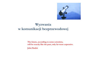 Wyzwania w komunikacji bezprzewodowej The future, according to some scientists, will be exactly like the past, only far more expensive. John Sladek Rozwój sieci bezprzewodowych Obecny trend: unifikacji sieci, usług i odbiorców: • Sieci komórkowe nowych generacji: 5G/B4G (Beyong Fourth Generation) • Lokalne mobilne sieci bezprzewodowe (mobile IP networks, mobile ad-hoc networks, vehicular ad-hoc networks) • Sieci łączące użytkowników, pojazdy (VANETs), sensory (WSNs), urządzenia medyczne, body area networks, inteligentne domy/miasta (Smart Cities), Internet of Things Inne koncepcje: • Sieci sensorowe (Wireless Sensor Networks) - systemy malutkich czujników zbierających dane o otoczeniu i przekazujących je drogą radiową do centrum kontrolnego • Systemy UWB (Ultra WideBand) - transmisja danych na niewielkie odległości (pojedyncze metry), wewnątrz budynków, w szerokim paśmie częstotliwości (3.1 – 10.6 GHz) Wyzwania stojące przed łącznością bezprzewodową 1. Efektywne wykorzystanie dostępnego pasma częstotliwości 2. Propagacja wielodrogowa i zaniki sygnału (osobny wykład) 3. Mobilność użytkowników Wyzwania I Efektywne wykorzystanie dostępnego pasma częstotliwości © Dan Page, IEEE Spectrum, October 2010 Fale elektromagnetyczne • fale radiowe: do 6· 1011 Hz • promieniowanie podczerwone: 6· 1011 – 3.75· 1014 Hz • światło widzialne: 3.75· 1014 – 7.5· 1014 Hz • promieniowanie ultrafioletowe UV: 7.5· 1014 – 3· 1017 Hz • promienie Roentgena X: 3· 1017 – 5· 1019 Hz • promienie gamma : powyżej 5· 1019 Hz Ogólny przydział częstotliwości radiowych • poniżej 100 MHz: CB radio, pagery, analogowa telefonia bezprzewodowa, radionawigacja i łączność morska • 50 – 800 MHz: telewizja i radiofonia • 400 – 500 MHz, 800 – 1000 MHz, 1.8 – 2 GHz: sieci komórkowe • 2.4 – 2.5 GHz: pasmo ISM (Industrial, Scientific and Medical), cyfrowa telefonia bezprzewodowa, sieci WLAN i WPAN oraz ... kuchenki mikrofalowe • 3.3 – 3.8 GHz, 5.7 – 5.8 GHz: przewidywane zakresy dla abonenckiego dostępu bezprzewodowego • 4.8 – 5.8 GHz: sieci WLAN • 11 – 15 GHz: telewizja satelitarna Radio-Allocation-Chart-for-USA Szczegółowych przydziałów dokonują ITU (WRC), CEPT, FCC i odpowiednie organy państwowe Sposoby wykorzystania pasma częstotliwości 1. Pasmo dzierżawione 2. Pasmo niekomercyjne, dedykowane dla danego systemu łączności 3. Pasmo przeznaczone do swobodnego użytku 4. Systemy UWB (Ultra WideBand) 5. Cognitive Radio, podejście typu: opportunistic Efektywne wykorzystanie dostępnego pasma Reglamentacja pasma częstotliwości (ITU, WRC) Niskie przepustowości systemów radiowych Cel: Osiąganie wysokich przepustowości mimo ograniczonego pasma częstotliwości. Współczynnik wykorzystania pasma: = przepustowość pasmo częstotliwości [bit/s/Hz] Efektywne wykorzystanie dostępnego pasma Rozwiązanie nr. 1: Stosowanie modulacji wysokopoziomowych: BPSK 64-QAM QPSK 16-QAM ?-QAM Efektywne wykorzystanie dostępnego pasma Ograniczenie – klasyczny wzór Shannona : C B log 2 (1 S / N ) log 2 (1 S / N ) Efektywne wykorzystanie dostępnego pasma Rozwiązanie nr. 2: Systemy wieloantenowe Multiple-Input Multiple-Output (MIMO) 1010 1010 Współczynnik wykorzystania pasma może wzrosnąć nawet [min(n,m)]-krotnie Rozw. 3: Wielokrotne wykorzystanie pasma Przypadek I Pasmo dzierżawione – np. sieci komórkowe • podział obsługiwanego obszaru na podobszary – komórki • wielokrotny przydział tych samych kanałów częstotliwościowych • rezultat: kontrolowane zakłócenia interferencyjne wspólnokanałowe Przypadek II Pasmo przeznaczone do swobodnego użytku – np. ISM • zmienne, nieprzewidywalne zakłócenia interferencyjne • wymagane zabezpieczenia, np. rozpraszanie widma, wybór lub skakanie po kanałach częstotliwościowych Wyzwania II Mobilność użytkowników Mobilność użytkowników Konsekwencje: • konieczność przełączeń (handovers) • zmiany transmitancji kanału radiowego – konieczność aktualizacji informacji o kanale radiowym • zmiana częstotliwości – efekt Dopplera Efekt Dopplera: częstotliwość fali nośnej: f częstotliwość fali nośnej odbieranej na wieży: v ' f ff prędkość pojazdu: v c Efekt Dopplera – ogólny przypadek częstotliwość fali nośnej odbieranej na wieży: częstotliwość fali nośnej: f kąt v f f f cos c ' prędkość pojazdu: v Przykład: • częstotliwość fali nośnej: 900 MHz • prędkość nadjeżdżającego samochodu: 360 km/h • poprawka częstotliwości: 300 Hz Informacja o kanale radiowym Channel State Information (CSI) Sekwencje treningowe CSI w odbiorniku : 1010 Brak CSI : H Kanał zwrotny Kompletna CSI : H 1010 H 1010 1010 H Informacja o kanale radiowym w odbiorniku 1010 1010 H • przypadek najbardziej powszechny • przykłady zastosowań: - działanie korektorów (equalizers) w sieciach telefonii komórkowej - dekodowanie sygnałów, szczególnie w systemach MIMO - kształtowanie wiązek anten odbiorczych Problemy występujące przy stosowaniu sekwencji treningowych: • spadek współczynnika wykorzystania pasma • szum zniekształcający sekwencje treningowe • aktualność sekwencji treningowych w szybkozmiennym kanale radiowym Kompletna CSI H H 1010 1010 H Wykorzystanie CSI w nadajniku: • modulacja adaptacyjna • kształtowanie wiązek anten nadawczych • system MIMO: sterowanie mocą poszczególnych anten nadawczych, dopasowywanie transmitowanych sygnałów do kanału radiowego • puncturing Wady zastosowania transmisji z kompletną CSI: • konieczność rezerwacji kanału zwrotnego • aktualność CSI po przesłaniu jej do nadajnika (systemy FDD) Systemy bez CSI (blind detection) Wykorzystanie własności statystycznych transmitowanego sygnału (np. skończona liczba symboli w konstelacji, stałość obwiedni) do jednoczesnej estymacji kanału radiowego i dekodowania danych Wady: • długi czas ini