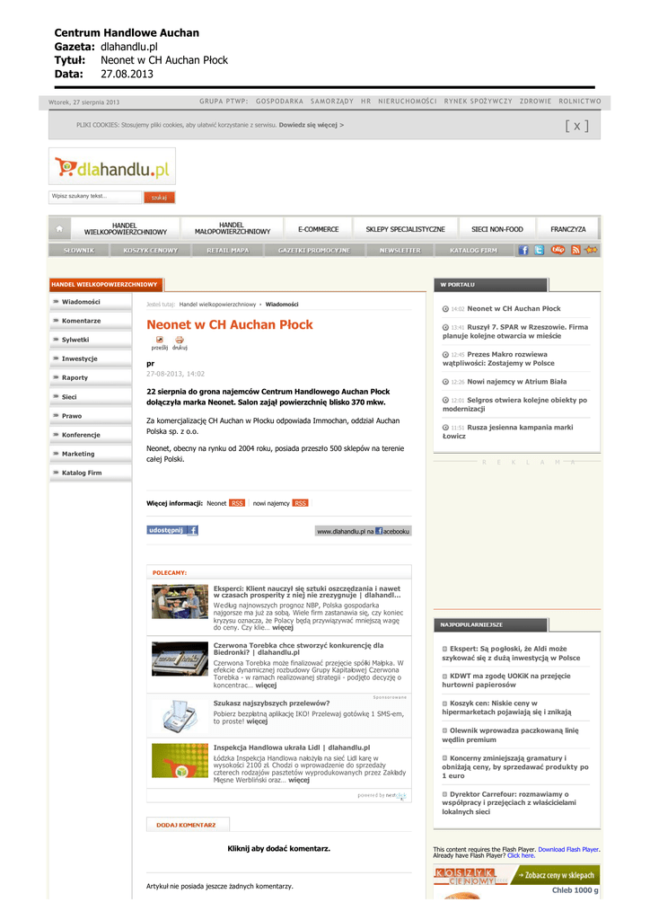 Centrum Handlowe Auchan Gazeta: dlahandlu.pl Tytu³: Neonet w CH Auchan P³ock Data: 27.08.2013 GRUPA PTWP: Wtorek, 27 sierpnia 2013 GOSPODARKA S A M O R ZĄD Y HR N I E R U C H O M OŚ C I R Y N E K S P OŻ Y W C Z Y ZDROWIE ROLNICTWO [x] PLIKI COOKIES: Stosujemy pliki cookies, aby ułatwić korzystanie z serwisu. Dowiedz się więcej > Wpisz szukany tekst... HANDEL WIELKOPOWIERZCHNIOWY Wiadomości Komentarze Jesteś tutaj: Handel wielkopowierzchniowy Wiadomości 14:02 Neonet w CH Auchan Płock 13:41 Ruszył 7. SPAR w Rzeszowie. Firma planuje kolejne otwarcia w mieście Sylwetki Inwestycje Raporty Sieci Prawo Konferencje Marketing Katalog Firm Neonet w CH Auchan Płock 12:45 Prezes Makro rozwiewa wątpliwości: Zostajemy w Polsce pr 27-08-2013, 14:02 12:26 22 sierpnia do grona najemców Centrum Handlowego Auchan Płock dołączyła marka Neonet. Salon zajął powierzchnię blisko 370 mkw. Za komercjalizację CH Auchan w Płocku odpowiada Immochan, oddział Auchan Polska sp. z o.o. Neonet, obecny na rynku od 2004 roku, posiada przeszło 500 sklepów na terenie całej Polski. Nowi najemcy w Atrium Biała 12:01 Selgros otwiera kolejne obiekty po modernizacji 11:51 Rusza jesienna kampania marki Łowicz R E K L A M A Więcej informacji: Neonet RSS nowi najemcy RSS udostępnij www.dlahandlu.pl na acebooku POLECAMY: Eksperci: Klient nauczył się sztuki oszczędzania i nawet w czasach prosperity z niej nie zrezygnuje | dlahandl… Według najnowszych prognoz NBP, Polska gospodarka najgorsze ma już za sobą. Wiele firm zastanawia się, czy koniec kryzysu oznacza, że Polacy będą przywiązywać mniejszą wagę do ceny. Czy klie… więcej Czerwona Torebka chce stworzyć konkurencję dla Biedronki? | dlahandlu.pl Czerwona Torebka może finalizować przejęcie spółki Małpka. W efekcie dynamicznej rozbudowy Grupy Kapitałowej Czerwona Torebka - w ramach realizowanej strategii - podjęto decyzję o koncentrac… więcej Ekspert: Są pogłoski, że Aldi może szykować się z dużą inwestycją w Polsce KDWT ma zgodę UOKiK na przejęcie hurtowni papierosów Sponsorowane Szukasz najszybszych przelewów? Pobierz bezpłatną aplikację IKO! Przelewaj gotówkę 1 SMS-em, to proste! więcej Koszyk cen: Niskie ceny w hipermarketach pojawiają się i znikają Olewnik wprowadza paczkowaną linię wędlin premium Inspekcja Handlowa ukrała Lidl | dlahandlu.pl Łódzka Inspekcja Handlowa nałożyła na sieć Lidl karę w wysokości 2100 zł. Chodzi o wprowadzenie do sprzedaży czterech rodzajów pasztetów wyprodukowanych przez Zakłady Mięsne Werbliński oraz… więcej Koncerny zminiejszają gramatury i obniżają ceny, by sprzedawać produkty po 1 euro Dyrektor Carrefour: rozmawiamy o współpracy i przejęciach z właścicielami lokalnych sieci Kliknij aby dodać komentarz. Artykuł nie posiada jeszcze żadnych komentarzy. This content requires the Flash Player. Download Flash Player. Already have Flash Player? Click here. Chleb 1000 g Centrum Handlowe Auchan Gazeta: dlahandlu.pl Tytu³: Neonet w CH Auchan P³ock Data: 27.08.2013 Cena średnia: 3,05 Piotr i Paweł: 4,60 Stokrotka: 2,45 orzechy laskowe łuskane [kg] Cena średnia: 28,25 Cena maksymalna: 30,00 Cena minimalna: 27,00 Prezes Makro rozwiewa wątpliwości: Zostajemy w Polsce Rusza jesienna kampania marki Łowicz Pelé nowym globalnym ambasadorem marki Subway Rovema: optymalizacji produkcji żywności jest działaniem wielokryterialnym Czy popierasz zakaz handlu w niedzielę? j Nie mam zdania k l m n j Tak, "niedziela w polskiej tradycji jest k l m n dniem świętym i rodzinnym" j Nie, to przyczyni się do wzrostu k l m n bezrobocia Strona główna Redakcja portalu O PTWP Kontakty Korzystanie z serwisu Polityka prywatności Polityka cookies Moduły informacji Reklama Partnerzy RSS Copyright (c) PTWP 2013