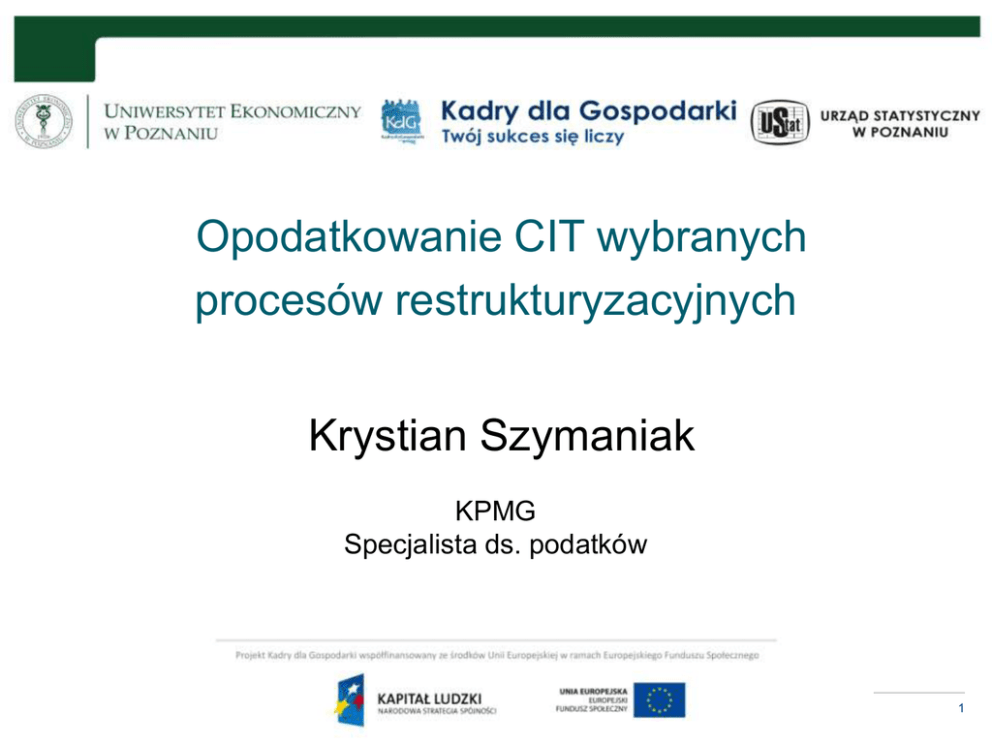 Opodatkowanie CIT wybranych procesów restrukturyzacyjnych Krystian Szymaniak KPMG Specjalista ds. podatków 1 Największe transakcje M&A ostatnich lat Pozycja Podmiot przejmowany Kupujący Sprzedający Wartość transakcji (mln PLN) 1 Bank BZ WBK + pakiety udziałów w pozostałych spółkach AIB w Polsce (m.in. BZ WBK AM) Banco Santander AIB 16 500 2 Polkomtel SA Zygmunt Solorz-Żak (Spartan Capital Holdings sp. z o.o.) PKN Orlen SA, PGE SA, KGHM SA, Vodafone, Węglokoks SA 15 100 3 Telewizja Polsat SA Cyfrowy Polsat SA Zygmunt Solorz-Żak, Heronim Ruta, Karswell Ltd, Sensor Overseas Ltd 3 900 4 Górnośląski Zakład Energetyczny SA Tauron Polska Energia SA Vattenfall AB 3 600 5 Vattenfall Heat Poland SA PGNiG SA Vattenfall AB 3 000 6 TP Emitel sp. z o.o Montagu Private Equity(EM Bidco sp. z o.o.) Telekomunikacja Polska SA 1 700 7 SPEC SA Dalkia Polska SA Miasto Stołeczne Warszawa 1 400 8 Żabka Polska SA Penta Investments 1 400 9 10 Grupa Tradis Telefonia Dialog SA Mid Europa Partners (Lontano Investments) Eurocash SA Netia SA Emperia SA KGHM SA 1 100 1 000 Źródło: http://www.forbes.pl/rankingi/najwieksze-przejecia-2011,23715 © 2015 KPMG Tax M.Michna sp.k. jest polską spółką komandytową i członkiem sieci KPMG składającej się z niezależnych spółek członkowskich stowarzyszonych z KPMG International Cooperative (“KPMG International”), podmiotem prawa szwajcarskiego. Wszelkie prawa zastrzeżone. Wydrukowano w Polsce. 2 Największe transakcje c.d. Pozycja Podmiot przejmowany Kupujący Sprzedający Wartość transakcji (mln PLN) 1 Quadra FNX Mining Ltd. KGHM Polska Miedź S.A. inwestorzy giełdowi 9 700 2 Kredyt Bank S.A. Banco Santander S.A. Grupa KBC 4 300 3 TUiR Warta S.A. Talanx International AG (70 proc.) i Meiji Yasuda (30 proc.) Grupa KBC 3 500 4 Polbank EFG S.A. Raiffeisen EFG Eurobank Ergasias 1 900 5 TU Europa S.A. Talanx International AG (50 proc.) i Meiji Yasuda (33,5 proc.) Getin Holding i inwestorzy giełdowi 1 500 6 Elektrownie Rybnik S.A., ZEW Kogeneracja S.A. 7 Mondi Packaging Paper Świecice S.A. Grupa Mondi inwestorzy giełdowi 1 200 8 BGŻ S.A. Rabobank Skarb Państwa, inwestorzy giełdowi 1 180 9 N-Vision BV (poprzednio właściciel 52,45 proc. akcji TVN S.A.) Grupa Canal+ ITI Group 1 000 10 Grupa Onet S.A. Ringier Axel Springer Media AG TVN S.A. 956 Grupa Electricite de France EnBW Energie Baden-Wurttemberg AG 1 300 Źródło: http://www.forbes.pl/najwieksze-przejecia-w-polsce-ranking-najwiekszych-przejec-2012,ranking,139525,1,1.html © 2015 KPMG Tax M.Michna sp.k. jest polską spółką komandytową i członkiem sieci KPMG składającej się z niezależnych spółek członkowskich stowarzyszonych z KPMG International Cooperative (“KPMG International”), podmiotem prawa szwajcarskiego. Wszelkie prawa zastrzeżone. Wydrukowano w Polsce. 3 Metody łączenia spółek kapitałowych Spółka przejmowana Upstream merger Łączenie przez przejęcie Łączenie przez przejęcie Spółka przejmowana Spółka przejmująca Downstream merger (reverse merger) Spółka przejmowana Spółka przejmowana Nowa spółka Łączenie przez zawiązanie nowej spółki Spółka przejmująca Łączenie przez zawiązanie nowej spółki © 2015 KPMG Tax M.Michna sp.k. jest polską spółką komandytową i członkiem sieci KPMG składającej się z niezależnych spółek członkowskich stowarzyszonych z KPMG International Cooperative (“KPMG International”), podmiotem prawa szwajcarskiego. Wszelkie prawa zastrzeżone. Wydrukowano w Polsce. 4 Metody łączenia spółek kapitałowych i osobowych Spółka przejmująca Spółka przejmowana Spółka przejmowana Upstream merger Spółka przejmowana Nowa spółka (spółka przejmująca) Łączenie przez zawiązanie nowej spółki © 2015 KPMG Tax M.Michna sp.k. jest polską spółką komandytową i członkiem sieci KPMG składającej się z niezależnych spółek członkowskich stowarzyszonych z KPMG International Cooperative (“KPMG International”), podmiotem prawa szwajcarskiego. Wszelkie prawa zastrzeżone. Wydrukowano w Polsce. 5 Metody podziału spółek kapitałowych Podziałowi podlegać mogą jedynie spółki kapitałowe (art. 528 KSH). W wyniku podziału majątek spółki dzielonej przenoszony jest na dwie lub więcej spółek kapitałowych W KSH zostały sklasyfikowane 4 modele podziału (art. 529 1 KSH): Podział przez przejęcie Podział przez zawiązanie nowych spółek Wspólnicy Udziały Akcje Spółka dzielona Wspólnicy Udziały Cały majątek spółki dzielonej Istniejąca spółka przejmująca Istniejąca spółka przejmująca Udziały Akcje Akcje Spółka dzielona Udziały Akcje Cały majątek spółki dzielonej Nowo zawiązana spółka przejmująca Nowo zawiązana spółka przejmująca © 2015 KPMG Tax M.Michna sp.k. jest polską spółką komandytową i członkiem sieci KPMG składającej się z niezależnych spółek członkowskich stowarzyszonych z KPMG International Cooperative (“KPMG International”), podmiotem prawa szwajcarskiego. Wszelkie prawa zastrzeżone. Wydrukowano w Polsce. 6 Metody podziału spółek kapitałowych Podział przez przejęcie i zawiązanie nowej spółki Udziały Akcje Podział przez wydzielenie Wspólnicy Wspólnicy Spółka dzielona Spółka dzielona Udziały Cały majątek spółki dzielonej Istniejąca spółka przejmująca Nowo zawiązana spółka przejmująca Akcje Udziały Akcje Część majątku spółki dzielonej Istniejąca lub nowo zawiązana spółka przejmująca © 2015 KPMG Tax M.Michna sp.k. jest polską spółką komandytową i członkiem sieci KPMG składającej się z niezależnych spółek członkowskich stowarzyszonych z KPMG International Cooperative (“KPMG International”), podmiotem prawa szwajcarskiego. Wszelkie prawa zastrzeżone. Wydrukowano w Polsce. 7 Opodatkowanie wybranych transakcji restrukturyzacyjnych Ordynacja podatkowa Zagadnienie sukcesji prawno-podatkowej •✓ •☓ •✓ Łączenie Przekształcenie Podział Podział •✓ * Gd