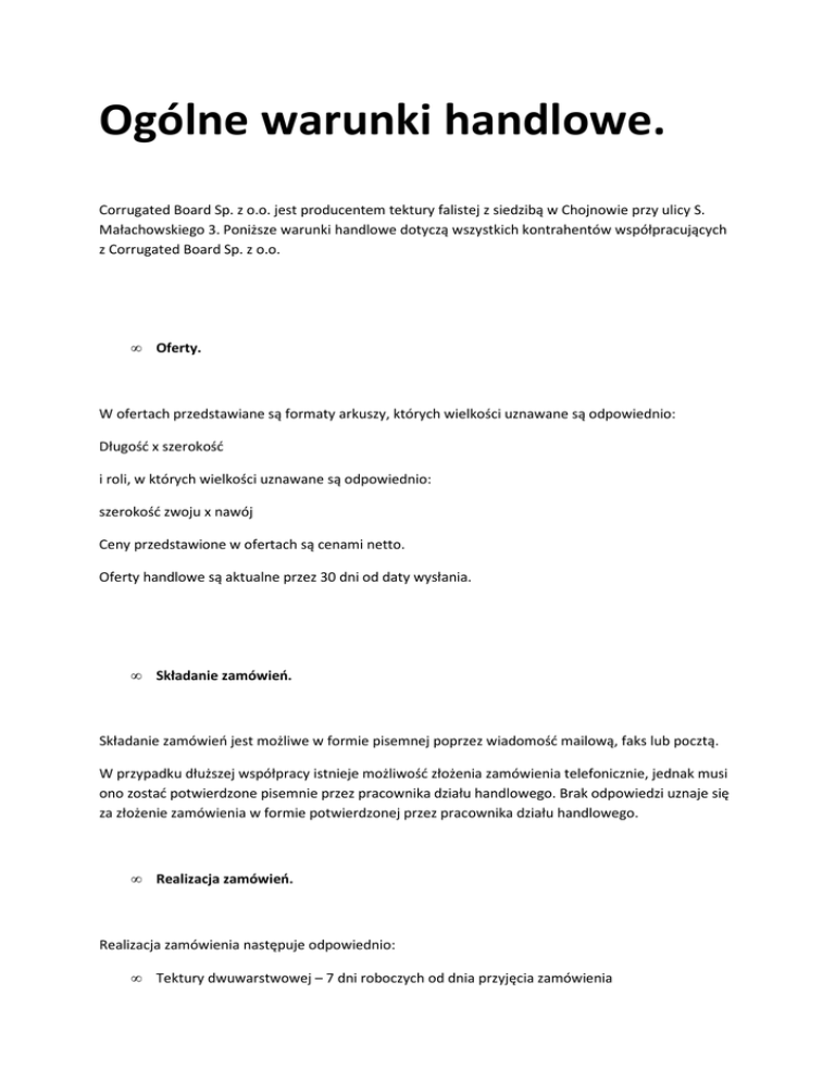 Ogólne warunki handlowe. Corrugated Board Sp. z o.o. jest producentem tektury falistej z siedzibą w Chojnowie przy ulicy S. Małachowskiego 3. Poniższe warunki handlowe dotyczą wszystkich kontrahentów współpracujących z Corrugated Board Sp. z o.o. • Oferty. W ofertach przedstawiane są formaty arkuszy, których wielkości uznawane są odpowiednio: Długość x szerokość i roli, w których wielkości uznawane są odpowiednio: szerokość zwoju x nawój Ceny przedstawione w ofertach są cenami netto. Oferty handlowe są aktualne przez 30 dni od daty wysłania. • Składanie zamówień. Składanie zamówień jest możliwe w formie pisemnej poprzez wiadomość mailową, faks lub pocztą. W przypadku dłuższej współpracy istnieje możliwość złożenia zamówienia telefonicznie, jednak musi ono zostać potwierdzone pisemnie przez pracownika działu handlowego. Brak odpowiedzi uznaje się za złożenie zamówienia w formie potwierdzonej przez pracownika działu handlowego. • Realizacja zamówień. Realizacja zamówienia następuje odpowiednio: • Tektury dwuwarstwowej – 7 dni roboczych od dnia przyjęcia zamówienia • Tektury trzywarstwowej - 10 dni roboczych od dnia przyjęcia zamówienia W przypadku zakupu tektury z płatnością w formie przedpłaty realizacja zamówienia następuje odpowiednio: • • Tektury dwuwarstwowej – 7 dni roboczych od dnia zaksięgowania kwoty na koncie producenta Tektury trzywarstwowej - 10 dni roboczych od dnia zaksięgowania kwoty na koncie producenta Podane terminy to średni czas realizacji, który może ulec zmianie w przypadku wystąpienia siły wyższej oraz nieprzewidzianych przeszkód wynikłych po zawarciu umowy, za które Corrugated Board Sp. z o.o. nie ponosi odpowiedzialności (m.in. przerwy w produkcji, przeszkody w ruchu drogowym lub zerwanie umowy przez przewoźnika). • Transport. Minimalna wielkość zamówienia, jaką dostarczamy do klienta to 5000m2lub 8 palet tektury 3 warstwowej. W przypadku mniejszych ilości możliwy jest odbiór własny w zakładzie produkcyjnym mieszczącym się w Polkowicach przy ul. Kopalnianej 13 lub wysyłka kurierem na koszt Klienta. Towar jest dostarczany do siedziby przedsiębiorstwa składającego zamówienie, chyba że na zamówieniu widnieje wyraźna informacja o innym miejscu dostawy. • Termin dostawy. Termin dostawy jest ustalany na dany tydzień roku, data dzienna jest podawana jedynie orientacyjnie i również wskazuje, w którym tygodniu roku towar zostanie dostarczony. • Płatność. Płatność następuje w terminie ustalonym między Klientem i pracownikiem działu handlowego. Zmiana terminu płatności musi być potwierdzony w formie pisemnej. Ustalenia ustne nie są podstawą do późniejszej płatności za towar. W przypadku zalegania z płatnością zastrzegamy sobie prawo do wstrzymania wysyłki kolejnego zamówienia do czasu, aż zaległe zobowiązania nie zostaną uregulowane. Termin płatności jest określony na fakturze VAT. Korekty faktury VAT są dokonywane po uwzględnieniu reklamacji. • Reklamacje. W przypadku stwierdzenia wady transportowej, jakościowej lub ilościowej towaru dostarczonego przez Corrugated Board Sp. z o.o., Kupującemu przysługuje prawo złożenia reklamacji. O fakcie reklamacji należy powiadomić Dział Handlowy Corrugated Board Sp. z o.o. Reklamację wraz ze zgromadzoną dokumentacją należy dostarczyć do Corrugated Board Sp. z o.o. w Polkowicach, przekazując ją Sprzedawcy osobiście, pocztą, mailowo lub za pomocą faksu. Zawiadomienia telefoniczne o reklamacji traktowane są jedynie, jako wstępna informacja i nie powodują wszczęcia procesu reklamacyjnego. Reklamacje transportowe Transport towaru objęty jest ubezpieczeniem do momentu przybycia samochodu wraz z towarem do magazynu odbiorcy. Rozładunek towaru przeprowadzany jest już przez odbiorcę, na jego ryzyko i odpowiedzialność. Towar musi być dokładnie sprawdzony (pod względem zgodności ilościowej i jakościowej) przez odbiorcę w momencie rozładunku z samochodu. W przypadku stwierdzenia braków ilościowych lub niezgodności z zamówieniem, konieczna jest adnotacja na liście przewozowym (lub innym dokumencie dostawy). Taka adnotacja musi być również poświadczona przez przewoźnika. Bez podpisu kierowcy na liście przewozowym reklamacje nie będą uwzględniane. W przypadku stwierdzenia wady transportowej (uszkodzenia towaru podczas transportu) dostawy, należy umieścić notatkę na liście przewozowym (lub innym dokumencie dostawy), w obecności kierowcy i z jego podpisem. W przypadku uszkodzeń dostarczonego towaru konieczne jest również wykonanie jego zdjęć. W celu zgłoszenia reklamacji należy zgromadzić i przesłać do dostawcy następującą dokumentację: - list przewozowy (lub inny dokument dostawy) z adnotacją o uszkodzeniach lub brakach; - zdjęcia uszkodzonego towaru; - ilość brakującego towaru i sposób jego stwierdzenia; - w przypadku uszkodzeń częściowych – ilość kilogramów odrzuconych z palety lub roli W przypadku uszkodzenia palet należy postępować tak jak w przypadku uszkodzenia towaru. Bez powyższych danych reklamacje transportowe lub ilościowe nie będą rozstrzygane. Reklamacje, jakości towaru Odbiorca składając zamówienie oświadcza, że ma pełną wiedzę na temat, jakości i sposobu dostarczenia tektury (np. format, kierunek fali, sposób pakowania). Dane te powinny zostać umieszczone na zamówieniu. Bez takiej informacji na złożonym zamówieniu Odbiorca nie ma podstaw do składania reklamacji. W przypadku wady widocznej ( zamoczenie lub zabrudzenie tektury, kołyski, złego wymiaru lub ilości) reklamacje należy zgłaszać natychmiast podczas odbioru towar. W przypadku wystąpienia wady ukrytej Klient ma prawo do złożenia reklamacji w terminie do 7 dni roboczych od daty dostawy. Po upływie tego terminu reklamacje nie będą uwzględniane. W protokole reklamacji należy umieścić: - opis przedmiotu 
