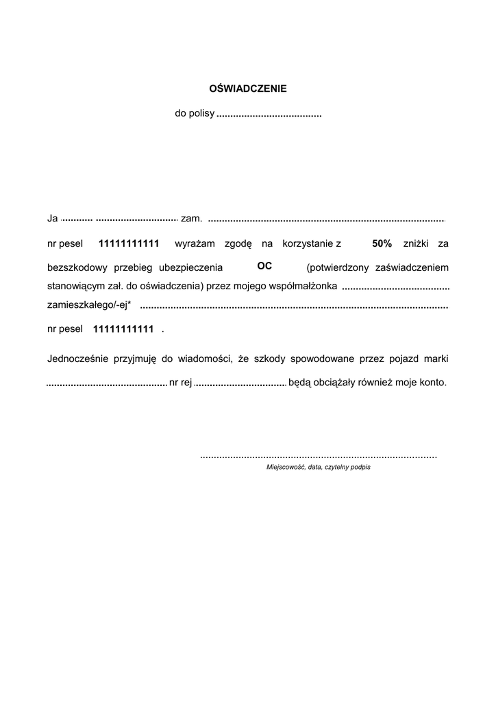 OŚWIADCZENIE do polisy ................................................ ...................... ........................................ Ja zam. ........................................................................................................ nr pesel 11111111111 wyrażam zgodę na korzystanie z bezszkodowy przebieg ubezpieczenia OC 50% zniżki za (potwierdzony zaświadczeniem stanowiącym zał. do oświadczenia) przez mojego współmałżonka ........................................................ zamieszkałego/-ej* ................................................................................................................................. nr pesel 11111111111 . Jednocześnie przyjmuję do wiadomości, że szkody spowodowane przez pojazd marki nr rej będą obciążały również moje konto. ................................................................................ .......................................... ...................................................................................... Miejscowość, data, czytelny podpis