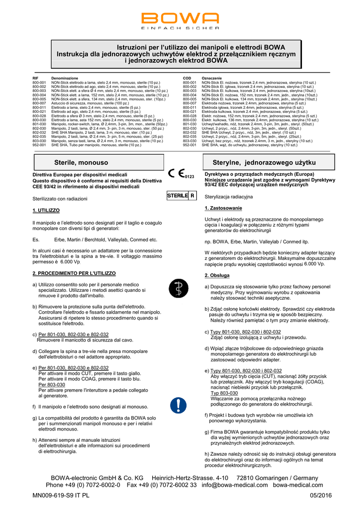 Istruzioni per l’utilizzo dei manipoli e elettrodi BOWA Instrukcja dla jednorazowych uchwytów elektrod z przełącznikiem ręcznym i jednorazowych elektrod BOWA RIF 800-001 800-002 800-003 800-004 800-005 800-007 800-011 800-021 800-028 800-030 801-030 802-030 802-032 802-035 803-030 952-001 Denominazione NON-Stick elettrodo a lama, stelo 2,4 mm, monouso, sterile (10 pz.) NON-Stick elettrodo ad ago, stelo 2,4 mm, monouso, sterile (10 pz.) NON-Stick elett. a sfera Ø 4 mm, stelo 2,4 mm, monouso, sterile (10 pz.) NON-Stick elett. a lama, 152 mm, stelo 2,4 mm, monouso, sterile (10 pz.) NON-Stick elett. a sfera, 134 mm, stelo 2,4 mm, monouso, ster. (10pz.) Astuccio di sicurezza, monouso, sterile (100 pz.) Elettrodo a lama, stelo 2,4 mm, monouso, sterile (5 pz.) Elettrodo ad ago, stelo 2,4 mm, monouso, sterile (5 pz.) Elettrodo a sfera Ø 3 mm, stelo 2,4 mm, monouso, sterile (5 pz.) Elettrodo a lama, asta 152 mm, stelo 2,4 mm, monouso, sterile (5 pz.) Manipolo, rocker-switch, lama, Ø 2,4mm, 3-pin, 3m, mon., sterile (50pz.) Manipolo, 2 tasti, lama, Ø 2,4 mm, 3- pin, 3 m, monouso, ster. (50 pz.) SHE SHA Manipolo, 2 tasti, lama, 3 m, monouso, ster. (10 pz.) Manipolo, 2 tasti, lama, Ø 2,4 mm, 3- pin, 5 m, monouso, ster. (25 pz) Manipolo, senza tasti, lama, Ø 2,4 mm, 3 m, monouso, sterile (10 pz.) SHE SHA, Tubo per manipolo, monouso, sterile (10 pz.) COD 800-001 800-002 800-003 800-004 800-005 800-007 800-011 800-021 800-028 800-030 801-030 802-030 802-032 802-035 803-030 952-001 Sterile, monouso Direttiva Europea per dispositivi medicali Questo dispositivo è conforme ai requisiti della Direttiva CEE 93/42 in riferimento ai dispositivi medicali Oznaczenie NON-Stick El. nożowa, trzonek 2,4 mm, jednorazowa, sterylna (10 szt.) NON-Stick El. igłowa, trzonek 2.4 mm, jednorazowa, sterylna (10 szt.) NON-Stick El. kulkowa, trzonek 2.4 mm, jednorazowa, sterylna (10szt.) NON-Stick El. nożowa, 152 mm, trzonek 2.4 mm, jedn., sterylna (10szt.) NON-Stick El. kulkowa, 134 mm, trzonek 2.4mm, jedn., sterylna (10szt.) Elektroda nożowa, trzonek 2.4mm, jednorazowa, sterylna (5 szt.) Elektroda igłowa, trzonek 2.4mm, jednorazowa, sterylna (5 szt.) Elektroda kulkowa, trzonek 2.4 mm, jednorazowa, sterylna (5 szt.) Elektr. nożowa, 152 mm, trzonek 2.4 mm, jednorazowa, sterylna (5 szt.) Elektr. kulkowa, 136 mm, trzonek 2.4mm, jednorazowa, sterylna (10 szt.) Uchwyt/wahadło, nóż, trzonek 2.4mm, 3-pin, 3m, jedn., steryl. (50szt.) Uchwyt, 2 przyc., nóż, 2.4mm, 3-pin, 3m, jedn., steryl. (50szt.) SHE SHA Uchwyt, 2 przyc., nóż, 3m, jedn., steryl. (10 szt.) Uchwyt, 2 przyc., nóż, 2.4mm, 3-pin, 5m, jedn., steryl. (25szt.) Uchwyt, bez przyc., nóż, trzonek 2.4mm, 3 m, jedn., sterylny (10 szt.) SHE SHA, wąż, do uchwytu, jednorazowy, sterylny (10 szt.) Sterylne, jednorazowego użytku 0123 Dyrektywa o przyrządach medycznych (Europa) Niniejsze urządzenie jest zgodne z wymogami Dyrektywy 93/42 EEC dotyczącej urządzeń medycznych Sterilizzato con radiazioni Sterylizacja radiacyjna 1. UTILIZZO 1. Zastosowanie Il manipolo e l’elettrodo sono designati per il taglio e coagulo monopolare con diversi tipi di generatori: Uchwyt i elektrody są przeznaczone do monopolarnego cięcia i koagulacji w połączeniu z różnymi typami generatorów do elektrochirurgii Es. np. BOWA, Erbe, Martin, Valleylab / Conmed itp. Erbe, Martin / Berchtold, Valleylab, Conmed etc. In alcuni casi è necessario un adattatore per la connessione tra l'elettrobisturi e la spina a tre-vie. Il voltaggio massimo permesso è 6.000 Vp. W niektórych przypadkach będzie konieczny adapter łączący z generatorem do elektrochirurgii. Maksymalne dopuszczalne napięcie prądu wysokiej częstotliwości wynosi 6.000 Vp. 2. PROCEDIMENTO PER L'UTILIZZO 2. Obsługa a) Utilizzo consentito solo per il personale medico specializzato. Utilizzare i metodi asettici quando si rimuove il prodotto dall'imballo. a) Dopuszcza się stosowanie tylko przez fachowy personel medyczny. Przy wyjmowaniu wyrobu z opakowania należy stosować techniki aseptyczne. b) Rimuovere la protezione sulla punta dell'elettrodo. Controllare l'elettrodo e fissarlo saldamente nel manipolo. Assicurarsi di ripetere lo stesso procedimento quando si sostituisce l'elettrodo. b) Zdjąć osłonę końcówki elektrody. Sprawdzić czy elektroda pasuje do uchwytu i trzyma się w sposób bezpieczny. Należy również pamiętać o tym przy zmianie elektrody. c) Per 801-030, 802-030 e 802-032 Rimuovere il manicotto di sicurezza dal cavo. d) Collegare la spina a tre-vie nella presa monopolare dell'elettrobisturi o nel adattore appropriato. e) Per 801-030, 802-030 e 802-032 Per attivare il modo CUT, premere il tasto giallo. Per attivare il modo COAG, premere il tasto blu. Per 803-030 Per attivare premere l'interuttore a pedale collegato al generatore. f) Il manipolo e l’elettrodo sono designati al monouso. g) La compatibilità del prodotto è garantita da BOWA solo per i summenzionati manipoli monouso e per i relativi elettrodi monouso. h) Attenersi sempre al manuale istruzioni dell'elettrobisturi e alle informazioni sui procedimenti di elettrochirurgia. c) Typy 801-030, 802-030 i 802-032 Zdjąć osłonę izolującą z uchwytu i przewodu. d) Wpiąć złącze trójbolcowe do odpowiedniego gniazda monopolarnego generatora do elektrochirurgii lub zastosować odpowiedni adapter. e) Typy 801-030, 802-030 i 802-032 Aby włączyć tryb cięcia (CUT), nacisnąć żółty przycisk lub przełącznik. Aby włączyć tryb koagulacji (COAG), nacisnąć niebieski przycisk lub przełącznik. Typ 803-030 Włączanie za pomocą przełącznika nożnego podłączonego do generatora do elektrochirurgii. f) Projekt i budowa tych wyrobów nie umożliwia ich ponownego wykorzystania. g) Firma BOWA gwarantuje kompatybilność produktu tylko dla wyżej wymienionych uchwytów jednorazowych oraz przynależnych elektrod jednorazowych. h) Zawsze należy odnosić się do instrukcji obsługi generatora do elektrochirurgii oraz do info