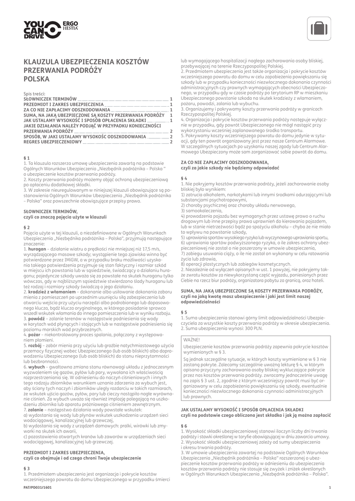 KLAUZULA UBEZPIECZENIA KOSZTÓW PRZERWANIA PODRÓŻY POLSKA Spis treści: SŁOWNICZEK TERMINÓW PRZEDMIOT I ZAKRES UBEZPIECZENIA ZA CO NIE ZAPŁACIMY ODSZKODOWANIA SUMA, NA JAKĄ UBEZPIECZONE SĄ KOSZTY PRZERWANIA PODRÓŻY JAK USTALAMY WYSOKOŚĆ I SPOSÓB OPŁACENIA SKŁADKI JAKIE DZIAŁANIA NALEŻY PODJĄĆ W PRZYPADKU KONIECZNOŚCI PRZERWANIA PODRÓŻY SPOSÓB, W JAKI USTALAMY WYSOKOŚC ODSZKODOWANIA REGRES UBEZPIECZENIOWY 1 1 1 1 1 2 2 2 §1 1. Ta klauzula rozszerza umowę ubezpieczenia zawartą na podstawie Ogólnych Warunków Ubezpieczenia „Niezbędnik podróżnika – Polska ” o ubezpieczenie kosztów przerwania podróży. 2. Koszty przerwania podróży możemy objąć ochroną ubezpieczeniową po opłaceniu dodatkowej składki. 3. W zakresie nieuregulowanym w niniejszej klauzuli obowiązujące są postanowienia Ogólnych Warunków Ubezpieczenia „Niezbędnik podróżnika – Polska” oraz powszechnie obowiązujące przepisy prawa. SŁOWNICZEK TERMINÓW, czyli co znaczą pojęcia użyte w klauzuli §2 Pojęcia użyte w tej klauzuli, a niezdefiniowane w Ogólnych Warunkach Ubezpieczenia „Niezbędnika podróżnika – Polska”, przyjmują następujące znaczenie: 1. huragan – działanie wiatru o prędkości nie mniejszej niż 17,5 m/s, wyrządzającego masowe szkody; wystąpienie tego zjawiska winno być potwierdzone przez IMiGW, a w przypadku braku możliwości uzyskania takiego potwierdzenia przyjmuje się stan faktyczny i rozmiar szkód w miejscu ich powstania lub w sąsiedztwie, świadczący o działaniu huraganu; pojedyncze szkody uważa się za powstałe na skutek huraganu tylko wówczas, gdy w najbliższym sąsiedztwie stwierdzono ślady huraganu lub też rodzaj i rozmiary szkody świadczą o jego działaniu. 2. kradzież z włamaniem – dokonanie albo usiłowanie dokonania zaboru mienia z pomieszczeń po uprzednim usunięciu siłą zabezpieczenia lub otwarciu wejścia przy użyciu narzędzi albo podrobionego lub dopasowanego klucza, bądź klucza oryginalnego, w którego posiadanie sprawca wszedł wskutek włamania do innego pomieszczenia lub w wyniku rozboju. 3. powódź – zalanie terenów w następstwie podniesienia się wody w korytach wód płynących i stojących lub w następstwie podniesienia się poziomu morskich wód przybrzeżnych. 4. pożar – niekontrolowany proces spalania, połączony z występowaniem płomieni. 5. rozbój – zabór mienia przy użyciu lub groźbie natychmiastowego użycia przemocy fizycznej wobec Ubezpieczonego (lub osób bliskich) albo doprowadzeniu Ubezpieczonego (lub osób bliskich) do stanu nieprzytomności lub bezbronności. 6. wybuch – gwałtowna zmiana stanu równowagi układu z jednoczesnym wyzwoleniem się gazów, pyłów lub pary, wywołana ich właściwością rozprzestrzeniania się. W odniesieniu do naczyń ciśnieniowych i innych tego rodzaju zbiorników warunkiem uznania zdarzenia za wybuch jest, aby ściany tych naczyń i zbiorników uległy rozdarciu w takich rozmiarach, że wskutek ujścia gazów, pyłów, pary lub cieczy nastąpiło nagłe wyrównanie ciśnień. Za wybuch uważa się również implozję polegającą na uszkodzeniu zbiornika lub aparatu próżniowego ciśnieniem zewnętrznym. 7. zalanie – następstwo działania wody powstałe wskutek: a) wydostania się wody lub płynów wskutek uszkodzenia urządzeń sieci wodociągowej, kanalizacyjnej lub grzewczej, b) wydostania się wody z urządzeń domowych: pralki, wirówki lub zmywarki na skutek ich awarii, c) pozostawienia otwartych kranów lub zaworów w urządzeniach sieci wodociągowej, kanalizacyjnej lub grzewczej. PRZEDMIOT I ZAKRES UBEZPIECZENIA, czyli co obejmuje i od czego chroni Twoje ubezpieczenie §3 1. Przedmiotem ubezpieczenia jest organizacja i pokrycie kosztów wcześniejszego powrotu do domu Ubezpieczonego w przypadku śmierci PAT/PD031/1601 lub wymagającego hospitalizacji nagłego zachorowania osoby bliskiej, przebywającej na terenie Rzeczypospolitej Polskiej. 2. Przedmiotem ubezpieczenia jest także organizacja i pokrycie kosztów wcześniejszego powrotu do domu w celu zapobieżenia powiększaniu się szkody lub w przypadku konieczności niezwłocznego dokonania czynności administracyjnych czy prawnych wymagających obecności Ubezpieczonego, w przypadku gdy w czasie podróży po terytorium RP w mieszkaniu Ubezpieczonego powstanie szkoda na skutek kradzieży z włamaniem, pożaru, powodzi, zalania lub wybuchu. 3. Organizujemy i pokrywamy koszty przerwania podróży w granicach Rzeczypospolitej Polskiej. 4. Organizacja i pokrycie kosztów przerwania podróży następuje wyłącznie w przypadku, gdy powrót Ubezpieczonego nie mógł nastąpić przy wykorzystaniu wcześniej zaplanowanego środka transportu. 5. Pokrywamy koszty wcześniejszego powrotu do domu jedynie w sytuacji, gdy ten powrót organizowany jest przez nasze Centrum Alarmowe. W szczególnych sytuacjach po uzyskaniu naszej zgody lub Centrum Alarmowego Ubezpieczony może sam zorganizować sobie powrót do domu. ZA CO NIE ZAPŁACIMY ODSZKODOWANIA, czyli za jakie szkody nie będziemy odpowiadać §4 1. Nie pokryjemy kosztów przerwania podróży, jeżeli zachorowanie osoby bliskiej było wynikiem: 1) zatrucia alkoholem, narkotykami lub innymi środkami odurzającymi lub substancjami psychotropowymi, 2) choroby psychicznej oraz choroby układu nerwowego, 3) samookaleczenia, 4) prowadzenia pojazdu bez wymaganych przez ustawę prawo o ruchu drogowym lub inne przepisy prawa uprawnień do kierowania pojazdem, lub w stanie nietrzeźwości bądź po spożyciu alkoholu – chyba że nie miało to wpływu na powstanie szkody, 5) uprawiania sportów wysokiego ryzyka lub wyczynowego uprawiania sportu, 6) uprawiania sportów podwyższonego ryzyka, o ile zakres ochrony ubezpieczeniowej nie został o nie poszerzony w umowie ubezpieczenia, 7) zabiegu usuwania ciąży, o ile nie został on wykonany w celu ratowania życia lub zdrowia, 8) operacji plastycznych lub zabiegów kosmetyczn