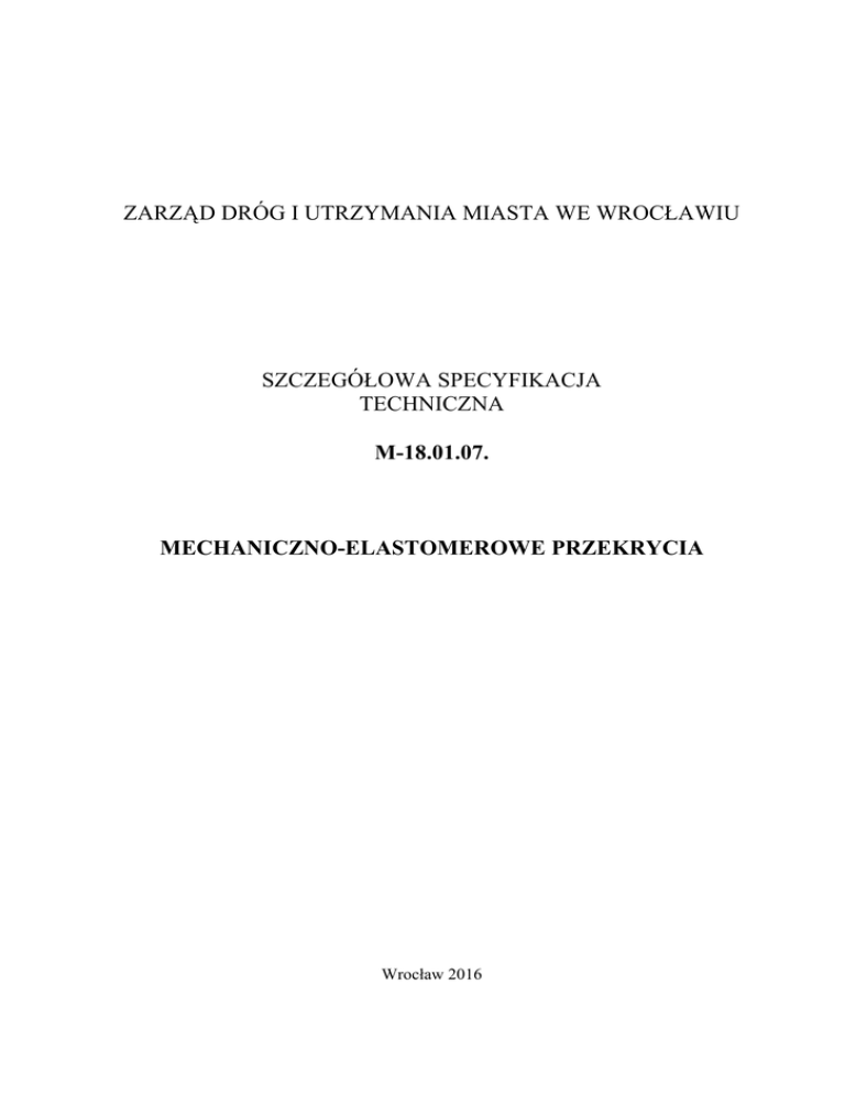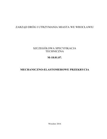 ZARZĄD DRÓG I UTRZYMANIA MIASTA WE WROCŁAWIU SZCZEGÓŁOWA SPECYFIKACJA TECHNICZNA M-18.01.07. MECHANICZNO-ELASTOMEROWE PRZEKRYCIA Wrocław 2016 1. Wstęp 1.1. Przedmiot ST Przedmiotem niniejszej Specyfikacji Technicznej są wymagania dotyczące wykonania i odbioru robót związanych z wykonaniem mostowych mechaniczno-elastomerowych przekryć dylatacyjnych w jezdni wiaduktu zachodniego w ciągu al. Armii Krajowej oraz estakady wjazdowej zachodniej w ciągu ul. Krakowskiej we Wrocławiu. 1.2. Zakres stosowania ST Specyfikacja Techniczna jest stosowana jako dokument przetargowy i kontraktowy przy zlecaniu i realizacji robót wymienionych w punkcie 1.1. 1.3. Zakres robót objętych ST Ustalenia zawarte w niniejszej specyfikacji dotyczą zasad prowadzenia robót związanych z wykonaniem i odbiorem mostowych mechaniczno-elastomerowych przekryć dylatacyjnych i obejmują montaŜ przekrycia w nawierzchni jezdni oraz w chodniku drogowego obiektu inŜynierskiego. 1.4. Określenia podstawowe 1.4.1. Mechaniczno-elastomerowe przekrycie dylatacyjne - dylatacja w jezdni składająca się z elastycznego materiału (nie termoplastycznego) na bazie modyfikowanego poliuretanu stosowanego jako masa zalewowa, który tworzy równieŜ powierzchnię jezdną, wzmocnionego metalową blachą nad szczeliną dylatacyjną i ewentualnie elementami stabilizującymi. 1.4.2. Przerwa dylatacyjna – przerwa w konstrukcji ustroju niosącego przenosząca przewidywane odkształcenia i przesunięcia tej konstrukcji. 1.4.3. Koryto pod dylatację (wnęka dylatacyjna) – przestrzeń wycięta w nawierzchni symetrycznie względem szczeliny dylatacyjnej, o szerokości uzaleŜnionej od przemieszczenia przenoszonego przez urządzenie dylatacyjne. 1.4.4. Primer – substancja spełniająca rolę środka gruntującego. 1.4.5. Masa zalewowa – elastyczny (nie termoplastyczny) materiał na bazie modyfikowanego poliuretanu do wypełniania koryta mechaniczno-elastomerowego przekrycia dylatacyjnego. 1.4.6. Stabilizator – blacha stalowa zabezpieczona przed korozją, zamykająca szczelinę dylatacyjną od góry i podtrzymująca jej wypełnienie. 1.4.7. Elementy stabilizujące – mechaniczne elementy składowe przekrycia dylatacyjnego zwiększające odporność wypełnienie z masy zalewowej na zmiany związane z przenoszeniem odkształceń. 1.4.8. Elementy zamocowania przekrycia - stalowe elementy konstrukcyjne zapewniające współpracę elastycznego wypełnienia koryta przekrycia dylatacyjnego z ustrojem niosącym obiektu inŜynierskiego. 1.4.9. Pozostałe określenia podstawowe są zgodne z obowiązującymi, odpowiednimi polskimi normami i z definicjami podanymi w OST DM.00.00.00 „Wymagania ogólne” pkt 1.4. 1.5.Ogólne wymagania dotyczące robót Ogólne wymagania dotyczące robót podano w OST DM.00.00.00 „Wymagania ogólne”, pkt 1.5. 2. Materiały 2.1. Ogólne wymagania dotyczące materiałów Ogólne wymagania dotyczące materiałów, ich pozyskiwania i składowania, podano w OST DM.00.00.00 „Wymagania ogólne” pkt 2. 2.2. Materiały do wykonania mechaniczno-elastomerowych przekryć dylatacyjnych 2.2.1. Zgodność materiałów z dokumentacją projektową Materiały do wykonania robót powinny być zgodne z ustaleniami dokumentacji projektowej, EAT lub AT. 2.2.2. Wymagania ogólne NaleŜy stosować urządzenie dylatacyjne, które jest oznakowane znakiem CE lub B, dla którego Wykonawca przedstawi deklarację zgodności z odpowiednią normą lub aprobatę techniczną. Urządzenie dylatacyjne powinno być wykonane zgodnie z rozporządzeniem Ministra Transportu i Gospodarki Morskiej z dnia 30 maja 2000 r. w sprawie warunków technicznych, jakim powinny odpowiadać obiekty inŜynierskie i ich usytuowanie. Zgodnie z rozporządzeniem urządzenie dylatacyjne powinno zapewnić: – szczelność połączenia, – równość nawierzchni, – swobodę odkształcenia ustroju nośnego obiektu, – zbliŜone warunki ruchu dla kół pojazdów w obrębie nawierzchni i dylatacji, – swobodę poziomych przemieszczeń zdylatowanych krawęŜników i odpowiednią osłonę szczelin w obrębie chodników. Urządzenie dylatacyjne powinno być nieprzerwane na całej szerokości pomostu w obrębie jezdni i chodników. Przejazd pojazdów przez zastosowane urządzenie dylatacyjne nie powinno generować większego hałasu niŜ przejazd pojazdów po nawierzchni drogowej. Zastosowana dylatacja powinna być przeznaczona do eksploatacji w warunkach ruchu cięŜkiego. 2.2.3. Stosowane materiały Do wykonania mechaniczno-elastomerowego przekrycia dylatacyjnego powinny być stosowane następujące materiały: – masa zalewowa (nie termoplastyczna) na bazie zmodyfikowanych poliuretanów; – elementy zamocowania przekrycia dylatacyjnego (kotwy rozporowe, stalowe kątowniki aŜurowe z elementami dystansującymi); – stabilizator; – elementy stabilizujące ze stali konstrukcyjnej z osłoną dla przesuwu powyŜej 30 mm; – materiał gruntujący (primer). 2.2.4. Masa zalewowa Masa zalewowa przeznaczona do wykonania mechaniczno-elastomerowego przekrycia dylatacyjnego jest materiałem na bazie zmodyfikowanego poliuretanu. Masa zalewowa powinna spełniać wymagania podane w tabeli 1. Tabela 1. Właściwości masy zalewowej Dane eksploatacyjne Twardość A wg Shora utwardzonego materiału Wytrzymałość na rozciąganie utwardzonego materiału Specyfikacje Techniczne EN ISO 868 w połączeniu z ISO 7819 WydłuŜenie przy zerwaniu utwardzonego materiału EN ISO 527-2 Zachowanie się w czasie poŜaru Odkształcenia spowodowane powstawaniem kolein EN 13501-1 Zgodność z EN 12697-22 po 30.000 cykli obciąŜenia w temperaturze 60°C EN ISO 527-2 Wynik 72 11 MPa (najmniejsza wartość średnia) 700 % (najmniejsza wartość średnia) E 1,8% (w odniesieniu do próbki o grubości 5 cm), jest to 0,9 mm w odniesieniu do grubości 50 mm Masa zalewowa jest odporna na działanie benzyny, olejów i alkaliów. Promieniowanie UV oraz oddziaływanie czynników atmosferycz