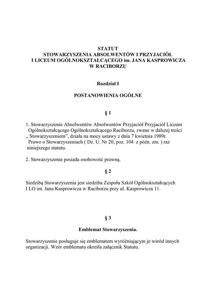 STATUT STOWARZYSZENIA ABSOLWENTÓW I PRZYJACIÓŁ I LICEUM OGÓLNOKSZTAŁCĄCEGO im. JANA KASPROWICZA W RACIBORZU Rozdział I POSTANOWIENIA OGÓLNE §1 1. Stowarzyszenie Absolwentów Absolwentów Przyjaciół Przyjaciół Liceum Ogólnokształcącego Ogólnokształcącego Raciborzu, zwane w dalszej treści ,, Stowarzyszeniem”, działa na mocy ustawy z dnia 7 kwietnia 1989r. Prawo o Stowarzyszeniach ( Dz. U. Nr 20, poz. 104 z późn. zm. ) raz niniejszego statutu. 2. Stowarzyszenie posiada osobowość prawną. §2 Siedzibą Stowarzyszenia jest siedziba Zespołu Szkół Ogólnokształcących I LO im. Jana Kasprowicza w Raciborzu przy ul. Kasprowicza 11. §3 Emblemat Stowarzyszenia. Stowarzyszenie posługuje się emblematem wyróżniającym je wśród innych organizacji. Wzór emblematu określa załącznik Statutu. §4 Możliwość zrzeszania się. Stowarzyszenie może być członkiem krajowych i międzynarodowych organizacji o podobnym celu działania. §5 Teren działania. Stowarzyszenie sowim działaniem obejmuje obszar Rzeczpospolitej Polskiej. Dla właściwego realizowania swoich celów Stowarzyszenie może prowadzić działalność poza granicami Rzeczpospolitej Polskiej. §6 Czas trwania Stowarzyszenia nie jest ograniczony. Rozdział II . CELE STOWARZYSZENIA I SPOSOBY DZIAŁANIA § 7. Celem Stowarzyszenia jest: 1. propagowanie i utrwalanie długoletniej tradycji Liceum, 2. wspieranie projektów edukacyjnych realizowanych przez Liceum, 3. umożliwianie uczniom Liceum korzystania z doświadczenia i zachowania więzi z absolwentami, 4. podwyższenie kwalifikacji uczniów uczniów nauczycieli przez poprzez zaangażowanie się absolwentów absolwentów działalność na terenie Liceum zarówno zarówno charakterze merytorycznym jak i poprzez umożliwienie nauki w lepszych warunkach technicznych, 5. inspirowanie uczniów Liceum do podejmowania aktywnych działań na rzecz tegoż, 6. pomoc w ruchu wydawniczym dla upowszechnienia dorobku naukowego nauczycieli i uczniów, 7. opieka nad młodzieżą szczególnie uzdolnioną. § 8. Metody działania Stowarzyszenia Stowarzyszenie realizuje soje cele min. poprzez: 1. coroczne spotkania absolwentów, 2. organizowanie spotkań informacyjnych prezentujących różne możliwości rozwoju, 3. spotkania statutowe, 4. organizowanie kursów, wystaw, pokazów, odczytów, sympozjów i seminariów, 5. współdziałania z władzami, instytucjami oraz organizacjami organizacjami celu realizacji zadań Stowarzyszenia, 6. podejmowanie innych działań zmierzających do realizacji celów Stowarzyszenia. § 9. Stowarzyszenie dla realizacji swych statutowych celów może powołać inne organizacje w granicach prawem dopuszczonych. § 10. Realizując cele statutowe Stowarzyszenie opiera się na społecznej pracy członków. Może jednak zatrudnić pracowników do prowadzenia swych spraw. Rozdział III CZŁONKOWIE STOWARZYSZENIA § 11 Członkowie Stowarzyszenia dzielą się na : 1. członków zwyczajnych, 2. członków honorowych, 3. członków wspierających. § 12 Członkowie zwyczajni Członkiem zwyczajnym Stowarzyszenia może być każdy pełnoletni obywatel Rzeczpospolitej Polskiej oraz cudzoziemiec, także nie mający miejsca zamieszkania na terytorium Rzeczpospolitej Polskiej, który ma pełną zdolność do czynności prawnych i popiera cele Stowarzyszenia oraz deklaruje i daje rękojmię czynnego uczestnictwa w realizacji tych celów. § 13 Nabycie członkostwa 1. Członkostwo Stowarzyszenia nabywa się przez przyjęcie kandydatury przez Zarząd Stowarzyszenia zwykłą większością głosów, w drodze uchwały. 2. Od odmowy przyjęcia na poczet członków zwyczajnych zainteresowanemu przysługuje prawo odwołania do Walnego Zebrania Członków Stowarzyszenia, którego uchwała jest w tym przedmiocie ostateczna. § 14 Prawa i obowiązki członków zwyczajnych 1. Członkowie Stowarzyszenia zobowiązani są : 1. brać czynny udział w pracach Stowarzyszenia, 2. przestrzegać postanowień Statutu i innych uchwał władz Stowarzyszenia. 3. dbać o dobre imię Stowarzyszenia oraz popularyzować jego ideę, 4. regularnie opłacać składki członkowskie i wykonywać inne świadczenia obowiązujące w Stowarzyszeniu. 2. Członkowie zwyczajni Stowarzyszenia mają prawo brać udział w życiu Stowarzyszenia, a w szczególności: 1) przysługuje im bierne i czynne prawo wyborcze do władz Stowarzyszenia, 2) wnioskować we wszystkich sprawach dotyczących celów i funkcjonowania Stowarzyszenia, 3) korzystać z lokali Stowarzyszenia, 4) posiadać legitymacje Stowarzyszenia i nosić odznaki Stowarzyszenia, 5) korzystać z rekomendacji , gwarancji i opieki Stowarzyszenia w swojej działalności, 6) korzystać nieodpłatnie z urządzeń technicznych, poradnictwa i szkoleń, które Stowarzyszenie stawia do dyspozycji członków, 7) korzystać z innych możliwości, jakie stwarza swoim członkom Stowarzyszenie § 15 Członkowie wspierający 1. Osoby prawne mogą zostać członkami wspierającymi poprzez złożenia oświadczenia woli Zarządowi Stowarzyszenia, który podejmuje w tej kwestii stosowna uchwałę, 2. W takim samym trybie następuje ustanie członkostwa wspierającego Stowarzyszenia, 3. Formę i rodzaj wspierania Stowarzyszenia członkowie wspierający ustalają z Zarządem Stowarzyszenia. 4. Członkowie wspierający korzystają z praw przysługujących członkom Zwyczajnym wymienionym w § 14 ust.2 pkt 2-7. § 16 Członkowie honorowi 1. Członkiem honorowym może być osoba fizyczna lub prawna szczególnie zasłużona dla Stowarzyszenia. 2. Tytuł członka honorowego nadaje, na wniosek Zarządu Walne Zebranie Członków Stowarzyszenia § 17 Utrata członkostwa Utrata członkostwa następuje w przypadku : 1) złożenie Zarządowi pisemnego oświadczenia o rezygnacji z członkostwa, 2) wykluczenie przez Zarząd: a) za działalność sprzeczną ze statutem oraz uchwałami Stowarzyszenia, b) nieusprawiedliwione nie branie udziału w pracach Stowarzyszenia, c) zal