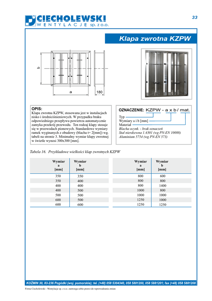 33 W E N T Y L A C J E sp. z o.o. b Klapa zwrotna KZPW a 180 OPIS: OZNACZENIE: KZPW - a x b / mat. Klapa zwrotna KZPW, stosowana jest w instalacjach nisko i średniciśnieniowych. W przypadku braku odpowiedniego przepływu powietrza automatycznie zamyka przekrój przewodu. Ten rodzaj klapy stosuje się w przewodach pionowych. Standardowe wymiary ramek wyginanych z obudowy (blacha t= 2[mm]) wg. tabeli na stronie 3. Minimalny wymiar klapy zwrotnej w świetle wynosi 300x300 [mm]. Typ Wymiary a i b [mm] Materiał Blacha ocynk. - brak oznaczeń Stal nierdzewna 1.4301 (wg PN-EN 10088) Aluminium 5754 (wg PN-EN 573) Tabela 16. Przykładowe wielkości klap zwrotnych KZPW Wymiar a [mm] Wymiar b [mm] Wymiar a [mm] Wymiar b [mm] 350 350 400 400 500 600 600 350 400 400 500 500 500 600 800 800 800 1000 1000 1250 1250 600 800 1400 800 1000 1000 1250 Firma Ciecholewski - Wentylacje sp. z o.o. zastrzega sobie prawo do wprowadzania zmian