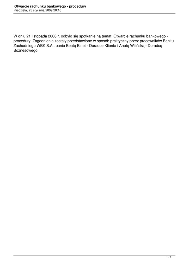 Otwarcie rachunku bankowego - procedury niedziela, 25 stycznia 2009 20:16 W dniu 21 listopada 2008 r. odbyło się spotkanie na temat: Otwarcie rachunku bankowego procedury. Zagadnienia zostały przedstawione w sposób praktyczny przez pracowników Banku Zachodniego WBK S.A., panie Beatę Binet - Doradce Klienta i Anetę Wilińską - Doradcę Boznesowego. 1/1