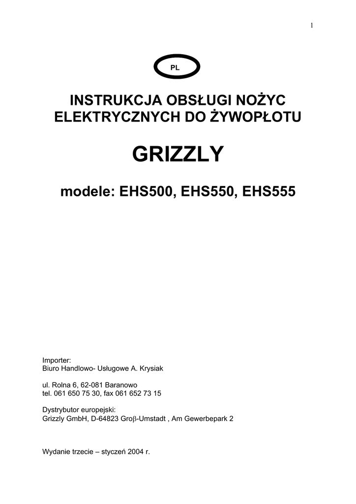 1 PL INSTRUKCJA OBSŁUGI NOŻYC ELEKTRYCZNYCH DO ŻYWOPŁOTU GRIZZLY modele: EHS500, EHS550, EHS555 Importer: Biuro Handlowo- Usługowe A. Krysiak ul. Rolna 6, 62-081 Baranowo tel. 061 650 75 30, fax 061 652 73 15 Dystrybutor europejski: Grizzly GmbH, D-64823 Groβ-Umstadt , Am Gewerbepark 2 Wydanie trzecie – styczeń 2004 r. 2 SPIS TREŚCI: 1. ILUSTRACJA I OBJAŚNIENIA PIKTOGRAMÓW: ........................................... 2 2. DANE TECHNICZNE .................................................................................................... 2 3. WYKAZ CZĘŚCI (rys. 1) ............................................................................................. 4 4. ZASADY BEZPIECZEŃSTWA .................................................................................. 4 5. WYMIANA PROWADNICY ....................................................................................... 5 6. PRZYŁĄCZE SIECIOWE ............................................................................................. 5 7. ROZRUCH I OBSŁUGA ............................................................................................... 5 8. INSTRUKCJA UŻYTKOWANIA .............................................................................. 5 9. KONSERWACJA ............................................................................................................ 6 10. DEMONTAŻ ZNISZCZONEGO URZĄDZENIA ............................................... 6 11. WARUNKI GWARANCJI .......................................................................................... 7 1. ILUSTRACJA I OBJAŚNIENIA PIKTOGRAMÓW: Tabliczka z danymi technicznymi jest zamocowana na lewym boku urządzenia. Znajduje się na niej nazwa producenta, nr wyrobu i rok produkcji urządzenia. 1. UWAGA 2. PRZED UŻYCIEM PRZECZYTAĆ INSTRUKCJĘ 3. ODŁĄCZYĆ Z SIECI JEŚLI PRZEWÓD POŁĄCZENIOWY JEST USZKODZONY 4. NIE DOPUSZCZAĆ DO KONTAKTU Z WODĄ (nie używać urządzenia w czasie deszczu, w wilgotnym pomieszczeniu lub przy mokrych gałęziach) 5. PODCZAS PRACY STOSOWAĆ OKULARY OCHRONNE ORAZ OCHRONNIKI SŁUCHU Naklejki należy utrzymywać w czystości. W razie uszkodzenia naklejek prosimy zgłosić się do naszego serwisu, celem ich wymiany. 2. DANE TECHNICZNE Prąd zasilania / Częstotliwość Moc EHS 500 230V – 50 Hz 500 W EHS 550 230V – 50 Hz 500 W EHS 555 230V – 50 Hz 550 W 3 Długość prowadnicy Odstęp między zębami Częstotliwość cięć Poziom hałasu LWA Poziom głośności LPA Przyspieszenie drgań aw 51 cm 14 mm 3000 min-1 95 dB(A) 87 dB(A) 2,3 m/s2 55 cm 16 mm 3000 min-1 95 dB(A) 87 dB(A) 2,3 m/s2 49,5 cm 16 mm 3000 min-1 95 dB(A) 87 dB(A) 2,3 m/s2 UWAGA! Przed uruchomieniem należy przeczytać instrukcję obsługi i wskazówki bezpieczeństwa. Nożyce do żywopłotu Grizzly są przeznaczone do przycinania i formowania krzewów w ogrodzie przydomowym. 4 Instrukcja stanowi podstawowe wyposażenie maszyny 3. WYKAZ CZĘŚCI (rys. 1) 1. Listwa tnąca 2. Osłona 3. Uchwyt przedni z włącznikiem 4. Obudowa 5. Zaczep przedłużacza 6. Przewód zasilający 7. Zaczep przedłużacza 8. Osłona listwy tnącej Skład zestawu: - nożyce do żywopłotu - instrukcja obsługi - karta gwarancyjna 4. ZASADY BEZPIECZEŃSTWA - Przed przystąpieniem do prac przy nożycach do żywopłotu wyciągnij wtyczkę z gniazda, a szczególnie gdy przewód zasilający jest uszkodzony oraz podczas konserwacji urządzenia. - Podczas pracy urządzenia występują specyficzne zagrożenia. - Urządzenie podczas pracy trzymać w obu rękach. - Pracować tylko w stabilnej pozycji oraz w obuwiu ochronnym. - Nie należy pracować urządzeniem w czasie deszczu i tuż po deszczu. - Nie pozostawiać urządzenia po pracy na wolnym powietrzu bez nadzoru. - Podczas cięcia zalecamy noszenie okularów ochronnych i ochrony słuchu. - Zakładać rękawice robocze oraz wąsko przylegające ubrania. Dłuższe włosy spiąć, ewentualnie przykryć je nakryciem głowy. - Podczas pracy trzymać urządzenie w bezpiecznej odległości od ciała. - Podczas pracy należy uważać, aby w pobliżu nie znajdowały się osoby postronne. - Nożyce przenosić trzymając za uchwyt prowadzący. - Zwracać uwagę, aby przewód sieciowy nie znajdował się w pobliżu cięcia. - Uszkodzony przewód wymienić na nowy. - Odłączając urządzenie od prądu nie ciągnąć za przewód sieciowy, tylko za wtyczkę. - Regularnie kontrolować listwę tnącą, uszkodzoną poddać naprawie w autoryzowanym serwisie. - W przypadku zablokowania podczas pracy natychmiast odłączyć źródło zasilania. - Nożyce przechowywać w suchym, bezpiecznym miejscu, niedostępnym dla dzieci. - Po pracy należy przechowywać nożyce w miejscu niedostępnym dla osób postronnych. - Należy zwrócić szczególną uwagę by po pracy listwa tnąca nożyc została osłonięta. - Należy unikać przeciążenia urządzenia oraz stosować zgodnie z przeznaczeniem. 5 - Używać przedłużaczy dopuszczonych do stosowania na wolnym powietrzu, oznaczonych znakiem bezpieczeństwa B. - Stosowane przewody zasilające nie mogą być mniejsze niż H07 RN-F według DIN 57282 / VDE 0282 (odpowiednik krajowy OWY wg PN-E-90104-1991), a ich przekrój przy długości do 25 m nie może być mniejszy niż 1,5 mm2, przy większych długościach stosować odpowiednio przedłużone o żyłach 2,5mm2. - Połączenia wtykowe nie muszą być wyposażone w styki ochronne, a ich sprzężenie musi być typu przeciwbryzgowego. - Do eksploatacji elektronarzędzi zaleca się stosowanie urządzenia ochronnego dla prądu upływowego lub różnicowego wyłącznika prądowego. - Nożyce należy regularnie sprawdzać oraz konserwować. Uszkodzone listwy należy wymieniać parami. - W przypadku uszkodzenia w skutek upadku lub uderzenia, konieczne jest poddanie ocenie w autoryzowanym serwisie. - Należy starannie konserwować urządzenie, aby pracować bezpiecznie należy stale utrzymywać urządzenie w czystości oraz używać tylko ostrych 