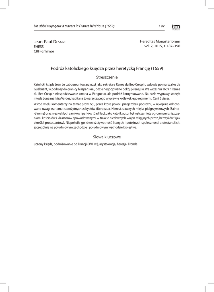 Un abbé voyageur à travers la France hérétique (1659) 197 Hereditas Monasteriorum vol. 7, 2015, s. 187–198 Jean-Paul DESAIVE EHESS CRH-Erhimor Podróż katolickiego księdza przez heretycką Francję (1659) Streszczenie Katolicki ksiądz Jean Le Laboureur towarzyszył jako sekretarz Renée du Bec-Crespin, wdowie po marszałku de Guébriant, w podróży do granicy hiszpańskiej, gdzie negocjowano pokój pirenejski. We wrześniu 1659 r. Renée du Bec-Crespin niespodziewanie zmarła w Périgueux, ale podróż kontynuowano. Na czele wyprawy stanęła młoda żona markiza Vardes, kapitana towarzyszącego wyprawie królewskiego regimentu Cent Suisses. Wśród wielu komentarzy na temat prowincji, przez które powoli przejeżdżali podróżni, w rękopisie odnotowano uwagi na temat starożytnych zabytków (Bordeaux, Nîmes), sławnych miejsc pielgrzymkowych (Sainte-Baume) oraz niezwykłych zamków i parków (Cadillac). Jako katolik autor był wstrząśnięty ogromnymi zniszczeniami kościołów i klasztorów spowodowanymi w trakcie niedawnych wojen religijnych przez „heretyków” (jak określał protestantów). Niepokoiła go również żywotność licznych i potężnych społeczności protestanckich, szczególnie na południowym zachodzie i południowym wschodzie królestwa. Słowa kluczowe uczony ksiądz, podróżowanie po Francji (XVII w.), arystokracja, herezja, Fronda