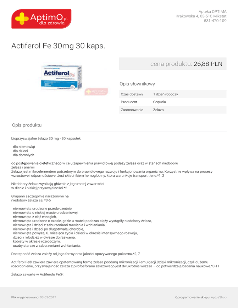 Apteka OPTIMA Krakowska 4, 63-510 Mikstat 531-470-109 Actiferol Fe 30mg 30 kaps. cena produktu: 26,88 PLN Opis słownikowy Czas dostawy 1 dzień roboczy Producent Sequoia Zastosowanie Żelazo Opis produktu bioprzyswajalne żelazo 30 mg - 30 kapsułek dla niemowląt dla dzieci dla dorosłych do postępowania dietetycznego w celu zapewnienia prawidłowej podaży żelaza oraz w stanach niedoboru żelaza i anemii Żelazo jest mikroelementem potrzebnym do prawidłowego rozwoju i funkcjonowania organizmu. Korzystnie wpływa na procesy wzrostowe i odpornościowe. Jest składnikiem hemoglobiny, która warunkuje transport tlenu.*1, 2 Niedobory żelaza wynikają głównie z jego małej zawartości w diecie i niskiej przyswajalności.*2 Grupami szczególnie narażonymi na niedobory żelaza są: *3-6 niemowlęta urodzone przedwcześnie, niemowlęta o niskiej masie urodzeniowej, niemowlęta z ciąż mnogich, niemowlęta urodzone o czasie, gdzie u matek podczas ciąży wystąpiły niedobory żelaza, niemowlęta i dzieci z zaburzeniami trawienia i wchłaniania, niemowlęta i dzieci po długotrwałej chorobie, niemowlęta powyżej 6. miesiąca życia i dzieci w okresie intensywnego rozwoju, dzieci i młodzież w okresie dojrzewania, kobiety w okresie rozrodczym, osoby starsze z zaburzeniami wchłaniania. Dostępność żelaza zależy od jego formy oraz jakości spożywanego pokarmu.*2, 7 Actiferol Fe® zawiera zawiera opatentowaną formę żelaza poddaną mikronizacji i emulgacji.Dzięki mikronizacji, czyli dużemu rozdrobnieniu, przyswajalność żelaza z pirofosforanu żelazowego jest dwukrotnie wyższa – co potwierdzają badania naukowe.*8-11 Żelazo zawarte w Actiferolu Fe®: Plik wygenerowano: 03-03-2017 Oprogramowanie sklepu: AptusShop Apteka OPTIMA Krakowska 4, 63-510 Mikstat 531-470-109 uwalnia się w jelitach, a nie w żołądku, dzięki temu nie odczuwa się dolegliwości ze strony przewodu pokarmowego; nie barwi zębów i nie daje metalicznego posmaku; posiada certyfikat bezpieczeństwa GRAS (Generally Recognised As Safe). Zastosowanie: Do postępowania dietetycznego w celu zapewnienia prawidłowej podaży żelaza oraz w stanach niedoboru żelaza i anemii. Zalecana porcja do spożycia: W celu zapewnienia prawidłowej podaży żelaza: Niemowlęta od 1. doby życia i dzieci: dawkowanie pod nadzorem lekarza, uzależnione od indywidualnego zapotrzebowania. Dzieci powyżej 12. roku życia i dorośli: 1 saszetka dziennie. W stanach niedoboru żelaza i/lub anemii: Niemowlęta od 1. doby życia i dzieci: dawkowanie pod nadzorem lekarza uzależnione od indywidualnego zapotrzebowania. Dorośli: 2 saszetki dziennie i/lub pod nadzorem lekarza. Sposób użycia: Zawartość saszetki należy rozpuścić w niewielkiej ilości ciepłego płynu (ok. ¼ szklanki wody lub ściągniętego pokarmu matki) lub dodać do pożywienia (łyżka stołowa kaszki lub zupki). Spożyć bezpośrednio po przygotowaniu. Actiferol Fe ® nie zmienia smaku spożywanych pokarmów i nie barwi zębów. Plik wygenerowano: 03-03-2017 Powered by TCPDF (www.tcpdf.org) Oprogramowanie sklepu: AptusShop