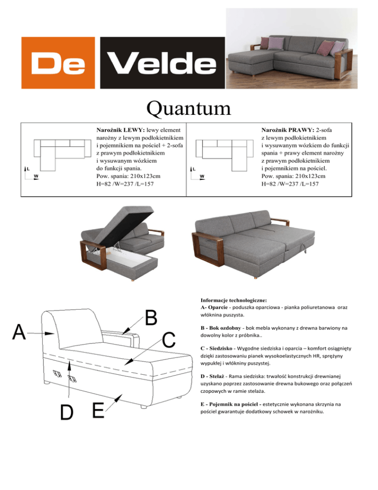 Quantum Narożnik LEWY: lewy element narożny z lewym podłokietnikiem i pojemnikiem na pościel + 2-sofa z prawym podłokietnikiem i wysuwanym wózkiem do funkcji spania. Pow. spania: 210x123cm H=82 /W=237 /L=157 Informacje technologiczne: A- Oparcie - poduszka oparciowa - pianka poliuretanowa oraz włóknina puszysta. B A Narożnik PRAWY: 2-sofa z lewym podłokietnikiem i wysuwanym wózkiem do funkcji spania + prawy element narożny z prawym podłokietnikiem i pojemnikiem na pościel. Pow. spania: 210x123cm H=82 /W=237 /L=157 C B - Bok ozdobny - bok mebla wykonany z drewna barwiony na dowolny kolor z próbnika.. C - Siedzisko - Wygodne siedziska i oparcia – komfort osiągnięty dzięki zastosowaniu pianek wysokoelastycznych HR, sprężyny wypukłej i włókniny puszystej. D - Stelaż - Rama siedziska: trwałość konstrukcji drewnianej uzyskano poprzez zastosowanie drewna bukowego oraz połączeń czopowych w ramie stelaża. D E E - Pojemnik na pościel - estetycznie wykonana skrzynia na pościel gwarantuje dodatkowy schowek w narożniku. PREZENTACJA CECH KONSTRUKCYJNYCH ORAZ PŁYNĄCYCH Z NICH KORZYŚCI: Stałe boki ozdobne Siedzisko o konstrukcji sprężyna wypukła i i pianka wysokoelastyczna, podszyte włókniną puszystą Rama siedziska z drewna bukowego oraz iglastego z zastosowaniem połączeń czopowych Średniej długości siedzisko Elegancko wykończony tył mebla Różne wybarwienie nóg oraz boków Mebel z przeszyciami Element z pufą Funkcja spania Pojemnik na pościel ZESTAWIENIA NAROŻNIKA: Niezmienny kształt, lepsza podpora dla rąk, możliwość zamawiania koloru z próbnika Dużo większy komfort siedzenia Bardzo duża wytrzymałość, wieloletnie użytkowanie Siedzisko przeznaczone dla osób o średnim wzroście jak i dla osób wysokich Możliwość ustawienia narożnika na środku salonu Unikalna możliwość dostosowania narożnika do każdego wnętrza Możliwość nadania meblu dodatkowego charakterystycznego wyglądu poprzez zastosowanie kontrastowych przeszyć i wyboru koloru nici kontrastowych lub w kolorze tkaniny obiciowej Możliwość stworzenia powierzchni do lepszego wypoczynku Po wyjechaniu wózkiem do przodu tworzy się powierzchnia do okazjonalnego spania Estetycznie wykonana skrzynia na pościel gwarantuje dodatkowy schowek w narożniku.