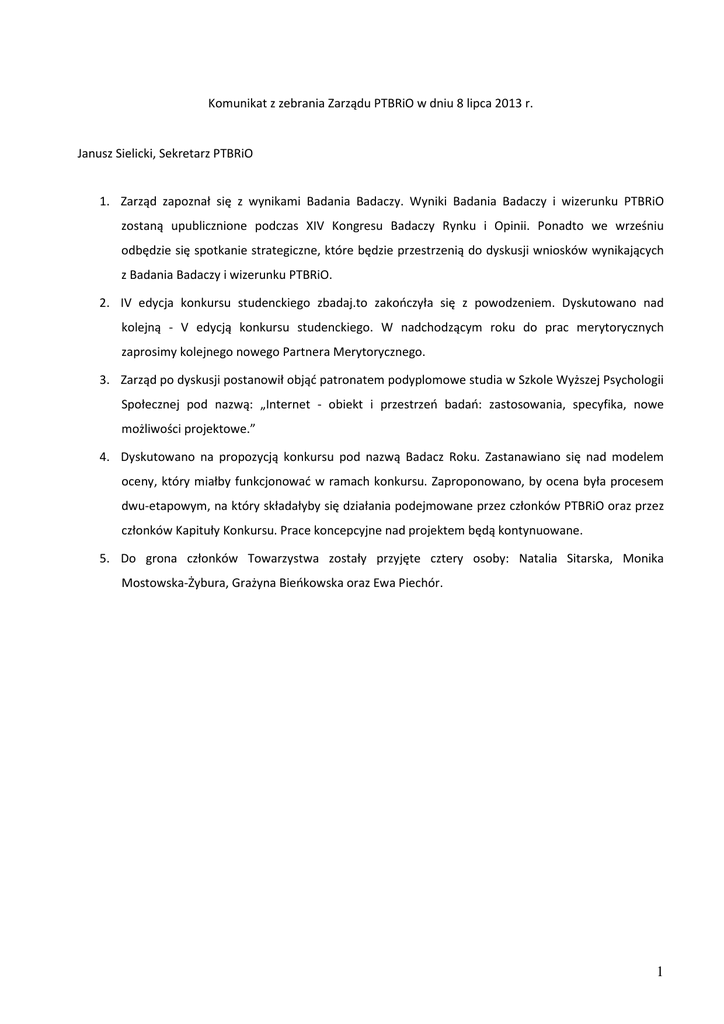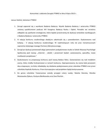Komunikat z zebrania Zarządu PTBRiO w dniu 8 lipca 2013 r. Janusz Sielicki, Sekretarz PTBRiO 1. Zarząd zapoznał się z wynikami Badania Badaczy. Wyniki Badania Badaczy i wizerunku PTBRiO zostaną upublicznione podczas XIV Kongresu Badaczy Rynku i Opinii. Ponadto we wrześniu odbędzie się spotkanie strategiczne, które będzie przestrzenią do dyskusji wniosków wynikających z Badania Badaczy i wizerunku PTBRiO. 2. IV edycja konkursu studenckiego zbadaj.to zakończyła się z powodzeniem. Dyskutowano nad kolejną - V edycją konkursu studenckiego. W nadchodzącym roku do prac merytorycznych zaprosimy kolejnego nowego Partnera Merytorycznego. 3. Zarząd po dyskusji postanowił objąć patronatem podyplomowe studia w Szkole Wyższej Psychologii Społecznej pod nazwą: „Internet - obiekt i przestrzeń badań: zastosowania, specyfika, nowe możliwości projektowe.” 4. Dyskutowano na propozycją konkursu pod nazwą Badacz Roku. Zastanawiano się nad modelem oceny, który miałby funkcjonować w ramach konkursu. Zaproponowano, by ocena była procesem dwu-etapowym, na który składałyby się działania podejmowane przez członków PTBRiO oraz przez członków Kapituły Konkursu. Prace koncepcyjne nad projektem będą kontynuowane. 5. Do grona członków Towarzystwa zostały przyjęte cztery osoby: Natalia Sitarska, Monika Mostowska-Żybura, Grażyna Bieńkowska oraz Ewa Piechór. 1