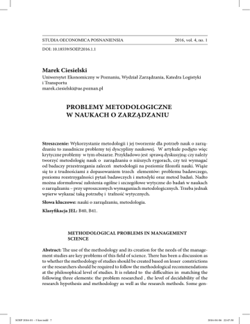 STUDIA OECONOMICA POSNANIENSIA 2016, vol. 4, no. 1 DOI: 10.18559/SOEP.2016.1.1 Marek Ciesielski Uniwersytet Ekonomiczny w Poznaniu, Wydział Zarządzania, Katedra Logistyki i Transportu [email protected] PROBLEMY METODOLOGICZNE W NAUKACH O ZARZĄDZANIU Streszczenie: Wykorzystanie metodologii i jej tworzenie dla potrzeb nauk o zarządzaniu to zasadnicze problemy tej dyscypliny naukowej. W artykule podjęto więc krytyczne problemy w tym obszarze. Przykładowo jest sprawą dyskusyjną: czy należy tworzyć metodologię nauk o zarządzaniu o niższych rygorach, czy też wymagać od badaczy przestrzegania zaleceń metodologii na poziomie filozofii nauki. Wiąże się to z trudnościami z dopasowaniem trzech elementów: problemu badawczego, poziomu rozstrzygalności pytań badawczych i metodyki oraz metod badań. Nadto można sformułować założenia ogólne i szczegółowe wytyczne do badań w naukach o zarządzaniu – przy uproszczonych wymaganiach metodologicznych. Trzeba jednak wpierw wykazać taką potrzebę i trafność wytycznych. Słowa kluczowe: nauki o zarządzaniu, metodologia. Klasyfikacja JEL: B40, B41. METHODOLOGICAL PROBLEMS IN MANAGEMENT SCIENCE Abstract: The use of the methodology and its creation for the needs of the management studies are key problems of this field of science. There has been a discussion as to whether the methodology of studies should be created based on lesser constrictions or the researchers should be required to follow the methodological recommendations at the philosophical level of studies. It is related to the difficulties in matching the following three elements: the problem researched , the level of decidability of the research hypothesis and methodology as well as the research methods. Some gen- SOEP 2016-01 – 5 kor.indd 7 2016-04-06 22:47:30 8 Marek Ciesielski eral assumptions and detail guidelines may be defined in management studies with simplified methodological requirements. Keywords: management studies, methodology Wstęp Celem artykułu jest wskazanie najważniejszych problemów metodologicznych nauk o zarządzaniu. Rozważano dwa rodzaje problemów. Pierwszy polega na konieczności rozstrzygnięcia: czy należy zaakceptować dany pogląd lub postulat, czy nie. Natomiast drugi rodzaj problemów wymaga opowiedzenia się za jednym ze stanowisk metodologicznych. Wybrano problemy, które mają krytyczne znaczenie dla nauk o zarządzaniu. Podejmując problematykę metodologii nauk o zarządzaniu, warto wpierw podkreślić trzy kwestie: – zarządzanie nie tworzy jednolitego paradygmatu, zespołu teorii i metodologii, lecz jest swoistą dżunglą różnych koncepcji [Sułkowski 2005, s. 97]; wiele z nich staje się jedynie przemijającą modą lansowaną przez „guru zarządzania”, firmy doradcze czy też ośrodki akademickie; – owa wielość koncepcji, teorii i postulatów utrzymuje się, mimo że w naukach o zarządzaniu można szybko sprawdzić ich wartość; niekiedy można je testować natychmiast po „narodzinach” [Mickletwait i Wooldridge 2000, s.18], – mistyfikacja dokonana przez A. Sokola [Sokal i Bricmont 2004] dowodzi, że w naukach społecznych, a w tym pewno i w naukach o zarządzaniu, panuje swoiste nowinkarstwo i bałwochwalstwo w stosunku do nowych lub zapożyczonych pojęć i teorii. Nadto stosunek badaczy do metodologii jest dziwnie spolaryzowany. Po pierwsze, w naukach o zarządzaniu często sięga się do metodologii odnoszącej się do praw ogólnych (bezwyjątkowych), czyli do twierdzeń uniwersalnych i ogólnych historycznych. Natomiast w praktyce badawczej w tej dyscyplinie formułuje się – i chyba właśnie powinno się formułować – co najwyżej twierdzenia empiryczne o małej ogólności1. W literaturze wskazuje się na generalizacje historyczne i twierdzenia lokalizacyjne jako właściwe naukom społecznym, w tym w szczególności – naukom o zarządzaniu. Mają 1 Ł. Sułkowski uważa nawet, że „zarządzanie na obecnym etapie rozwoju może dostarczać jedynie interpretacji, a nie praw czy teorii” [Sułkowski 2005, s. 61]. SOEP 2016-01 – 5 kor.indd 8 2016-04-06 22:47:36 Problemy metodologiczne w naukach o zarządzaniu 9 one najczęściej postać twierdzeń szczegółowych – w znaczeniu wypowiedzi z małym kwantyfikatorem. Jednakże w badaniach rzadko określa się ograniczenia przestrzenne i czasowe. Generalizacje i twierdzenia lokalizacyjne traktuje się tak, jak twierdzenia uniwersalne. Nadto pomija się oczywisty fakt, że poziom uzasadnienia twierdzeń nauk o zarządzaniu jest z istoty niższy niż ten poziom w ekonomii i w wielu innych naukach społecznych. Natomiast część badaczy jakby nie akceptuje tej sytuacji oraz oferty metodologicznej dla twierdzeń o niskim poziomie ogólności i odwołuje się do pojęć i koncepcji najlepiej rozwiniętych nauk empirycznych. Do generalizacji historycznych i twierdzeń lokalizacyjnych stosuje się nawet podejście właściwe twierdzeniom ściśle ogólnym. Prowadzi to do licznych nieporozumień. Trudno wówczas na przykład ocenić stopień uzasadnienia twierdzeń i hipotez [Ciesielski 2011a]. Na drugim biegunie obserwujemy lekceważenie metodologii. Zaciera się tu granica między rozumowaniem zdroworozsądkowym (fenomenalizm w warstwie ontologicznej i naiwna indukcja w epistemologii). Panuje przekonanie, że badacz może formułować cenne twierdzenia i wartościowe zalecenia w zakresie zarządzania bez głębszej refleksji metodologicznej. Niekiedy i tak się zdarza, z reguły przy naśladowaniu postępowania innych. Metodologia nie jest więc zbyt popularna w wielu obszarach badań nauk o zarządzaniu. W skrajnych przypadkach można zaobserwować nawet „metodologiofobię”, a także markowanie rozważań metodologicznych [Ciesielski 2012]. 1. Potrzeba metodologii Prezentowany wyżej opis każe postawić pytanie, czy w naukach o zarządzaniu potrzebne są podstawy metodologiczne, czyli czy wiedza metodologiczna pomaga w badaniach i zwi