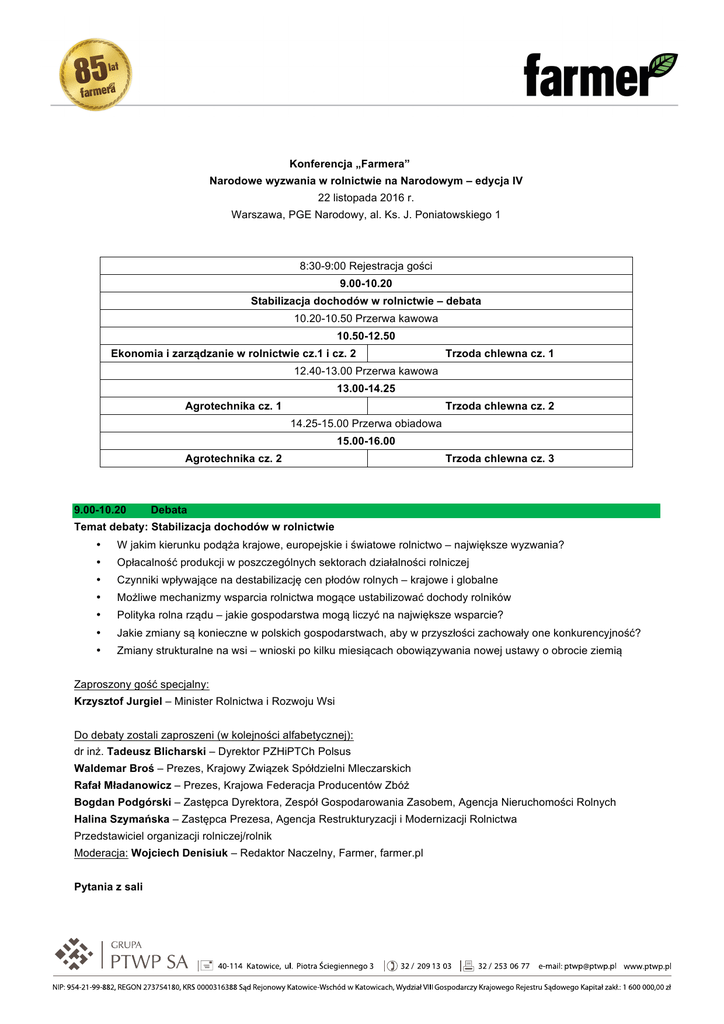 Konferencja „Farmera” Narodowe wyzwania w rolnictwie na Narodowym – edycja IV 22 listopada 2016 r. Warszawa, PGE Narodowy, al. Ks. J. Poniatowskiego 1 8:30-9:00 Rejestracja gości 9.00-10.20 Stabilizacja dochodów w rolnictwie – debata 10.20-10.50 Przerwa kawowa 10.50-12.50 Ekonomia i zarządzanie w rolnictwie cz.1 i cz. 2 Trzoda chlewna cz. 1 12.40-13.00 Przerwa kawowa 13.00-14.25 Agrotechnika cz. 1 Trzoda chlewna cz. 2 14.25-15.00 Przerwa obiadowa 15.00-16.00 Agrotechnika cz. 2 9.00-10.20 Trzoda chlewna cz. 3 Debata Temat debaty: Stabilizacja dochodów w rolnictwie • W jakim kierunku podąża krajowe, europejskie i światowe rolnictwo – największe wyzwania? • Opłacalność produkcji w poszczególnych sektorach działalności rolniczej • Czynniki wpływające na destabilizację cen płodów rolnych – krajowe i globalne • Możliwe mechanizmy wsparcia rolnictwa mogące ustabilizować dochody rolników • Polityka rolna rządu – jakie gospodarstwa mogą liczyć na największe wsparcie? • Jakie zmiany są konieczne w polskich gospodarstwach, aby w przyszłości zachowały one konkurencyjność? • Zmiany strukturalne na wsi – wnioski po kilku miesiącach obowiązywania nowej ustawy o obrocie ziemią Zaproszony gość specjalny: Krzysztof Jurgiel – Minister Rolnictwa i Rozwoju Wsi Do debaty zostali zaproszeni (w kolejności alfabetycznej): dr inż. Tadeusz Blicharski – Dyrektor PZHiPTCh Polsus Waldemar Broś – Prezes, Krajowy Związek Spółdzielni Mleczarskich Rafał Mładanowicz – Prezes, Krajowa Federacja Producentów Zbóż Bogdan Podgórski – Zastępca Dyrektora, Zespół Gospodarowania Zasobem, Agencja Nieruchomości Rolnych Halina Szymańska – Zastępca Prezesa, Agencja Restrukturyzacji i Modernizacji Rolnictwa Przedstawiciel organizacji rolniczej/rolnik Moderacja: Wojciech Denisiuk – Redaktor Naczelny, Farmer, farmer.pl Pytania z sali 10.50-12.10 Ekonomia i zarządzanie w rolnictwie cz.1 Moderacja: Wojciech Denisiuk – Redaktor Naczelny, Farmer, farmer.pl Wystąpienie: Maszyna rolnicza jako inwestycja w gospodarstwie Mariusz Buława – Country Manager, CLAAS Financial Services Polska; Dariusz Skorupski – Kierownik ds. Kluczowych Klientów, CLAAS Polska Wystąpienie: Jak racjonalnie inwestować w gospodarstwo? • Ocena potrzeb inwestycyjnych gospodarstwa • Jak sporządzić rzetelny biznesplan? • Pozyskiwanie pieniędzy na rozwój • Ubezpieczenia jako element minimalizujący ryzyko Mariusz Tatka – Kierownik Działu Ekonomiki i Organizacji Produkcji Rolnej, Centrum Doradztwa Rolniczego w Brwinowie oddz. Poznań Wystąpienie: CNHI Capital – Twój partner w drodze do sukcesu Joanna Liszka – Country Retail Sales Manager, CNH Industrial Capital Wystąpienie: Finansowanie i ochrona agrobiznesu – pytania i odpowiedzi Andrzej Janc – Dyrektor Biura Ubezpieczeń Rolnych, Concordia Ubezpieczenia; Danuta Trzmielewska – Dyrektor Zarządzająca Projektami, SGB Bank SA Dyskusja z udziałem prelegentów i moderatora: Andrzej Janc – Dyrektor Biura Ubezpieczeń Rolnych, Concordia Ubezpieczenia; Joanna Liszka – Country Retail Sales Manager, CNH Industrial Capital; Dariusz Skorupski – Kierownik ds. Kluczowych Klientów, CLAAS Polska; Mariusz Tatka – Kierownik Działu Ekonomiki i Organizacji Produkcji Rolnej, Centrum Doradztwa Rolniczego w Brwinowie oddz. Poznań; Danuta Trzmielewska – Dyrektor Zarządzająca Projektami, SGB Bank SA 12.10-12.50 Ekonomia i zarządzanie w rolnictwie cz.2 Wystąpienie: Jak finansować zakup gruntów i budowę budynków inwentarskich? • Ziemia rolna – jeszcze narzędzie pracy czy już lokata kapitału • Ocena narzędzi finansowych umożliwiających zakup ziemi oraz budowę i modernizację budynków inwentarskich Mariusz Tatka – Kierownik Działu Ekonomiki i Organizacji Produkcji Rolnej, Centrum Doradztwa Rolniczego w Brwinowie oddz. Poznań Dyskusja z udziałem prelegentów i moderatora: Piotr Domagała – Dyrektor ds. Strategii Agrobiznesu, Bank Zachodni WBK SA; Mariusz Tatka – Kierownik Działu Ekonomiki i Organizacji Produkcji Rolnej, Centrum Doradztwa Rolniczego w Brwinowie oddz. Poznań 13.00-14.25 Moderacja: Agrotechnika cz.1 Wojciech Konieczny – Zastępca Redaktora Naczelnego, Farmer, farmer.pl Wystąpienie: O mikroelementach w aspekcie ustawy nawozowej i dostępności dla roślin Adam Nawrocki – Prezes i Właściciel, ADOB Wystąpienie: Innowacyjna technologia nawożenia ozimin azotem Tomasz Haase – Dyrektor Działu ds. Rozwoju, Agrii Polska Sp. z o.o. Wystąpienie: Innowacyjne technologie dla nowoczesnego rolnika dr Piotr Pawlak – Menedżer ds. Biostymulatorów, Arysta LifeScience Polska Wystąpienie: Czynniki warunkujące efektywne odżywianie mineralne roślin uprawnych prof. dr hab. Witold Grzebisz – Wydział Rolnictwa i Bioinżynierii, Uniwersytet Przyrodniczy w Poznaniu Wystąpienie: Aktywne odżywianie roślin uprawnych Paweł Kocel – Dyrektor Marketingu, TIMAC Agro Polska Dyskusja z udziałem prelegentów i moderatora: Jerzy Maciejewski – Właściciel, Agroconsult 15.00-16.00 Agrotechnika cz. 2 Wystąpienie: Chemiczna ochrona roślin po planowanym przez UE wycofaniu 53 substancji czynnych prof. dr hab. Marek Mrówczyński – Zakład Entomologii, Instytut Ochrony Roślin – Państwowy Instytut Badawczy Wystąpienie: Problem zwalczania chorób podsuszkowych we współczesnych płodozmianach • Negatywne skutki dominacji w płodozmianach roślin zbożowych • Czynniki sprzyjające rozwojowi grzybów wywołujących choroby podsuszkowe zbóż. Czy można im przeciwdziałać wyłącznie na drodze stosowania chemicznych środków grzybobójczych? prof. dr hab. Marek Korbas – Zakład Mikologii, Instytut Ochrony Roślin – Państwowy Instytut Badawczy Zakończenie konferencji BLOK TEMATYCZNY: TRZODA CHLEWNA 10.50-12.40 Trzoda chlewna cz.1 Debata: ASF – co dalej z produkcją trzody chlewnej w Polsce? • Aktualna sytuacja epizootyczna pod względem ASF • Sposo