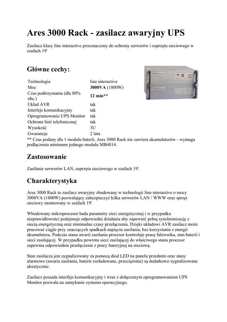 Ares 3000 Rack - zasilacz awaryjny UPS Zasilacz klasy line interactive przeznaczony do ochrony serwerów i osprzętu sieciowego w szafach 19' Główne cechy: Technologia line interactive Moc 3000VA (1800W) Czas podtrzymania (dla 80% 12 min** obc.) Układ AVR tak Interfejs komunikacyjny tak Oprogramowanie UPS Monitor tak Ochrona linii telefonicznej tak Wysokość 3U Gwarancja 2 lata ** Czas podany dla 1 modułu baterii, Ares 3000 Rack nie zawiera akumulatorów - wymaga podłączenia minimum jednego modułu MB4814. Zastosowanie Zasilanie serwerów LAN, osprzętu sieciowego w szafach 19'. Charakterystyka Ares 3000 Rack to zasilacz awaryjny zbudowany w technologii line-interactive o mocy 3000VA (1800W) pozwalający zabezpieczyć kilka serwerów LAN / WWW oraz sprzęt sieciowy montowany w szafach 19'. Wbudowany mikroprocesor bada parametry sieci energetycznej i w przypadku nieprawidłowości podejmuje odpowiedni działania aby zapewnić pełną synchronizację z siecią energetyczną oraz minimalne czasy przełączenia. Dzięki układowi AVR zasilacz może pracować ciągle przy znaczących spadkach napięcia zasilania, bez korzystania z energii akumulatora. Podczas stanu awarii zasilania procesor kontroluje pracę falownika, stan baterii i sieci zasilającej. W przypadku powrotu sieci zasilającej do właściwego stanu procesor zapewnia odpowiednie przełączenie z pracy bateryjnej na sieciową. Stan zasilacza jest sygnalizowany za pomocą diod LED na panelu przednim oraz stany alarmowe (awaria zasilania, baterie rozładowane, przeciążenie) są dodatkowo sygnalizowane akustycznie. Zasilacz posiada interfejs komunikacyjny i wraz z dołączonym oprogramowaniem UPS Monitor pozwala na zamykanie systemu operacyjnego. Przełączniki konfiguracyjne pozwalaj także na zamianę takich parametrów zasilacza jak : próg załączenia, autotest, samoczynne załączanie wyjścia, czułość co pozwala użytkownikowi dostosować go do własnych potrzeb. Czas podtrzymania zasilacza w zależności od obciążenia Moc [VA] Czas bez modułu [min] Czas z 1xMB4814 [min] Czas z 2xMB4814 [min] 150 0 300 700 300 0 165 350 600 0 80 180 1000 0 40 86 1500 0 20 53 2000 0 14 32 2400 0 12 26 3000 0 9 24