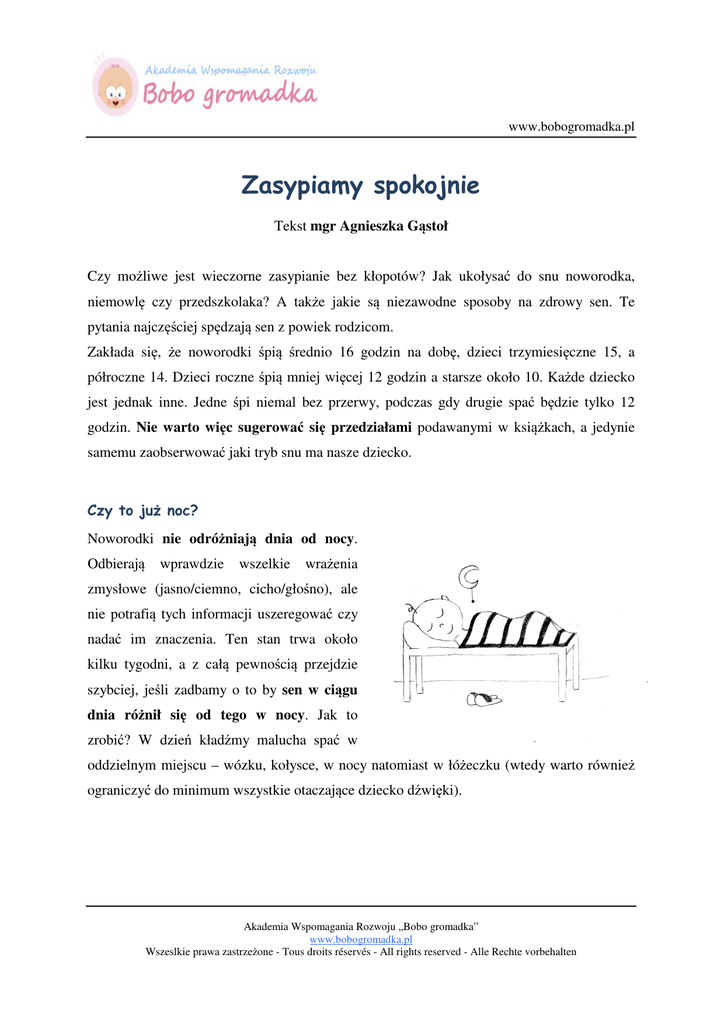 www.bobogromadka.pl Zasypiamy spokojnie Tekst mgr Agnieszka Gąstoł Czy możliwe jest wieczorne zasypianie bez kłopotów? Jak ukołysać do snu noworodka, niemowlę czy przedszkolaka? A także jakie są niezawodne sposoby na zdrowy sen. Te pytania najczęściej spędzają sen z powiek rodzicom. Zakłada się, że noworodki śpią średnio 16 godzin na dobę, dzieci trzymiesięczne 15, a półroczne 14. Dzieci roczne śpią mniej więcej 12 godzin a starsze około 10. Każde dziecko jest jednak inne. Jedne śpi niemal bez przerwy, podczas gdy drugie spać będzie tylko 12 godzin. Nie warto więc sugerować się przedziałami podawanymi w książkach, a jedynie samemu zaobserwować jaki tryb snu ma nasze dziecko. Czy to już noc? Noworodki nie odróżniają dnia od nocy. Odbierają wprawdzie wszelkie wrażenia zmysłowe (jasno/ciemno, cicho/głośno), ale nie potrafią tych informacji uszeregować czy nadać im znaczenia. Ten stan trwa około kilku tygodni, a z całą pewnością przejdzie szybciej, jeśli zadbamy o to by sen w ciągu dnia różnił się od tego w nocy. Jak to zrobić? W dzień kładźmy malucha spać w oddzielnym miejscu – wózku, kołysce, w nocy natomiast w łóżeczku (wtedy warto również ograniczyć do minimum wszystkie otaczające dziecko dźwięki). Akademia Wspomagania Rozwoju „Bobo gromadka” www.bobogromadka.pl Wszeslkie prawa zastrzeżone - Tous droits réservés - All rights reserved - Alle Rechte vorbehalten www.bobogromadka.pl Czy śpimy tak samo? Sen dorosłego różni się od snu noworodka długością fazy REM (Rapid Eye Movement). W jej trakcie śnimy, i jak dowodzą naukowcy, wtedy też tworzą się połączenia nerwowe w mózgu. Dlatego właśnie sen noworodka składa się prawie w całości z tej fazy. Ponadto dorosły w trakcie snu wykonuje wiele ruchów m.in. przewracając się z boku na bok. Noworodek tego nie potrafi. Poświęca on sen nie tylko na odpoczynek, ale i na wzrost. Pamiętajmy też, że umiejętności samodzielnego zasypania możemy wymagać od przedszkolaka, ale nie od noworodka, nie sugerujmy się też radami, iż dziecko „najlepiej się wyśpi jak się wypłacze” (patrz artykuł „Dlaczego płaczesz?”). Ucząc samodzielnego zasypiania zostawiajmy dziecko samo i wracajmy (stopniowo wydłużając czas nieobecności, np. 3-5-7 minut). Jak często w nocy budzą się dzieci? Większość noworodków budzi się w nocy średnio dwa razy. Najczęstszą tego przyczyną jest głód (żołądek noworodka jest bardzo mały przyjmuje więc niewiele jedzenia, które bardzo szybko trawi). Dzieci karmione naturalnie budzą się częściej od tych, karmionych mlekiem modyfikowanym (co dwie, trzy godziny), gdyż jest ono szybciej przyswajane. Pamiętajmy też, że malca obudzić może też mokra pieluszka, zawinięte ubranko, chłód lub infekcja. Uwaga! Tuż po urodzeniu, gdy dziecko ma nasiloną żółtaczkę fizjologiczną, należy je wybudzać do karmienia (co trzy godziny), gdyż może ona powodować taką ospałość, że samo mimo głodu, się nie obudzi. Natomiast, gdy nasz malec mocno uderzył się w głowę koniecznie musimy monitorować jego sen – jeśli się przedłuża może to być oznaką komplikacji pourazowych i wówczas koniecznie musimy udać się do lekarza! Akademia Wspomagania Rozwoju „Bobo gromadka” www.bobogromadka.pl Wszeslkie prawa zastrzeżone - Tous droits réservés - All rights reserved - Alle Rechte vorbehalten www.bobogromadka.pl Jak sobie pościelesz… …tak się wyśpisz. Ta zasada dotyczy wszystkich, niezależnie od wieku. Warto by pokój dziecka przed jego zaśnięciem był dobrze wywietrzony i dość chłodny (ok. 18-20 stopni Celsjusza). Czy naszemu malcowi odpowiada temperatura możemy odgadnąć dotykając jego karku – gdy jest za ciepło będzie spocony. Dlaczego nie śpisz? Noworodki nie wymagają „chodzenia na paluszkach”, ale też nie warto przesadzać z hałasem ani zapachami (np. dymu papierosowego), gdyż to na pewno go wybudzi. Małe dzieci miewają kłopoty ze snem w okresie nabywania nowej umiejętności np. podnoszenia główki, siadania czy chodzenia, co wynika zapewne z większego w tym czasie podekscytowania. U starszych problemy ze snem mogą wywoływać również inne ekscytujące wydarzenia „naruszające” ich codzienną rutynę, np. przyjęcie świąteczne, wyjazd, wizyta gości. To o czym nie wolno nam zapominać to również temperament. Jeśli sami budzimy się często w nocy nie dziwmy się, że tak będzie robić również nasze dziecko. Jak układać do snu? Według zaleceń pediatrów noworodka należy układać na pleckach, na płaskiej powierzchni. Nie należy podkładać mu pod głowę poduszek. Jeśli naszemu malcowi dokucza katar można podłożyć coś pod nogi łóżka od strony główki dziecka. Tak zwane „spowijanie” dziecka sprawdza się w pierwszych tygodniach po urodzeniu, oddaje to bowiem po części warunki panujące w łonie matki, pomagając pogłębić sen, wyregulować oddech czy poprawić pracę serca. Akademia Wspomagania Rozwoju „Bobo gromadka” www.bobogromadka.pl Wszeslkie prawa zastrzeżone - Tous droits réservés - All rights reserved - Alle Rechte vorbehalten www.bobogromadka.pl Razem czy osobno Zdania na temat spania rodziców z dzieckiem w jednym łóżku są podzielone. Z jednej strony daje to szansę zbliżenia się do siebie, spędzenia ze sobą czasu (szczególnie w sytuacji, gdy oboje rodzice pracują) czy odbudowania więzi. Z drugiej może prowadzić do kłopotów, kiedy dziecko przyzwyczajone do spania z rodzicami, nie będzie chciało spać samo, co zdecydowanie może nie wpłynąć dobrze na relacje partnerskie w związku. Sposób na... noworodka i niemowlaka Kiedy kąpiel i wieczorne karmienie nie wystarczają możemy spróbować: • masażu całego ciała dziecka lub samej tylko twarzy (głaszczemy od nasady brwi do skroni), • kołysania, • śpiewania kołysanek, • cichych jednostajnych dźwięków (n