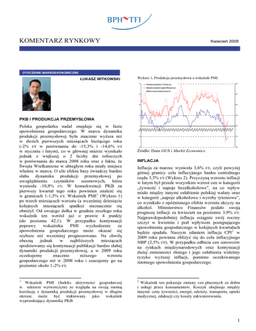 KOMENTARZ RYNKOWY Kwiecień 2009 OTOCZENIE MAKROEKONOMICZNE ŁUKASZ WITKOWSKI Wykres 1. Produkcja przemysłowa a wskaźnik PMI. 40 Produkcja przemysłowa r/r, SA (lewa oś) 60,0 Wskaźnik menedżerów logistyki PMI (prawa oś) Wielkość nowych zamówień (prawa oś) 30 55,0 20 50,0 10 45,0 0 40,0 Polska gospodarka nadal znajduje się w fazie spowolnienia gospodarczego. W marcu dynamika produkcji przemysłowej była znacznie wyższa niż w dwóch pierwszych miesiącach bieżącego roku (-2% r/r w porównaniu do -15,3% i -14,6% r/r w styczniu i lutym), co w głównej mierze wynikało jednak z większej o 2 liczby dni roboczych w porównaniu do marca 2008 roku oraz z faktu, że Święta Wielkanocne w ubiegłym roku miały miejsce właśnie w marcu. O sile efektu bazy świadczy bardzo słaba dynamika produkcji przemysłowej po uwzględnieniu czynników sezonowych, która wyniosła -10,8% r/r. W konsekwencji PKB za pierwszy kwartał tego roku powinien znaleźć się w granicach 1-1,5% r/r. Wskaźnik PMI 1 (Wykres 1) po trzech miesiącach wzrostu (a wcześniej dziesięciu kolejnych miesiącach spadku) nieznacznie się obniżył. Od swojego dołka w grudniu zeszłego roku wskaźnik ten wzrósł już o prawie 4 punkty (do poziomu 42,1). W przypadku kontynuacji poprawy wskaźnika PMI wychodzenie ze spowolnienia gospodarczego może okazać się szybsze niż wcześniej prognozowano. Na chwilę obecną jednak w najbliższych miesiącach spodziewamy się kontynuacji publikacji bardzo słabej dynamiki produkcji przemysłowej, a w 2009 roku oczekujemy znacznie niższego wzrostu gospodarczego niż w 2008 roku i szacujemy go na poziomie około 1-2% r/r. 1 Wskaźnik PMI (Indeks aktywności gospodarczej w sektorze wytwórczym) ze względu na swoją istotną korelację z dynamiką produkcji przemysłowej w długim okresie może być traktowany jako wskaźnik wyprzedzający dynamikę PKB. st ykw 00 i -0 lip 0 pa 00 ź- 0 st 0 y k w -0 1 i -0 lip 1 pa 01 źst 01 ykw 02 i -0 lip 2 pa 02 ź- 0 st 2 ykw 03 i -0 lip 3 pa 03 źst 03 ykw 04 i -0 lip 4 pa 04 ź- 0 st 4 ykw 05 i -0 lip 5 pa 05 źst 05 ykw 06 i -0 lip 6 pa 06 ź- 0 st 6 ykw 07 i -0 lip 7 pa 07 źst 07 ykw 08 i -0 lip 8 pa 08 ź- 0 st 8 ykw 09 i -0 lip 9 pa 09 ź- 0 9 PKB I PRODUKCJA PRZEMYSŁOWA -10 35,0 -20 30,0 Źródło: Dane GUS i Markit Economics. INFLACJA Inflacja za marzec wyniosła 3,6% r/r, czyli powyżej górnej granicy celu inflacyjnego banku centralnego rzędu 3,5% r/r (Wykres 2). Przyczyną wzrostu inflacji w lutym był przede wszystkim wzrost cen w kategorii „żywność i napoje bezalkoholowe”, na co wpływ miało między innymi osłabienie polskiej waluty oraz w kategorii „napoje alkoholowe i wyroby tytoniowe”, co wynikało z opóźnionego efektu wzrostu akcyzy na alkohol. Ministerstwo Finansów podało swoją prognozę inflacji za kwiecień na poziomie 3,9% r/r. Najprawdopodobniej inflacja osiągnie swój roczny szczyt w kwietniu i pod wpływem postępującego spowolnienia gospodarczego w kolejnych kwartałach będzie spadała. Naszym zdaniem inflacja CPI 2 w 2009 roku powinna zbliżyć się do celu inflacyjnego NBP (2,5% r/r). W przypadku odbicia cen surowców na rynkach międzynarodowych oraz kontynuacji dużej zmienności złotego i jego osłabienia widzimy ryzyko wyższej inflacji, pomimo oczekiwanego istotnego spowolnienia gospodarczego. 2 Wskaźnik ten pokazuje zmiany cen płaconych za dobra i usługi przez konsumentów. Koszyk obejmuje między innymi: ceny żywności, energii, odzieży, transportu, opieki medycznej, edukacji czy koszty zakwaterowania. 1 Na uwagę zasługuje także znaczny wzrost cen producentów. Wskaźnik PPI 3 wyniósł w marcu 5,6% r/r, co jest najwyższym poziomem od końca 2004 roku. Wzrost wskaźnika PPI to przede wszystkim rezultat słabego złotego, co przełożyło się na mocny wzrost cen paliw, a także wzrost cen w większości kategorii przetwórstwa przemysłowego. Wykres 3. Rynek pracy w Polsce. 16% 16% Zatrudnienie, r/r Realna dynamika funduszu płac, r/r (3-miesięczna średnia ruchoma) 12% 12% Realna dynamika płac, r/r (3-miesięczna średnia ruchoma) 8% 8% 4% 4% 0% 0% Wykres 2. Inflacja a cel inflacyjny NBP. 12 11 Inflacja CPI r/r Inflacja PPI r/r 12 11 Górna granica celu inflacyjnego 9 Cel inflacyjny NBP Dolna granica celu inflacyjnego 10 st y k w -9 9 ilip 9 9 p a -9 9 źst 99 y k w -0 0 ilip 0 0 p a -0 0 źst 00 y k w -0 1 ilip 0 1 p a -0 1 źst 01 y k w -0 2 ilip 0 2 p a -0 2 ź -0 st 2 y k w -0 3 ilip 0 3 p a -0 3 ź -0 st 3 y k w -0 4 ilip 0 4 p a -0 4 ź -0 st 4 y k w -0 5 ilip 0 5 p a -0 5 źst 05 ykw 06 ilip 0 6 p a -0 6 źst 06 ykw 07 ilip 0 7 p a -0 7 źst 07 ykw 08 ilip 0 8 p a -0 8 źst 08 ykw 09 ilip 0 9 p a -0 9 ź -0 9 10 9 Inflacja bazowa (po wyłączeniu cen żywności i cen energii) 8 7 7 6 6 5 5 4 4 3 3 2 2 1 1 0 0 st ykw 00 i -0 l ip 0 pa 00 źs ty 0 0 -0 kw 1 i -0 l ip 1 pa 01 ź -0 st 1 ykw 02 i -0 l ip 2 pa 02 ź -0 s ty 2 kw 03 i -0 l ip 3 pa 03 źs ty 0 3 -0 kw 4 i -0 l ip 4 pa 04 ź -0 s ty 4 kw 05 i -0 l ip 5 pa 05 źs ty 0 5 -06 kw i -0 l ip 6 pa 06 źs ty 0 6 kw 07 i -0 l ip 7 pa 07 ź -0 s ty 7 kw 08 i -0 l ip 8 pa 08 źs ty 0 8 -09 kw i -0 l ip 9 pa 09 ź -0 9 8 -1 -1 Źródło: Dane GUS i NPB. RYNEK PRACY Na rynku pracy wciąż mamy do czynienia z publikacją coraz słabszych danych (Wykres 3). Dynamika płac w sektorze przedsiębiorstw co prawda wzrosła z poziomu 5,1% r/r w lutym do 5,7% r/r w marcu, ale wynika to między innymi z większej ilości dni roboczych w porównaniu do analogicznego miesiąca roku poprzedniego. Naszym zdaniem w najbliższych miesiącach dynamika płac będzie spadała. Z miesiąca na miesiąc obniża się dynamika zatrudnienia, która w marcu spadła trzynasty miesiąc z rzędu i drugi miesiąc z kolei była na poziomie ujemnym (-0,9% r/r). Słabnie także dynamika nominalnego i realnego funduszu płac (3-miesięczna średnia ruchoma realnego funduszu płac spadła w marcu do najniższego poziomu od prawie 4 lat), co ozna