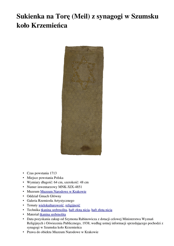 Sukienka na Torę (Meil) z synagogi w Szumsku koło Krzemieńca Czas powstania 1713 Miejsce powstania Polska Wymiary długość: 64 cm, szerokość: 48 cm Numer inwentarzowy MNKXIX4851 Muzeum Muzeum Narodowe w Krakowie Oddział Gmach Główny Galeria Rzemiosła Artystycznego Tematy wielokulturowość, religijność Technika tkanina srebrnolita, haft złotą nicią, haft złotą nicią Materiał tkanina srebrnolita Data pozyskania zakup od Szymona Rabinowicza z dotacji celowej Ministerstwa Wyznań Religijnych i Oświecenia Publicznego, 1938; według ustnej informacji sprzedającego pochodzi z synagogi w Szumsku koło Krzemieńca • Prawa do obiektu Muzeum Narodowe w Krakowie • • • • • • • • • • • • Prawa do wizerunków cyfrowych domena publiczna • Digitalizacja RPD MIK, projekt Wirtualne Muzea Małopolski • Tagi sztuka sakralna, judaika, Żydzi, tkanina, 2D, wielokulturowość, synagoga Pokrowiec w formie wydłużonego prostokąta został uszyty ręcznie z tkaniny w drobny wzór geometrycznoroślinny. Na awersie, w kartuszu w formie wieńca laurowego, widnieje haftowany napis donacyjny, który głosi: ז”ל הינדא מרת | צנועה אשה | זנ | לפק תעג | ’שנ כץ שמואל ’מ | ’הג המ הרב בת („To jest dar skromnej kobiety, błogosławionej pamięci Pani Hindy, córki wielkiego rabbiego Samuela Kaca, w r. (5)473” [=1713 r.]).* Po obu stronach liter זנ są umieszczone dwa ptaszki symbolizujące dusze w rajskim ogrodzie. Po drugiej stronie sukienki naszyta jest gwiazda Dawida (Megen Dawid) uformowana ze złotosrebrnej koronki klockowej. Przez dwa otwory w części górnej przekładano wałki, na które nawinięty był zwój Tory. Białosrebrna tonacja kolorystyczna wskazuje na używanie sukienki w synagodze w okresie dziesięciu dni skruchy (Jamim Noraim), łączących żydowski Nowy Rok (Rosz haSzana) z Dniem Pojednania (Jom Kipur). Sukienka pełni wielorakie funkcje: chroni Torę przed zniszczeniem bądź zabrudzeniem, ozdabia i zabezpiecza przed dotykaniem nieosłoniętą ręką. Sam zwój porównywany jest do Oblubienicy i Królowej w odświętnym stroju, dlatego uszyty z kosztownych tkanin pokrowiec, zdobiony aplikacjami i bogato haftowany, ma swoim wyglądem przypominać płaszcz królewski. Zakładanie sukienki na zwoje odbywa się w synagodze bardzo uroczyście, jest wyrazem szacunku dla słów nauki i mądrości Tory. Obiekt jest jednym z najstarszych i najcenniejszych judaików w Polsce. *Tłumaczenie: Eugeniusz Duda Opracowanie: Anna LebetMinakowska (Muzeum Narodowe w Krakowie), © wszystkie prawa zastrzeżone