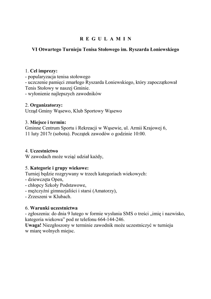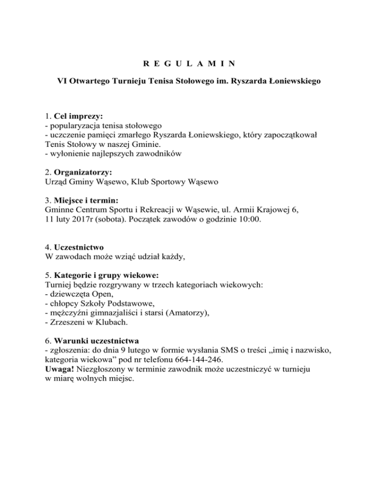 R E G U L A M I N VI Otwartego Turnieju Tenisa Stołowego im. Ryszarda Łoniewskiego 1. Cel imprezy: - popularyzacja tenisa stołowego - uczczenie pamięci zmarłego Ryszarda Łoniewskiego, który zapoczątkował Tenis Stołowy w naszej Gminie. - wyłonienie najlepszych zawodników 2. Organizatorzy: Urząd Gminy Wąsewo, Klub Sportowy Wąsewo 3. Miejsce i termin: Gminne Centrum Sportu i Rekreacji w Wąsewie, ul. Armii Krajowej 6, 11 luty 2017r (sobota). Początek zawodów o godzinie 10:00. 4. Uczestnictwo W zawodach może wziąć udział każdy, 5. Kategorie i grupy wiekowe: Turniej będzie rozgrywany w trzech kategoriach wiekowych: - dziewczęta Open, - chłopcy Szkoły Podstawowe, - mężczyźni gimnazjaliści i starsi (Amatorzy), - Zrzeszeni w Klubach. 6. Warunki uczestnictwa - zgłoszenia: do dnia 9 lutego w formie wysłania SMS o treści „imię i nazwisko, kategoria wiekowa” pod nr telefonu 664-144-246. Uwaga! Niezgłoszony w terminie zawodnik może uczestniczyć w turnieju w miarę wolnych miejsc. 7. System rozgrywek Turniej rozgrywany będzie systemem do dwóch przegranych potocznie „rosyjskim”. Zawodnik wygrywający z prawej strony zajmuje I miejsce. Mecze trwają do trzech wygranych setów. Mecze sędziują sędziowie oraz zawodnicy przez nich wyznaczeni. Kwestie sporne, w zależności od ich charakteru, rozstrzygają sędziowie turnieju. 8. Nagrody Puchar za III pierwsze miejsca, dyplomy uczestnictwa dla wszystkich, nagroda dla najstarszego i najmłodszego uczestnika turnieju. 9. Losowanie Losowanie odbędzie się 10 lutego w piątek rano. Odprawa techniczna odbędzie się w dniu zawodów - pół godziny przed rozpoczęciem rozgrywek. POSTANOWIENIA KOŃCOWE: 1. Wszystkich zawodników obowiązuje strój sportowy. 2. Zawodnicy powinni posiadać własne rakietki. 3. Sprawy sporne wynikłe w czasie trwania turnieju rozstrzyga organizator. 4. Uczestnicy turnieju są zobowiązani do przestrzegania zasad i regulaminów ustalonych przez gospodarza obiektu i organizatora turnieju. 5. Organizator nie ponosi odpowiedzialności za rzeczy zagubione lub pozostawione w szatni. 6. Ubezpieczenie oraz dojazd zawodników na koszt własny. 7. Organizator nie ponosi odpowiedzialności za kontuzje, wypadki, problemy zdrowotne uczestników podczas trwania zawodów. Zawodnik startuje na własną odpowiedzialność. 8. Warunkiem startu uczestnika niepełnoletniego jest przedstawienie pisemnej zgody jego opiekunów. 9. Organizator zastrzega sobie prawo do zmiany Regulaminu rozgrywek, który może ulec modyfikacji ze względu na ostateczną ilość zgłoszonych zawodników.