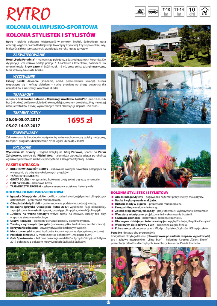 RYTRO 7-10 11-14 10 KOLONIA OLIMPIJSKO-SPORTOWA KOLONIA STYLISTEK I STYLISTÓW Rytro – pięknie położona miejscowość w centrum Beskidu Sądeckiego, którą otaczają wzgórza pasma Radziejowej i Jaworzyny Krynickiej. Czyste powietrze, lasy, bliskość szlaków turystycznych, przyciągają co roku rzesze turystów. ZAKWATEROWANIE Hotel „Perła Południa” – malowniczo położony, z dala od gwarnych kurortów. Do dyspozycji uczestników oddaje pokoje 2, 3-osobowe z łazienkami, balkonem. Na terenie hotelu: kryty basen (12×25 m, gł. 1-2 m), grota solna, sala gimnastyczna, tenis stołowy, trawiaste boisko. WYŻYWIENIE Cztery posiłki dziennie (śniadanie, obiad, podwieczorek, kolacja). Turnus rozpoczyna się i kończy obiadem + suchy prowiant na drogę powrotną dla uczestników z Warszawy, Wrocławia i Łodzi. TRANSPORT Autokar z Krakowa lub Katowic. Z Warszawy, Wrocławia, Łodzi PKP (min. 10 os.) lub bus (min. 6 os.) do Katowic lub do Krakowa, dalej autokarem do obiektu. Przy mniejszej ilości uczestników z wyżej wymienionych miast obowiązuje dopłata (+50 zł/os.) TERMINY I CENY 26.06-05.07.2017 05.07-14.07.2017 1695 zł ZAPEWNIAMY Zakwaterowanie 9 noclegów, wyżywienie, kadrę wychowawczą, opiekę medyczną, transport, program, ubezpieczenie NNW Signal Iduna do 7.000zł PROGRAM Wycieczka do Krynicy – wyjazd kolejką na Górę Parkową, spacer po Parku Zdrojowym, wejście do Pijalni Wód; tajemnicza wycieczka piesza po okolicy; ognisko z pieczeniem kiełbasek; korzystanie z sali gimnastycznej i boiska. PAKIET 5 ATRAKCJI: ✓ KOLOROWY ZAWRÓT GŁOWY – zabawa na wolnym powietrzu polegająca na wyrzucaniu do góry różnokolorowych proszków ✓ TAŃCE INTEGRACYJNE ✓ GROTA SOLNA – korzystanie z hotelowej groty solnej trzy razy w turnusie ✓ H2O na wesoło – balonowa bitwa ✓ TAJEMNICZYM TROPEM – zabawa terenowa z ciekawą historią w tle KOLONIA OLIMPIJSKO-SPORTOWA: KOLONIA STYLISTEK I STYLISTÓW: Igrzyska Olimpijskie: od Aten do Rio – trochę historii, najsłynniejsi olimpijczycy ostatnich lat – prezentacja multimedialna. Olimpiada kiedyś i dziś – gra terenowa na podstawie zdobytej wiedzy. Kolonijne Igrzyska Olimpijskie Rytro 2017: wykonanie flagi olimpijskiej, zaprojektowanie maskotki igrzysk, przysięga olimpijska, wielobój olimpijski. „Debaty na ważne tematy”: wpływ ruchu na zdrowie, zasady fair play w sporcie, stosowanie dopingu. Urazy i kontuzje – elementy pierwszej pomocy przedmedycznej. Trening z wybranych dyscyplin (siatkówka, piłka, badminton, aerobic-dance). Korzystanie z basenu – zawody pływackie i zabawy w wodzie. Mecz towarzyski: uczestnicy kontra kadra w wybranej dyscyplinie sportowej. Projekcja filmów: „I Ty możesz zostać bohaterem”, „Magiczne buty”. Gala Sportowców – bal oraz dekoracja medalistów Igrzysk Olimpijskich Rytro 2017 połączony z pokazem mody Młodych Stylistek i Stylistów. ABC Młodego Stylisty – pogawędka na temat pracy stylisty, makijażysty. Nauka i wykonywanie makijażu. Historia mody w pigułce – prezentacja multimedialna. Face painting – malowanie twarzy. Zostań projektantką/em mody – projektowanie i wykonywanie kostiumów. Warsztaty artystyczne: projektowanie i wykonywanie biżuterii. Stylizacja paznokci – malowanie i zdobienie paznokci. Dlaczego w dzisiejszym świecie ważny jest wygląd? – bajka „Brzydkie Kaczątko”. W zdrowym ciele zdrowy duch – codzienne zajęcia fitness. Pokaz mody zakończony balem Młodych Stylistek, Stylistów i Olimpijczyków. Ponadto (dotyczy obu programów): Korzystanie z krytego basenu (obowiązkowe posiadanie czepków kąpielowych), gry i zabawy integracyjne, „Sing Star” – kolonijne karaoke, „Talent Show” – prezentacja talentów dla chętnych, kalambury, konkursy, Parada Kłamców. 28