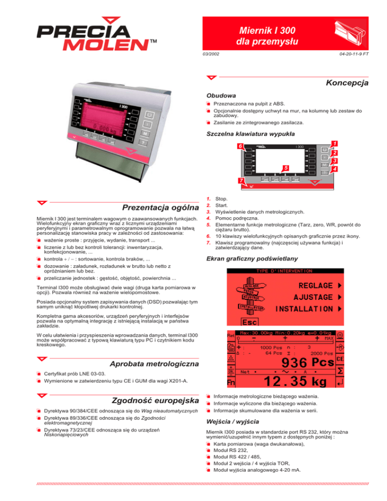 Miernik I 300 dla przemysłu 03/2002 04-20-11-9 FT Koncepcja Obudowa & Przeznaczona na pulpit z ABS. & Opcjonalnie dostępny uchwyt na mur, na kolumnę lub zestaw do zabudowy. & Zasilanie ze zintegrowanego zasilacza. Szczelna klawiatura wypukła 6 1 I 300 2 M 5 7 Prezentacja ogólna Miernik I 300 jest terminalem wagowym o zaawansowanych funkcjach. Wielofunkcyjny ekran graficzny wraz z licznymi urządzeniami peryferyjnymi i parametrowalnym oprogramowanie pozwala na łatwą personalizację stanowiska pracy w zależności od zastosowania: & ważenie proste : przyjęcie, wydanie, transport ... & liczenie z lub bez kontroli tolerancji: inwentaryzacja, â0 á â0 á âT á âT á HR HR ? 3 4 B/G B/G 1. 2. 3. 4. 5. Stop. Start. Wyświetlenie danych metrologicznych. Pomoc podręczna. Elementarne funkcje metrologiczne (Tarz, zero, WR, powrót do ciężaru brutto). 6. 10 klawiszy wielofunkcyjnych opisanych graficznie przez ikony. 7. Klawisz programowalny (najczęsciej używana funkcja) i zatwierdzający dane. konfekcjonowanie, ... & kontrola + / − : sortowanie, kontrola braków, ... & dozowanie : załadunek, rozładunek w brutto lub netto z Ekran graficzny podświetlany opróżnianiem lub bez. & przeliczanie jednostek : gęstość, objętość, powierchnia ... Terminal I300 może obsługiwać dwie wagi (druga karta pomiarowa w opcji). Pozwala również na ważenie wielopomostowe. Posiada opcjonalny system zapisywania danych (DSD) pozwalając tym samym uniknąć kłopotliwej drukarki kontrolnej. Kompletna gama akcesoriów, urządzeń peryferyjnych i interfejsów pozwala na optymalną integrację z istniejącą instalacją w państwa zakładzie. W celu ułatwienia i przyspieszenia wprowadzania danych, terminal I300 może współpracować z typową klawiaturą typu PC i czytnikiem kodu kreskowego. Aprobata metrologiczna & Certyfikat prób LNE 03-03. & Wymienione w zatwierdzeniu typu CE i GUM dla wagi X201-A. Zgodność europejska & Dyrektywa 90/384/CEE odnosząca się do Wag nieautomatycznych & Dyrektywa 89/336/CEE odnosząca się do Zgodności elektromagnetycznej & Dyrektywa 73/23/CEE odnosząca się do urządzeń Niskonapięciowych & Informacje metrologiczne bieżącego ważenia. & Informacje wyliczone dla bieżącego ważenia. & Informacje skumulowane dla ważenia w serii. Wejścia / wyjścia Miernik I300 posiada w standardzie port RS 232, który można wymienić/uzupełnić innym typem z dostępnych poniżej : & & & & & Karta pomiarowa (waga dwukanałowa), Moduł RS 232, Moduł RS 422 / 485, Moduł 2 wejścia / 4 wyjścia TOR, Moduł wyjścia analogowego 4-20 mA. / / / / / / / / / / / / / / / / / / / / / / / / / / / / / / / / / / / / / / / / / / / / / / / / / / / / / / / / / / / / / / / / / / / / / / / / / / / / / / / / / / / / / / / / / / / / / / / / / / / / / / / / / / / / / / / / / / / / / / / / / / / / / / // / / / / / / / / / / / / / / / / / / / / / / / / / / / / / / / / / / / / / / / / / / / / / / / / / / / / / / / / / / / / / / / / / / / / / / / / / / / / / / / / / / / / / / Charakterystyka techniczna Charakterystyka fizyczna Charakterystyka środowiska & Obudowa • Szerokość ............................................... • Wysokość ............................................... • Głębokość .............................................. & Obudowa z uchwytem na stół : • Szerokość ............................................... • Wysokość ............................................... • Głębokość .............................................. & Zakres temperatury 218 mm 212.1 mm 95.1 mm • Pracy ....................................................... - 10 °C / + 40 °C • Przechowywania ..................................... - 20 °C / + 60 °C & Stopień ochrony .......................................... IP 54 Charakterystyka plików 218 mm 157 mm 205 mm • 2 pliki referencji......................................Pojemność : 500 rek. Kod : 12 cyfr Etykieta : 20 znaków • 2 pliki parametrowalne zależnie od aplikacji; pozwalające przechowywać ciężary jednostkowe, zmienne załadunków, tolerancje itd, ........................................Pojemność : 100 Kod : 12 cyfr Etykieta : 20 znaków Charakterystyka elektryczna & Zasilanie zasilacza: • Napięcie ................................................. 190 - 250 V • Częstość ................................................. 50 - 60 Hz • Pobór mocy ............................................. 15 VA maks. & lub 24 V DC. • 1 plik tar. ................................................Pojemność : 100 • Sumowania : - Sumowanie wg referncji 1 i 2 na dwa poziomy (np : suma dzienna i miesięczna) Charakterystyka metrologiczna MP III i IIII *1 µV & Klasa dokładności(tylko MP) & Działka wejściowa & Maksymalna liczba działek: & & & & • jeden zakres • dwa zakresy Napięcie zasilania Oporność wejściowa • minimalna • maksymalna Maksymalna długość kabla pomiarowego Współczynnik pi rozkładu błędów PMP 0.1 µV 6 000 30 000 2 x 6 000 5 V dc Wartości zapamiętane: nr DSD, ciężar brutto, tara, netto, tara zapamiętana, typ wydrukowanego ciężaru, typ ciężaru przesłanego protokołem, jednostka, nr identyfikacyjny. Standardowy zakres dostawy 48 Ω 1 000 Ω 150 m 0.5 System przechowywania danych (DSD) : & Maksymalna liczba wpisów ......................... 12 000 lub 48 000 zależnie od opcji. & & & & & - * 0.5 µV z adapterem. 4008027. Waga dwukanałowa: Miernik z zasilaczem, kartą pomiarową i portem RS 232. Instrukcja użytkownika. Adapter Din/Mini Din do klawiatury PC. Kabel pomiarowy 3m. Zatwierdzenie typu (tylko w metrologii prawnej). • 3 kanały logicznbe: A, B, A+B. • 2 kanały fizyczne A i B. Ten tryb pracy wymaga drugiej karty pomiarowej. Opcje & Akcesoria & Akcesoria interfejsów & Klawiatury i czytniki & Drukarki & Wyświetlacz Kwitów ABC 57 Drukarka zintegrowana ABC 100 • • • • • Karta pomiarowa Karta RS 232 Karta RS 485 Wejścia/wyjścia Wyjś