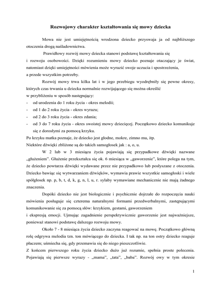 Rozwojowy charakter kształtowania się mowy dziecka Mowa nie jest umiejętnością wrodzona dziecko przyswaja ja od najbliższego otoczenia drogą naśladownictwa. Prawidłowy rozwój mowy dziecka stanowi podstawę kształtowania się i rozwoju osobowości. Dzięki rozumieniu mowy dziecko poznaje otaczający je świat, natomiast dzięki umiejętności mówienia może wyrazić swoje uczucia i spostrzeżenia, a przede wszystkim potrzeby. Rozwój mowy trwa kilka lat i w jego przebiegu wyodrębniły się pewne okresy, których czas trwania u dziecka normalnie rozwijającego się można określić w przybliżeniu w sposób następujący: - od urodzenia do 1 roku życia - okres melodii; - od 1 do 2 roku życia - okres wyrazu; - od 2 do 3 roku życia - okres zdania; - od 3 do 7 roku życia - okres swoistej mowy dziecięcej. Początkowo dziecko komunikuje się z dorosłymi za pomocą krzyku. Po krzyku matka poznaje, że dziecko jest głodne, mokre, zimno mu, itp. Niektóre dźwięki zbliżone są do takich samogłosek jak : a, o, u. W 2 lub w 3 miesiącu życia pojawiają się przypadkowe dźwięki nazwane „głużeniem”. Głużenie przekształca się ok. 6 miesiąca w „gaworzenie”, które polega na tym, że dziecko powtarza dźwięki wydawane przez nie przypadkowo lub posłyszane z otoczenia. Dziecko bawiąc się wytwarzaniem dźwięków, wymawia prawie wszystkie samogłoski i wiele spółgłosek np. p, b, t, d, k, g, n, l, u, r. sylaby wymawiane mechanicznie nie mają żadnego znaczenia. Dopóki dziecko nie jest biologicznie i psychicznie dojrzałe do rozpoczęcia nauki mówienia posługuje się czterema naturalnymi formami przedwerbalnymi, zastępującymi komunikowanie się za pomocą słów: krzykiem, gestami, gaworzeniem i ekspresją emocji. Ujmując zagadnienie perspektywicznie gaworzenie jest najważniejsze, ponieważ stanowi podstawę dalszego rozwoju mowy. Około 7 - 8 miesiąca życia dziecko zaczyna reagować na mowę. Początkowo główną rolę odgrywa melodia tzn. ton mówiącego do dziecka. I tak np. na ton ostry dziecko reaguje płaczem; uśmiecha się, gdy przemawia się do niego pieszczotliwie. Z końcem pierwszego roku życia dziecko dużo już rozumie, spełnia proste polecenia. Pojawiają się pierwsze wyrazy - „mama”, „tata”, „baba”. Rozwój owy w tym okresie 1 postępuje równolegle z rozwojem fizycznym; fazie głużenia odpowiada umiejętność unoszenia głowy, gaworzeniu - umiejętność siadania, pierwszym wyrazom - pozycja pionowa i stawanie. Na przełomie 1 i 2 roku życia rozpoczyna się okres rozwoju mowy właściwej, w którym wyodrębnia się zazwyczaj jeszcze stadia np. stadium wyrazu (1-2 rok życia), później stadium zdania (2-3 rok życia). Istotnym osiągnięciem rozwojowym dziecka w wieku poniemowlęcym jest opanowanie elementarnego zasobu słów oraz podstaw systemu gramatycznego języka ojczystego. Z istoty porozumiewania się ze swoim otoczeniem głównie za pomocą ruchów ekspresyjnych - gestów i mimiki, którym towarzyszą niekiedy dźwięki, pozbawione określonego znaczenia (głużenie i gaworzenie). W okresie wyrazu dziecko używa już właściwie wszystkich samogłosek, prócz nosowych. Pojawia się najczęściej samogłoska „a”, później „u”, „i”, ze spółgłosek wymawia: „p”, „b”, „m”, „t”, „d”, „n”, „k”, „ś”, czasem „ć”. Są to takie wyrazy jak: „mama”, „tata”, „papu”, „da”. Pierwsze wyrazy nie są kojarzone z żadnym desygnatem. W mowie dziecka pojawiają się głoski stopniowo i nabycie umiejętności wytwarzania wszystkich głosek trwa długo, bo aż parę lat. W wieku 14-15 miesięcy dziecko zaczyna wypowiadać więcej pojedynczych wyrazów. Związane jest to z rozwojem jego uwagi, spostrzegawczości, pamięci, czyli z rozwojem umysłowym oraz fizycznym (dziecko zaczyna wtedy chodzić) Rozwija się również zdolność różnicowania dźwięków mowy słuchem, czyli słuch fonematyczny. Uważa się, że u dziewczynek początki mowy są wcześniejsze niż i chłopców, ponieważ dojrzewanie organizmu żeńskiego następuje szybciej. Początkowo każde słowo kojarzy się ściśle z konkretnym przedmiotem, np. wyraz lalka użyty dla oznaczenia jakiejś innej lalki niż ta, którą dziecko dotychczas znało może być przez nie niezrozumiały. Większość dzieci półtorarocznych potrafi już spełniać proste polecenia, można też zaobserwować u nich początki mowy spontanicznej. Wyrazy zaczynają zastępować gesty, którymi dziecko posługiwało się dotychczas wyrażając swoje życzenia. Wyraz pełni funkcję całej wypowiedzi. Dziecko zaczyna używać słów dla oznaczenia przedmiotów, które są nieobecne. Przy końcu drugiego roku życia dziecko próbuje wypowiadać swoje doznania. Z końcem tego okresu słownik dziecka zawiera kilkadziesiąt wyrazów, których większość stanowią rzeczowniki używane w mianowniku 2 i będące nazwami przedmiotów z najbliższego otoczenia dziecka. Kolejność sylab w wyrazie często bywa jeszcze przestawiana, a jeśli jest zachowana, to poszczególne głoski ulegają różnym modyfikacjom lub są zastępowane innymi. Badania nad językiem małych dzieci wykazały, że pierwsze słowa odnoszą się do obiektów pozostających w ruchu, a więc osób, zwierząt i pojazdów. Dla dziecka bowiem najbardziej interesujące jest dzianie się. Do opisania swego świata małe dziecko używa przede wszystkim rzeczowników (50 %), a następnie dochodzą czasowniki i zaimki. Niewiele jest w wypowiedziach (i nie tylko) przymiotników i innych części mowy służących do określenia właściwości rzeczy i zjawisk. Od 2-3 roku życia dziecko wchodzi w okres zdania. Zaczyna rozumieć mowę rodziców dotyczącą członków rodziny, przedmiotów interesujących je lub aktualnych wydarzeń. Pierwsze zdania są dwuwyrazowe i wyłącznie twierdzące. Dosyć szybko jednak pojawiają się proste zdania pytające i rozkazujące.