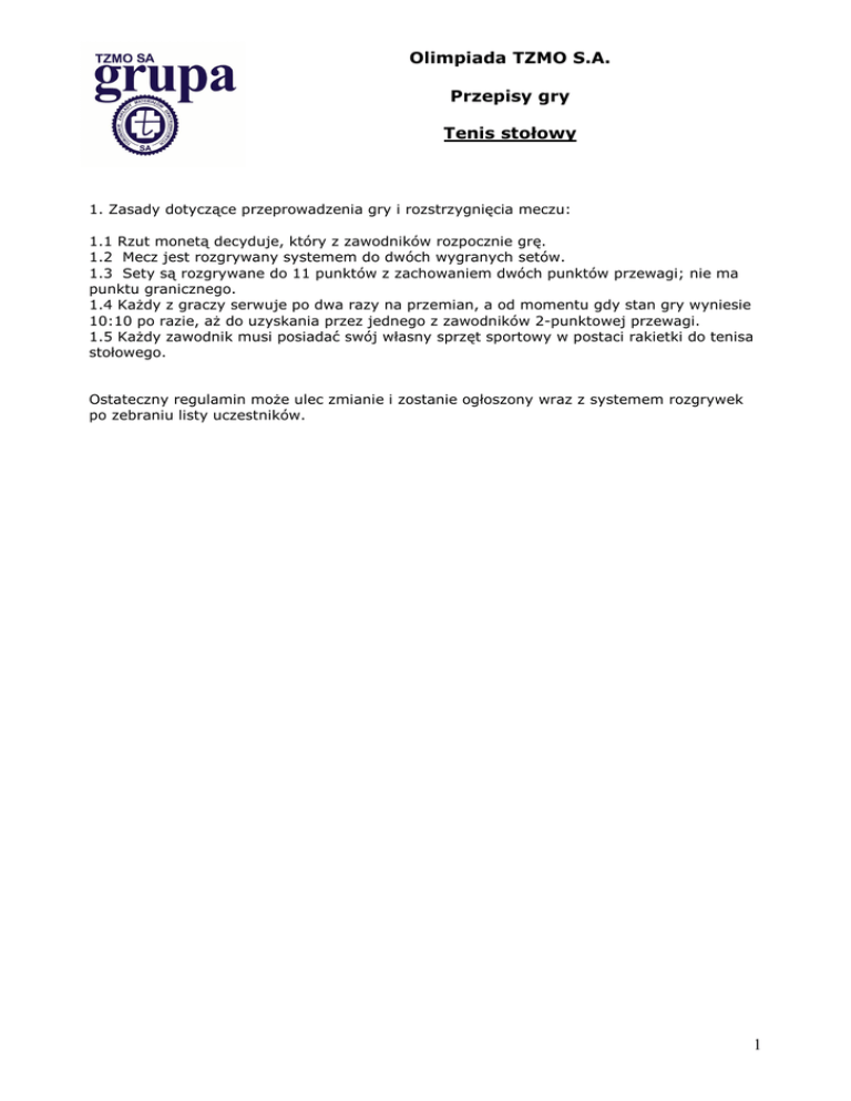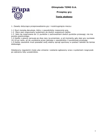 Olimpiada TZMO S.A. Przepisy gry Tenis stołowy 1. Zasady dotyczące przeprowadzenia gry i rozstrzygnięcia meczu: 1.1 Rzut monetą decyduje, który z zawodników rozpocznie grę. 1.2 Mecz jest rozgrywany systemem do dwóch wygranych setów. 1.3 Sety są rozgrywane do 11 punktów z zachowaniem dwóch punktów przewagi; nie ma punktu granicznego. 1.4 Każdy z graczy serwuje po dwa razy na przemian, a od momentu gdy stan gry wyniesie 10:10 po razie, aż do uzyskania przez jednego z zawodników 2-punktowej przewagi. 1.5 Każdy zawodnik musi posiadać swój własny sprzęt sportowy w postaci rakietki do tenisa stołowego. Ostateczny regulamin może ulec zmianie i zostanie ogłoszony wraz z systemem rozgrywek po zebraniu listy uczestników. 1