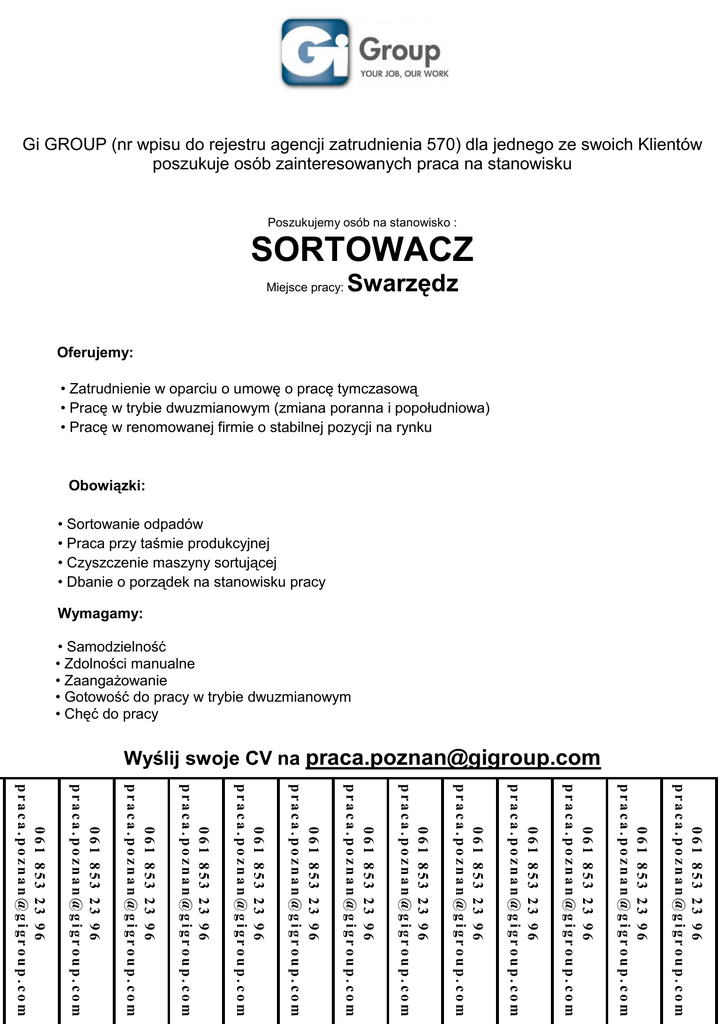 Gi GROUP (nr wpisu do rejestru agencji zatrudnienia 570) dla jednego ze swoich Klientów poszukuje osób zainteresowanych praca na stanowisku Poszukujemy osób na stanowisko : SORTOWACZ Miejsce pracy: Swarzędz Oferujemy: • Zatrudnienie w oparciu o umowę o pracę tymczasową • Pracę w trybie dwuzmianowym (zmiana poranna i popołudniowa) • Pracę w renomowanej firmie o stabilnej pozycji na rynku Obowiązki: • Sortowanie odpadów • Praca przy taśmie produkcyjnej • Czyszczenie maszyny sortującej • Dbanie o porządek na stanowisku pracy Wymagamy: • Samodzielność • Zdolności manualne • Zaangażowanie • Gotowość do pracy w trybie dwuzmianowym • Chęć do pracy Wyślij swoje CV na [email protected] 061 853 23 96 [email protected] 061 853 23 96 [email protected] 061 853 23 96 [email protected] 061 853 23 96 [email protected] 061 853 23 96 [email protected] 061 853 23 96 [email protected] 061 853 23 96 [email protected] 061 853 23 96 [email protected] 061 853 23 96 [email protected] 061 853 23 96 [email protected] 061 853 23 96 [email protected] 061 853 23 96 [email protected] 061 853 23 96 [email protected]