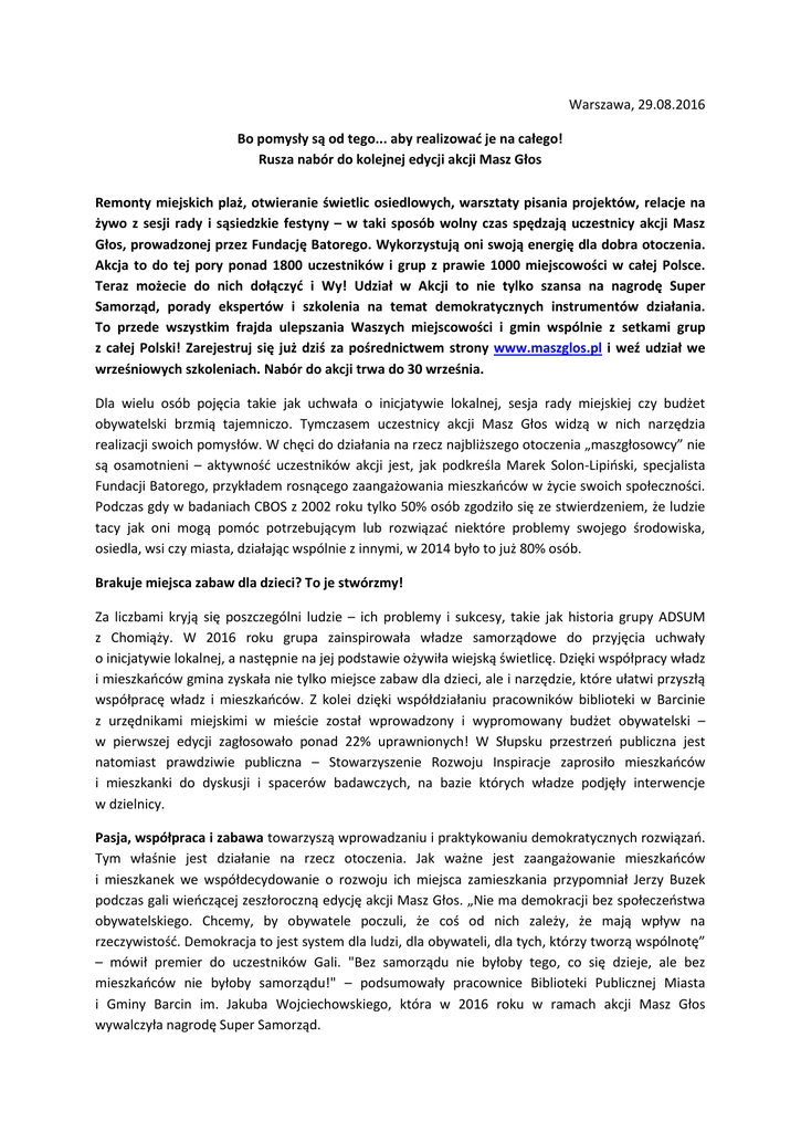 Warszawa, 29.08.2016 Bo pomysły są od tego... aby realizować je na całego! Rusza nabór do kolejnej edycji akcji Masz Głos Remonty miejskich plaż, otwieranie świetlic osiedlowych, warsztaty pisania projektów, relacje na żywo z sesji rady i sąsiedzkie festyny – w taki sposób wolny czas spędzają uczestnicy akcji Masz Głos, prowadzonej przez Fundację Batorego. Wykorzystują oni swoją energię dla dobra otoczenia. Akcja to do tej pory ponad 1800 uczestników i grup z prawie 1000 miejscowości w całej Polsce. Teraz możecie do nich dołączyć i Wy! Udział w Akcji to nie tylko szansa na nagrodę Super Samorząd, porady ekspertów i szkolenia na temat demokratycznych instrumentów działania. To przede wszystkim frajda ulepszania Waszych miejscowości i gmin wspólnie z setkami grup z całej Polski! Zarejestruj się już dziś za pośrednictwem strony www.maszglos.pl i weź udział we wrześniowych szkoleniach. Nabór do akcji trwa do 30 września. Dla wielu osób pojęcia takie jak uchwała o inicjatywie lokalnej, sesja rady miejskiej czy budżet obywatelski brzmią tajemniczo. Tymczasem uczestnicy akcji Masz Głos widzą w nich narzędzia realizacji swoich pomysłów. W chęci do działania na rzecz najbliższego otoczenia „maszgłosowcy” nie są osamotnieni – aktywność uczestników akcji jest, jak podkreśla Marek Solon-Lipiński, specjalista Fundacji Batorego, przykładem rosnącego zaangażowania mieszkańców w życie swoich społeczności. Podczas gdy w badaniach CBOS z 2002 roku tylko 50% osób zgodziło się ze stwierdzeniem, że ludzie tacy jak oni mogą pomóc potrzebującym lub rozwiązać niektóre problemy swojego środowiska, osiedla, wsi czy miasta, działając wspólnie z innymi, w 2014 było to już 80% osób. Brakuje miejsca zabaw dla dzieci? To je stwórzmy! Za liczbami kryją się poszczególni ludzie – ich problemy i sukcesy, takie jak historia grupy ADSUM z Chomiąży. W 2016 roku grupa zainspirowała władze samorządowe do przyjęcia uchwały o inicjatywie lokalnej, a następnie na jej podstawie ożywiła wiejską świetlicę. Dzięki współpracy władz i mieszkańców gmina zyskała nie tylko miejsce zabaw dla dzieci, ale i narzędzie, które ułatwi przyszłą współpracę władz i mieszkańców. Z kolei dzięki współdziałaniu pracowników biblioteki w Barcinie z urzędnikami miejskimi w mieście został wprowadzony i wypromowany budżet obywatelski – w pierwszej edycji zagłosowało ponad 22% uprawnionych! W Słupsku przestrzeń publiczna jest natomiast prawdziwie publiczna – Stowarzyszenie Rozwoju Inspiracje zaprosiło mieszkańców i mieszkanki do dyskusji i spacerów badawczych, na bazie których władze podjęły interwencje w dzielnicy. Pasja, współpraca i zabawa towarzyszą wprowadzaniu i praktykowaniu demokratycznych rozwiązań. Tym właśnie jest działanie na rzecz otoczenia. Jak ważne jest zaangażowanie mieszkańców i mieszkanek we współdecydowanie o rozwoju ich miejsca zamieszkania przypomniał Jerzy Buzek podczas gali wieńczącej zeszłoroczną edycję akcji Masz Głos. „Nie ma demokracji bez społeczeństwa obywatelskiego. Chcemy, by obywatele poczuli, że coś od nich zależy, że mają wpływ na rzeczywistość. Demokracja to jest system dla ludzi, dla obywateli, dla tych, którzy tworzą wspólnotę” – mówił premier do uczestników Gali. "Bez samorządu nie byłoby tego, co się dzieje, ale bez mieszkańców nie byłoby samorządu!" – podsumowały pracownice Biblioteki Publicznej Miasta i Gminy Barcin im. Jakuba Wojciechowskiego, która w 2016 roku w ramach akcji Masz Głos wywalczyła nagrodę Super Samorząd. Co daje udział w akcji Masz Głos? Bieżące wsparcie doświadczonego zespołu, np. w planowaniu i realizacji działań Dostęp do wiedzy: porady eksperckie, darmowe publikacje, udział w szkoleniach (np. o angażowaniu mieszkańców do działania lub prowadzeniu diagnozy lokalnej) Wymianę doświadczeń z uczestnikami akcji z całej Polski Wzmocnienie pozycji i budowanie prestiżu w środowisku lokalnym, w relacjach z mieszkańcami i władzami oraz w kontaktach z mediami Bezpłatne materiały edukacyjne i promocyjne Szansę na zdobycie minigrantu Szansę na zdobycie nagrody Super Samorząd i przyjazd na uroczystą galę w Warszawie Do udziału w akcji Masz Głos zaproszeni są wszyscy mieszkańcy i mieszkanki – grupy nieformalne, organizacje pozarządowe, instytucje publiczne, uniwersytety trzeciego wieku, rady młodzieżowe, biblioteki, szkoły, lokalne gazety i portale informacyjne. Udział w akcji jest bezpłatny. Aby zacząć działać należy do 30 września zarejestrować się na stronie www.maszglos.pl. Już we wrześniu wszyscy zainteresowani mogą wziąć udział w organizowanych w całej Polsce bezpłatnych szkoleniach. Organizatorem akcji Masz Głos jest Fundacja im. Stefana Batorego. Partnerzy edycji 2016/2017: Fundacja Aktywności Lokalnej, Stowarzyszenie Aktywności Obywatelskiej Bona Fides, Stowarzyszenie Homo Faber, Stowarzyszenie POLITES. Kontakt: Zofia Nawrocka Fundacja im. Stefana Batorego program Masz Głos [email protected] tel. 22 536 02 62 *** O akcji Masz Głos: Prowadzona przez Fundację im. Stefana Batorego akcja Masz Głos wspiera mieszkańców i mieszkanki z całej Polski w działaniu na rzecz najbliższego otoczenia, we współpracy z władzami lokalnymi. Przypomina, że mieszkańcy mają prawo decydować o tym, co dzieje sie wokół nich, bo samorząd to nie tylko władze, lecz wszyscy mieszkańcy i mieszkanki. Od 2002 roku udział w akcji wzięło ponad 1800 grup, organizacji i instytucji z prawie 1000 gmin w całej Polsce.