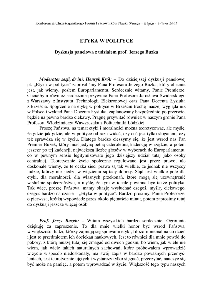 Konferencja Chrześcijańskiego Forum Pracowników Nauki N auka - E tyka - W iara 2005 ETYKA W POLITYCE Dyskusja panelowa z udziałem prof. Jerzego Buzka Moderator sesji, dr inż. Henryk Król: – Do dzisiejszej dyskusji panelowej pt. „Etyka w polityce” zaprosiliśmy Pana Profesora Jerzego Buzka, który obecnie jest, jak wiemy, posłem Europarlamentu. Serdecznie witamy, Panie Premierze. Chciałbym również serdecznie przywitać Pana Profesora Jarosława Świderskiego z Warszawy z Instytutu Technologii Elektronowej oraz Pana Docenta Łysiuka z Brześcia. Spojrzenie na etykę w polityce w Brześciu trochę inaczej wygląda niż w Polsce i wykład Pana Docenta Łysiuka, zaplanowany bezpośrednio po przerwie, będzie na pewno bardzo ciekawy. Pragnę przywitać również w naszym gronie Pana Profesora Włodzimierza Wawszczaka z Politechniki Łódzkiej. Proszę Państwa, na temat etyki i moralności można teoretyzować, ale myślę, że gdzie jak gdzie, ale w polityce od razu widać, czy coś jest tylko sloganem, czy też sprawdza się w życiu. Dlatego bardzo cieszymy się, że jest wśród nas Pan Premier Buzek, który miał jedyną pełną czteroletnią kadencję w rządzie, a potem jeszcze po tej kadencji, największą liczbę głosów w wyborach do Europarlamentu, co w pewnym sensie legitymizowało jego dzisiejszy udział tutaj jako osoby centralnej. Teoretycznie życie społeczne regulowane jest przez prawo, ale doskonale wiemy, że te oczka sieci prawa są tak wielkie, że jednak nie wszyscy ludzie, którzy nie siedzą w więzieniu są tacy dobrzy. Stąd jest wielkie pole dla etyki, dla moralności, dla własnych przekonań, które mogą się uzewnętrznić w służbie społeczeństwu, a myślę, że tym w ideale powinna być także polityka. Tak więc, proszę Państwa, mamy okazję wysłuchać czegoś, myślę, ciekawego, czegoś bardzo na czasie – „Etyka w polityce”. Bardzo prosimy, Panie Profesorze, o pierwszą, krótką wypowiedź przez około piętnaście minut, potem zaprosimy tutaj do dyskusji jeszcze więcej osób. Prof. Jerzy Buzek: – Witam wszystkich bardzo serdecznie. Ogromnie dziękuję za zaproszenie. To dla mnie wielki honor być wśród Państwa, w większości ludzi, którzy zajmują się sprawami etyki, filozofii niemal na co dzień i jest to przedmiotem ich dociekań naukowych. Jest to również dla mnie powód do pokory, z którą muszę tutaj się zmagać od dwóch godzin, bo wiem, jak wiele nie wiem, jak wiele takich naturalnych zachowań, które próbowałem wprowadzić w życie w sposób niedoskonały, ma swój zapis w bardzo poważnych przemyśleniach, jest teoretycznie ujętych i wystarczy tylko sięgnąć, przeczytać, nauczyć się być może na pamięć, a potem wprowadzać w życie. Większość tego typu naszych działań i zachowań, szczególnie w polityce, wykonujemy w sposób intuicyjny. Jeśli więc w tej intuicji i działaniach nie błądzimy, to pewnie tylko dlatego, że gdzieś tam przed dziesięcioleciami wynieśliśmy z domu i z kościoła, od starszych i od tych, którzy nas wychowywali, pewien zasób podstawowych prawd i sposobów spoglądania na życie, które nas prowadzą przez cały czas. Nie chciałbym tu nadużywać słowa Biblia, Pismo Święte, bo o tym pamiętamy wszyscy. W końcu nasi rodzice, duchowni, nasi nauczyciele też się na tym Piśmie wzorowali. Tak więc wszystko sprowadza się w gruncie rzeczy do tego jednego. Pan profesor Karol Toeplitz powiedział o wielu rzeczach (właściwie mógłbym się tutaj z wielkim szacunkiem pochylić nad wieloma słowami, które powiedział), niejako wyjmując mi z ust wiele tematów np. problem rozwiązywania konfliktów. Postaram się tutaj w pewien niedoskonały sposób powiedzieć parę słów na ten temat (może więcej powiem w dyskusji), bo myślałem, że będę miał czas na wykład, czyli półtorej godziny. Rozumiem, że nikt nie wytrzymałby aż półtorej godziny, więc na przemówienie człowieka, który w gruncie rzeczy jest politykiem, przeznaczone jest jedynie 15 minut i postaram się zmieścić w czasie. Proszę Państwa, moralność w polityce, moralność a polityka, szczególnie teraz te dwa pojęcia wydają się być ze sobą sprzeczne. W ostatnim okresie obserwujemy to bardzo często. Istnieje takie stwierdzenie sformułowane przed wielu laty przez Maxa Webera, które mówi, że polityków zobowiązują nie tyle osobiste przekonania, co odpowiedzialność za skutki podjętych działań. To powinno rozstrzygać wiele wątpliwości i powinno nawet usprawiedliwiać niektóre niemoralne zachowania, a jednak wierność własnemu sumieniu i przekonaniom, które kiedyś ku działalności publicznej nas wezwały, należy uznać za wartość fundamentalną. Bez nich bowiem polityka staje się cyniczną grą, a w końcu także nasze zaangażowanie może być przekleństwem dla naszych współpracowników, naszych bliskich, wreszcie dla nas samych. Myślę, że do związania się ze światem wartości zobowiązują nas także biografie. Akurat w ostatnich czasach wielu polityków przeszło drogę dysydencką w naszym kraju, gdzie wolność, a przez pewien okres czasu także wyznawanie Chrystusa były zajęciem trudnym i ryzykownym. Była to droga sumienia, droga poprzez prawdę i okazała się ona kruszyć mury i więzienia. Często mówiono „siła bezsilnych”. Ostatecznie opierała się ona na kodeksie moralnym. Jeśli powiemy o zwycięstwach Gandhiego, czy Martina Luthera Kinga, czy w naszym świecie, obojętnie jak bardzo uznajemy, że jest ułomny – zwycięstwa moralne Vaclava Havla czy Lecha Wałęsy (niezależnie od tego, powtarzam, jak sami ludzie są ułomni), to były to jednak zwycięstwa moralne, zwycięstwa czegoś, co tkwi głęboko w nas i były dokonane bez użycia siły. Ta przeszłość zobowiązuje. Równocześnie istnieje znudzenie polityczną retoryką, odwoływaniem się do świata wartości przez polityków. Jest to znudzenie naturalne. Wo
