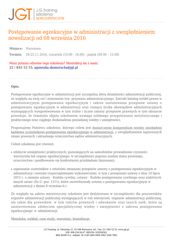 Postępowanie egzekucyjne w administracji z uwzględnieniem nowelizacji od 08 września 2016 Miejsce: Warszawa Termin: 24-25.11.2016, czwartek (10.00 - 16.00) - piątek (09.00 – 15.00) Masz pytania odnośne tego szkolenia? Skontaktuj się z nami: 22 / 845 52 53, [email protected] Opis: Postępowanie egzekucyjne w administracji jest szczególną sferą działalności administracji publicznej, ze względu na swój cel i stosowanie tzw. przymusu administracyjnego. Szeroki katalog źródeł prawa w administracyjnym postępowaniu egzekucyjnym i zakres zastosowania przepisów ustawy o postępowaniu egzekucyjnym w administracji oraz rosnąca liczba obowiązków administracyjnych wymagających wyegzekwowania w tym trybie i liczne zmiany przepisów prawnych w tym obszarze powoduje, że tematyka objęta szkoleniem wymaga solidnego przygotowania merytorycznego i praktycznego oraz ciągłego doskonalenia posiadanej wiedzy i umiejętności. Proponujemy Państwu szkolenie, którego celem jest dostarczenie kompendium wiedzy niezbędnej każdemu uczestnikowi postępowania egzekucyjnego w administracji, z uwzględnieniem najnowszych zmian prawnych i aktualnego orzecznictwa sądów administracyjnych. Celem szkolenia jest również: ● ● zdobycie umiejętności praktycznych, pozwalających na samodzielne prowadzenie czynności wierzyciela lub organu egzekucyjnego, w szczególności poprzez analizę stanu prawnego, orzecznictwa i posiłkowanie się konkretnymi przykładami (kazusami), zapoznanie uczestników z ostatnimi zmianami przepisów ustawy o postępowaniu egzekucyjnym w administracji i nowymi rozporządzeniami wykonawczymi, w tym z przepisami ustawy z dnia 10 lipca 2015 r. o zmianie ustawy - Kodeks cywilny, ustawy - Kodeks postępowania cywilnego oraz niektórych innych ustaw (Dz.U. poz. 1311), które znowelizowały ustawę o postępowaniu egzekucyjnym w administracji z dniem 8 września b.r. Ze względu na zakres merytoryczny szkolenie jest dedykowane w szczególności dla pracowników organów administracji publicznej występujących w roli wierzycieli, organów administracji publicznej, ale także dla prawników, w tym radców prawnych i adwokatów oraz innych osób, które są zainteresowane zdobyciem specjalistycznej wiedzy i umiejętności z zakresu postępowania egzekucyjnego w administracji. Metodyka: wykład, case study, warsztaty, konsultacje. J.G.Training, ul. Olesińska 21, 02-548 Warszawa, tel. / fax: 22 / 845 52 53, www.jgt.pl NIP: 898-150-56-07, REGON: 932958345, BRE BANK S.A - mBank: 38 1140 2004 0000 3002 3360 7883 Po zakończeniu omawiania poszczególnych punktów programu szkolenia, odbywają się warsztaty, omawiane są przypadki a także wykładowca wyjaśnia wątpliwości i odpowiada na pytania uczestników. Program: DZIEŃ I 1. Zagadnienia ogólne - istota postępowania egzekucyjnego w administracji: ❍ ❍ ❍ pojęcie administracyjnego postępowania egzekucyjnego a egzekucji administracyjnej, źródła prawa w postępowaniu egzekucyjnym w administracji, zasady ogólne postępowania egzekucyjnego w administracji. 2. Zakres przedmiotowy postępowania egzekucyjnego w administracji: ❍ ❍ ❍ obowiązek administracyjny i jego rodzaje, wymagalność obowiązku administracyjnego, w tym wykonalność decyzji administracyjnej, wyłączenia spod egzekucji administracyjnej. 3. Podmioty postępowania egzekucyjnego w administracji: ❍ ❍ wierzyciel, zobowiązany, organ egzekucyjny i ich właściwość, organy nadzoru w postępowaniu egzekucyjnym w administracji. 4. Przebieg postępowania egzekucyjnego w administracji: ❍ ❍ stadia postępowania egzekucyjnego w administracji, termin wszczęcia egzekucji administracyjnej. 5. Czynności wierzyciela zmierzające do wszczęcia postępowania egzekucyjnego w administracji: ❍ ❍ ❍ ❍ ❍ ustalenie wymagalności obowiązku administracyjnego, upomnienie, formy działań informacyjnych wobec zobowiązanego, skarga na bezczynność wierzyciela, wystawienie tytułu wykonawczego – w tym jego wymagana treść i forma przesłania oraz obowiązek aktualizacji tytułu wykonawczego. 6. Wszczęcie i przebieg egzekucji administracyjnej: ❍ ❍ ❍ ❍ termin wszczęcia egzekucji administracyjnej, badanie dopuszczalności egzekucji przez organ egzekucyjny, przyczyny nieprzystąpienia do egzekucji, uprawnienia organu egzekucyjnego i egzekutora w ramach przeprowadzania egzekucji J.G.Training, ul. Olesińska 21, 02-548 Warszawa, tel. / fax: 22 / 845 52 53, www.jgt.pl NIP: 898-150-56-07, REGON: 932958345, BRE BANK S.A - mBank: 38 1140 2004 0000 3002 3360 7883 administracyjnej. 7. Zarzuty w sprawie prowadzenia postępowania egzekucyjnego w administracji: ❍ ❍ ❍ termin wniesienia, przesłanki i tryb rozpatrzenia, konsekwencje uznania zarzutów. DZIEŃ II 1. Zawieszenie postępowania egzekucyjnego w administracji: ❍ ❍ ❍ ❍ przesłanki, skutki zawieszenia forma, podjęcie na nowo zawieszonego postępowania egzekucyjnego. 2. Umorzenie postępowania egzekucyjnego w administracji: ❍ ❍ ❍ przesłanki, skutki prawne, forma. wykład, case study, warsztaty, konsultacje. 3. Zbieg egzekucji sądowej i administracyjnej: ❍ ❍ ❍ przesłanki zbiegu, tryb postępowania, obowiązki organu egzekucyjnego, który przejął prowadzenie łącznie egzekucji, z uwzględnieniem zmian obowiązujących od 8 września 2016 r. 4. Analiza wybranych środków egzekucyjnych należności pieniężnych: ❍ ❍ ❍ ❍ egzekucja z pieniędzy, z wynagrodzenia za pracę, ze świadczeń z zaopatrzenia emerytalnego oraz ubezpieczenia społecznego, a także z renty socjalnej, z rachunków bankowych, z ruchomości i z nieruchomości. 5. Środki egzekucyjne należności niepieniężnych: ❍ ❍ ❍ ❍ ❍ grzywna w celu przymuszenia, wykonanie zastępcze, odebranie rzeczy ruchomej, odebranie nieruchomości, opróżnienie lokali i innych pomieszczeń, przymus bezpośredni. 6. Koszty postępowania egzekucyjnego w administracji: J.G.Training, ul. Olesińska 21, 02