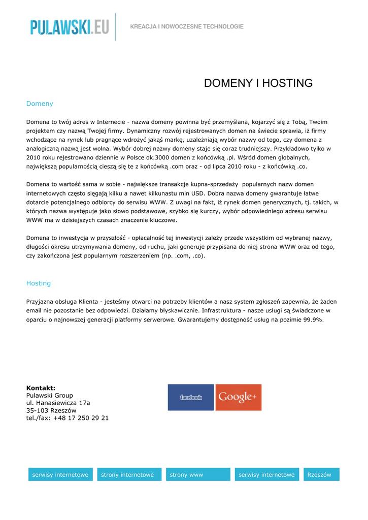 DOMENY I HOSTING Domeny Domena to twój adres w Internecie - nazwa domeny powinna być przemyślana, kojarzyć się z Tobą, Twoim projektem czy nazwą Twojej firmy. Dynamiczny rozwój rejestrowanych domen na świecie sprawia, iż firmy wchodzące na rynek lub pragnące wdrożyć jakąś markę, uzależniają wybór nazwy od tego, czy domena z analogiczną nazwą jest wolna. Wybór dobrej nazwy domeny staje się coraz trudniejszy. Przykładowo tylko w 2010 roku rejestrowano dziennie w Polsce ok.3000 domen z końcówką .pl. Wśród domen globalnych, największą popularnością cieszą się te z końcówką .com oraz - od lipca 2010 roku - z końcówką .co. Domena to wartość sama w sobie - największe transakcje kupna-sprzedaży popularnych nazw domen internetowych często sięgają kilku a nawet kilkunastu mln USD. Dobra nazwa domeny gwarantuje łatwe dotarcie potencjalnego odbiorcy do serwisu WWW. Z uwagi na fakt, iż rynek domen generycznych, tj. takich, w których nazwa występuje jako słowo podstawowe, szybko się kurczy, wybór odpowiedniego adresu serwisu WWW ma w dzisiejszych czasach znaczenie kluczowe. Domena to inwestycja w przyszłość - opłacalność tej inwestycji zależy przede wszystkim od wybranej nazwy, długości okresu utrzymywania domeny, od ruchu, jaki generuje przypisana do niej strona WWW oraz od tego, czy zakończona jest popularnym rozszerzeniem (np. .com, .co). Hosting Przyjazna obsługa Klienta - jesteśmy otwarci na potrzeby klientów a nasz system zgłoszeń zapewnia, że żaden email nie pozostanie bez odpowiedzi. Działamy błyskawicznie. Infrastruktura - nasze usługi są świadczone w oparciu o najnowszej generacji platformy serwerowe. Gwarantujemy dostępność usług na pozimie 99.9%. Kontakt: Pulawski Group ul. Hanasiewicza 17a 35-103 Rzeszów tel./fax: +48 17 250 29 21 serwisy internetowe strony internetowe strony www serwisy internetowe Rzeszów