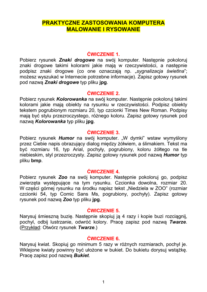 PRAKTYCZNE ZASTOSOWANIA KOMPUTERA MALOWANIE I RYSOWANIE ĆWICZENIE 1. Pobierz rysunek Znaki drogowe na swój komputer. Następnie pokoloruj znaki drogowe takimi kolorami jakie mają w rzeczywistości, a następnie podpisz znaki drogowe (co one oznaczają np. „sygnalizacja świetlna”; możesz wyszukać w Internecie potrzebne informacje). Zapisz gotowy rysunek pod nazwą Znaki drogowe typ pliku jpg. ĆWICZENIE 2. Pobierz rysunek Kolorowanka na swój komputer. Następnie pokoloruj takimi kolorami jakie mają obiekty na rysunku w rzeczywistości. Podpisz obiekty tekstem pogrubionym rozmiaru 20, typ czcionki Times New Roman. Podpisy mają być stylu przezroczystego, różnego koloru. Zapisz gotowy rysunek pod nazwą Kolorowanka typ pliku jpg. ĆWICZENIE 3. Pobierz rysunek Humor na swój komputer. „W dymki” wstaw wymyślony przez Ciebie napis obrazujący dialog między żółwiem, a ślimakiem. Tekst ma być rozmiaru 16, typ Arial, pochyły, pogrubiony, koloru żółtego na tle niebieskim, styl przezroczysty. Zapisz gotowy rysunek pod nazwą Humor typ pliku bmp. ĆWICZENIE 4. Pobierz rysunek Zoo na swój komputer. Następnie pokoloruj go, podpisz zwierzęta występujące na tym rysunku. Czcionka dowolna, rozmiar 20. W części górnej rysunku na środku napisz tekst „Niedziela w ZOO” (rozmiar czcionki 54, typ Comic Sans Ms, pogrubiony, pochyły). Zapisz gotowy rysunek pod nazwą Zoo typ pliku jpg. ĆWICZENIE 5. Narysuj śmieszną buzię. Następnie skopiuj ją 4 razy i kopie buzi rozciągnij, pochyl, odbij lustrzanie, odwróć kolory. Pracę zapisz pod nazwą Twarze. (Przykład: Otwórz rysunek Twarze.) ĆWICZENIE 6. Narysuj kwiat. Skopiuj go minimum 5 razy w różnych rozmiarach, pochyl je. Wklejone kwiaty powinny być ułożone w bukiet. Do bukietu dorysuj wstążkę. Pracę zapisz pod nazwą Bukiet. 1 ĆWICZENIE 7. Kartkę o wymiarach 18 cm x 18 cm podziel na cztery równe części. Następnie każdą z części wypełnij innym kolorem. Wykorzystując prostokąt, elipsę, wielokąt, narysuj w każdej z nich inną figurę geometryczną. W części 3 – sześciokąt, w części 4 – pięciokąt. Pracę zapisz pod nazwą Figury 1. ĆWICZENIE 8. Otwórz rysunek Figury 2. Wykonaj identyczny rysunek. 10 kwadratów o boku 70 pikseli – kwadrat podziel na 4 małe kwadraciki i wypełnij kolorem białym i czerwonym. 10 kół o średnicy 80 pikseli – podziel koło na trzy części i wypełnij kolorem zielonym, białym i czerwonym. 10 kwadratów o boku 70 pikseli – podziel go rysując jego przekątne – wypełnij powstałe 4 trójkąty dowolnym kolorem. 10 kół o średnicy 80 pikseli – podziel koło na trzy części i wypełnij kolorem czarnym, żółtym, czerwonym. 10 kwadratów o boku 70 pikseli – podziel na 3 równe części i wypełnij kolorami: żółty, zielony i czerwony. Pracę zapisz pod nazwą Figury 2. 2